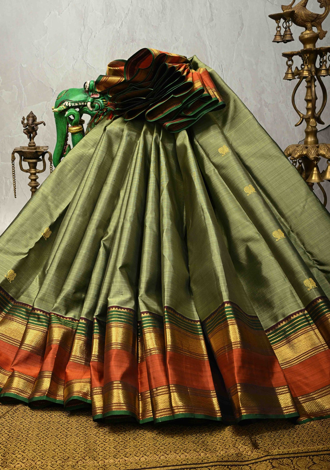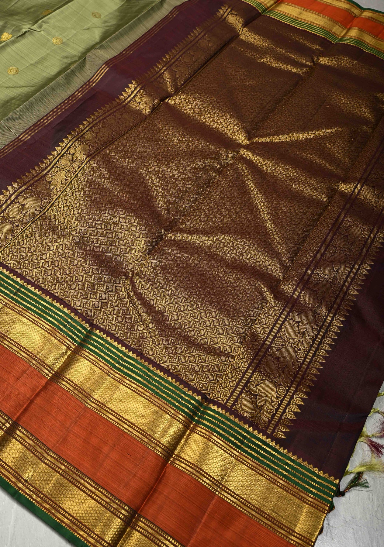 Sage Green Pure Kanjivaram Silk saree with Zari Buttas and Contrast Zari Border| SILK MARK CERTIFIED