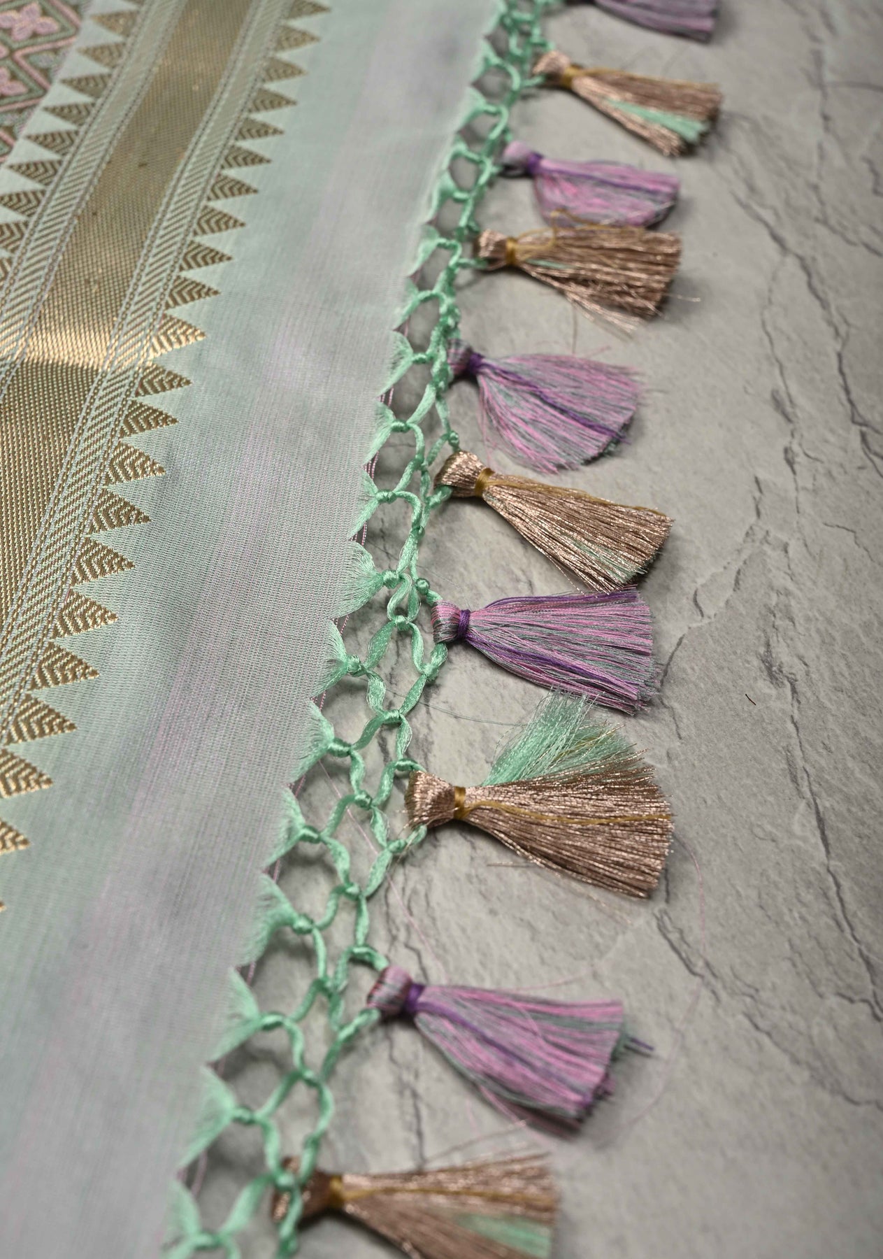 This saree is ready to wear with fall and pico done. Handmade silk tassels adorn the pallu and add more grace to it. An unstitched blouse fabric is included.