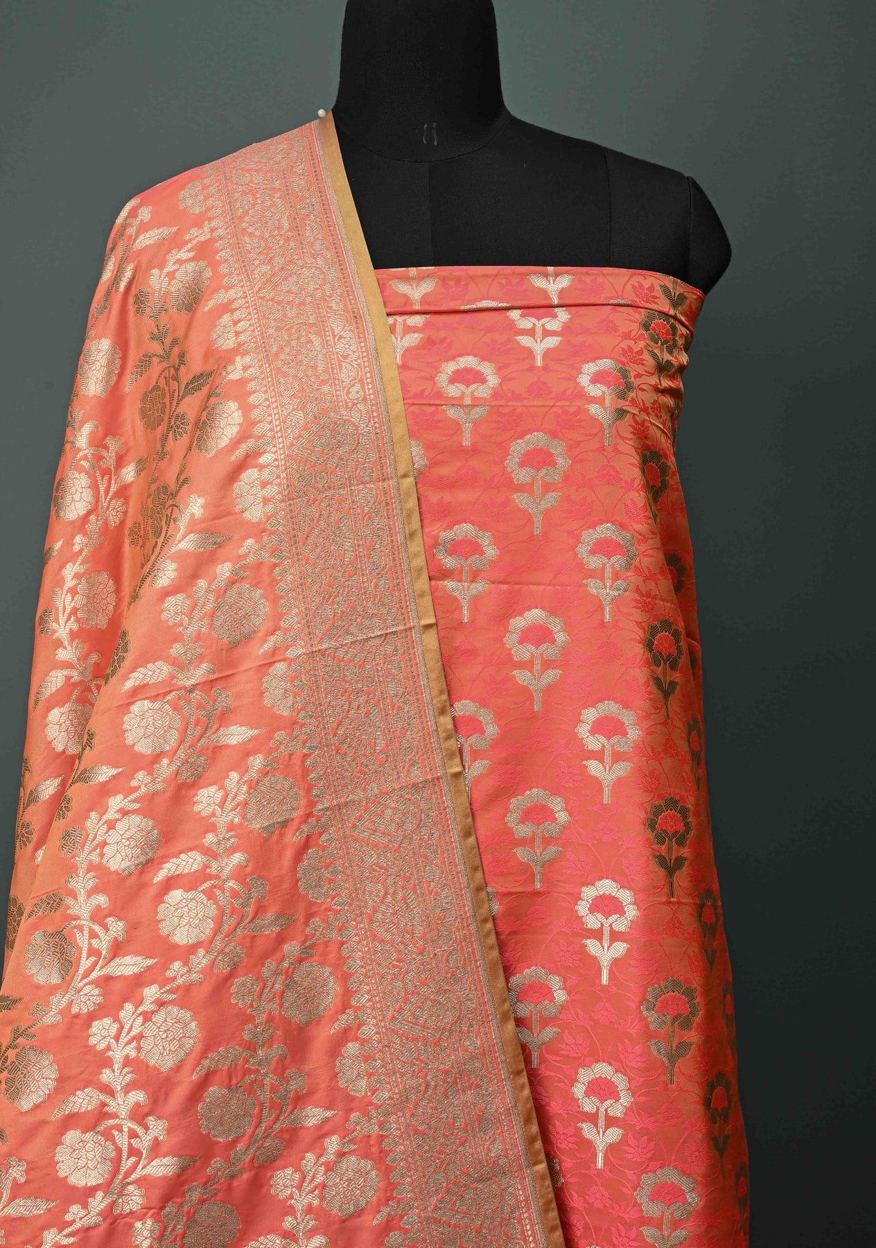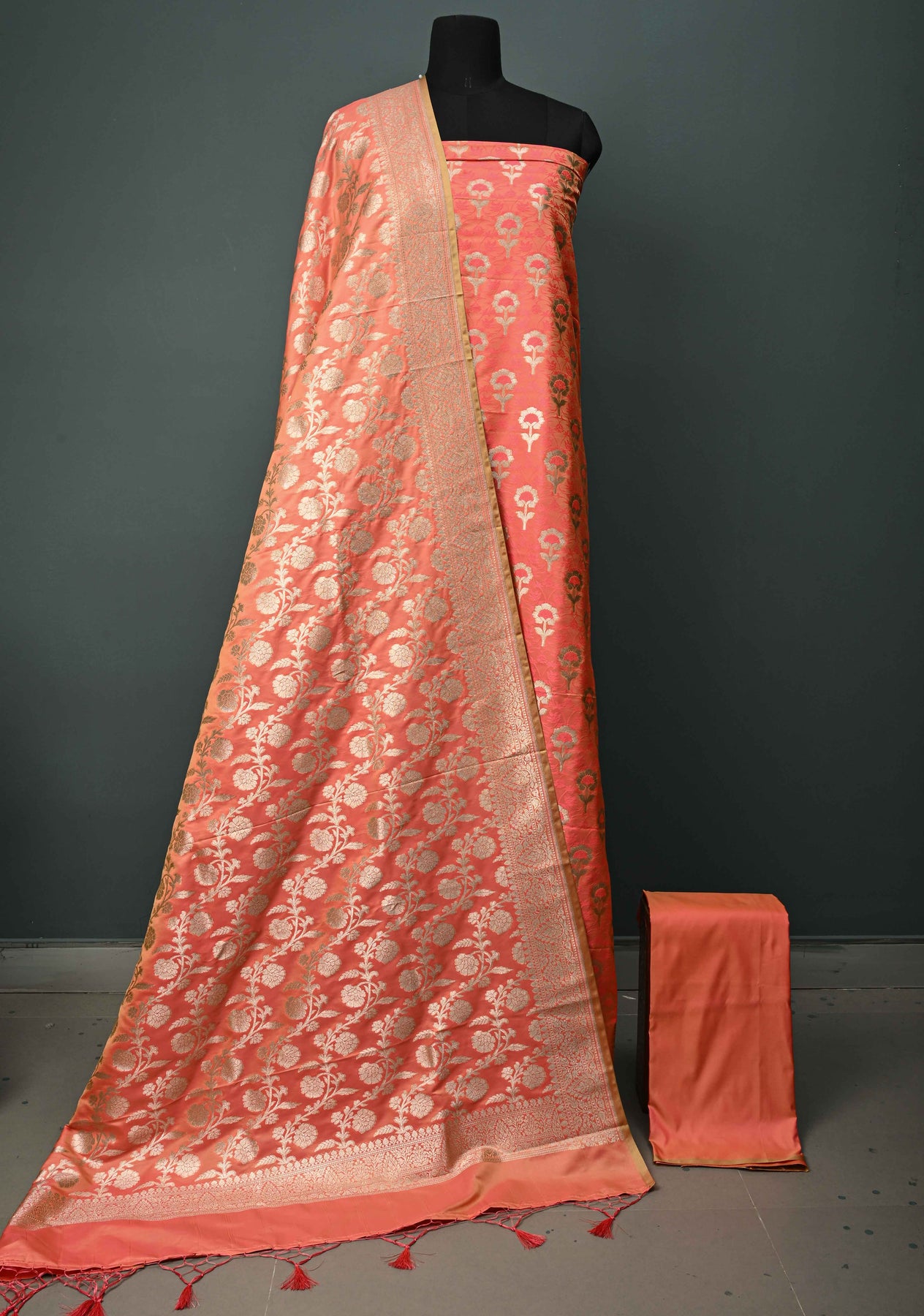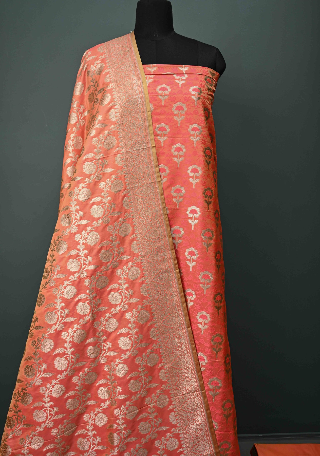 Salmon Orange Floral Jaal Semi Mashru Silk Unstitched Salwar Suit Set