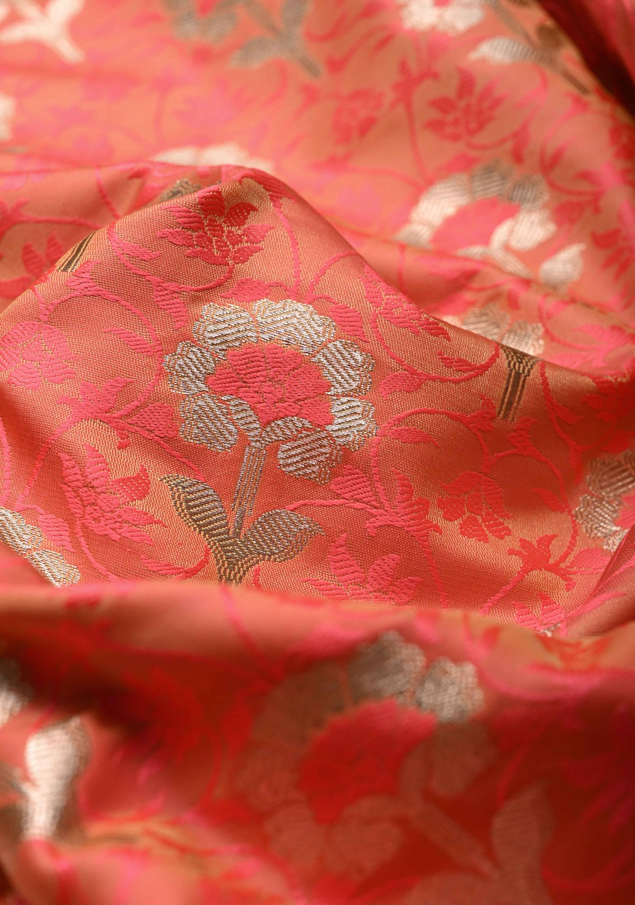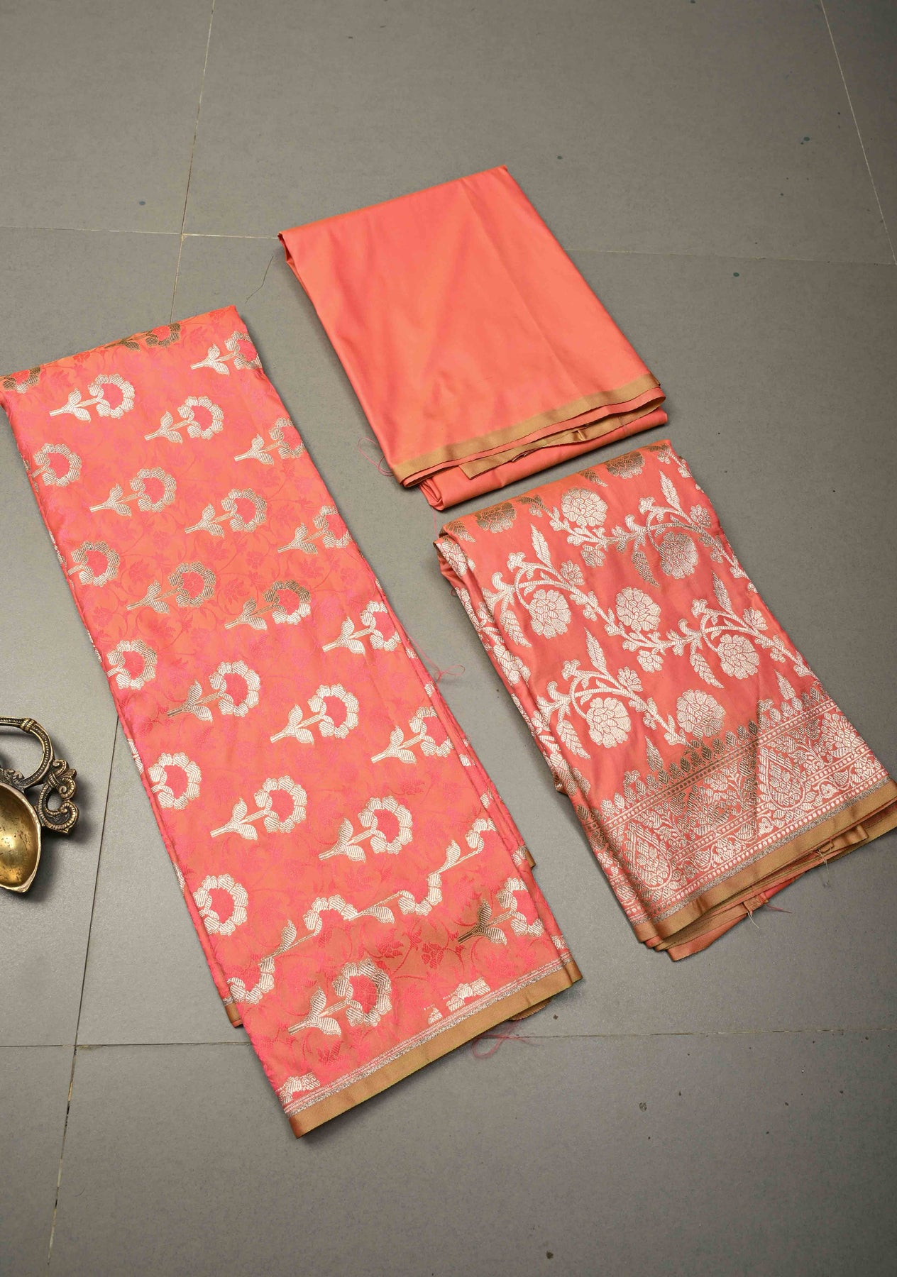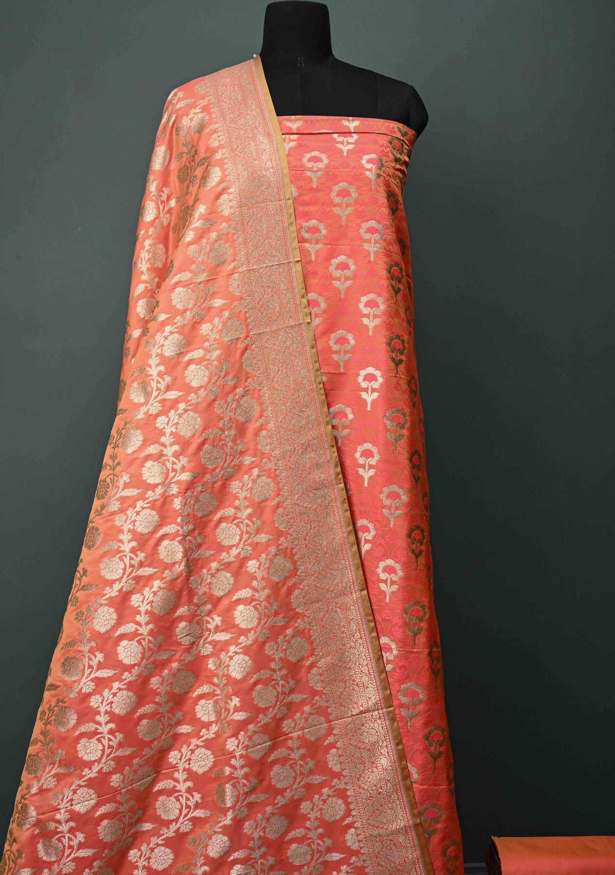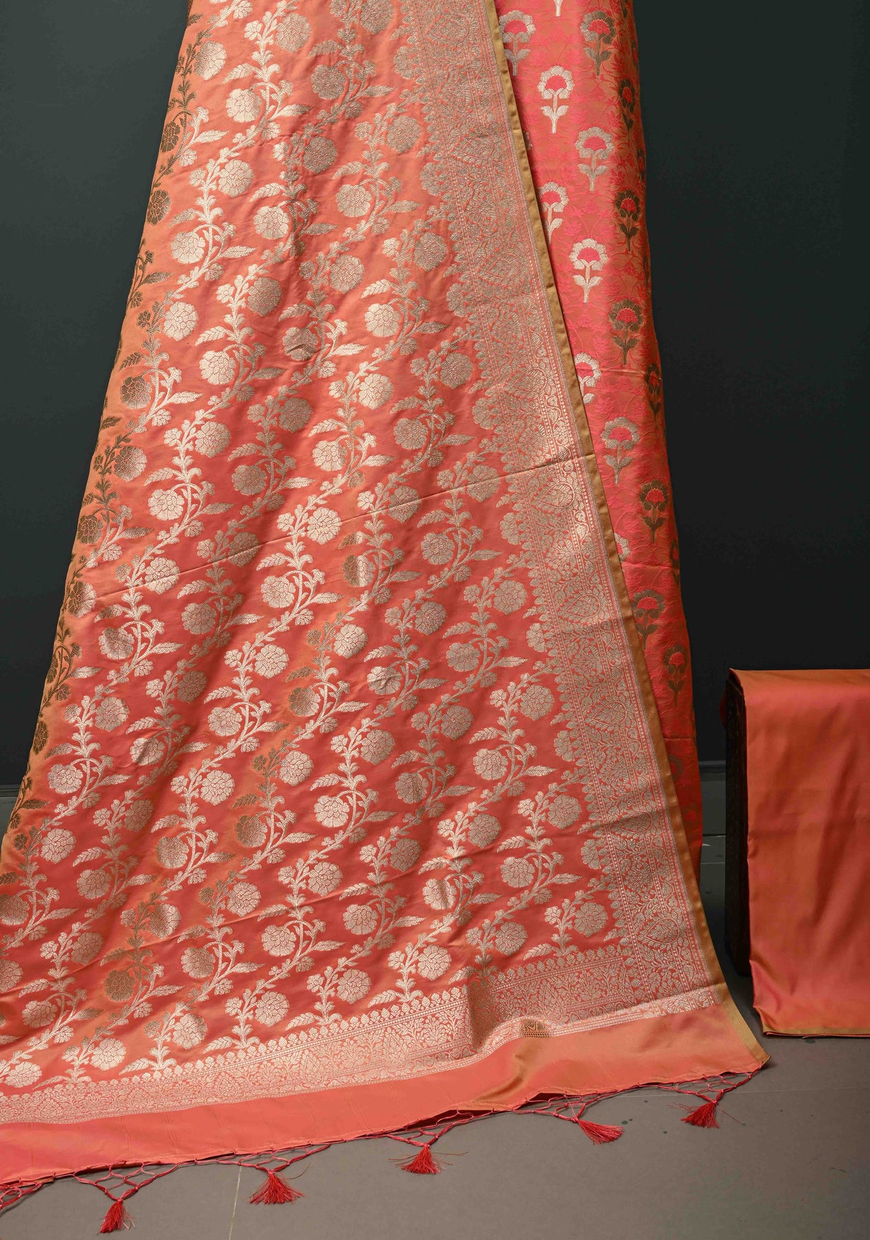 Salmon Orange Floral Jaal Semi Mashru Silk Unstitched Salwar Suit Set