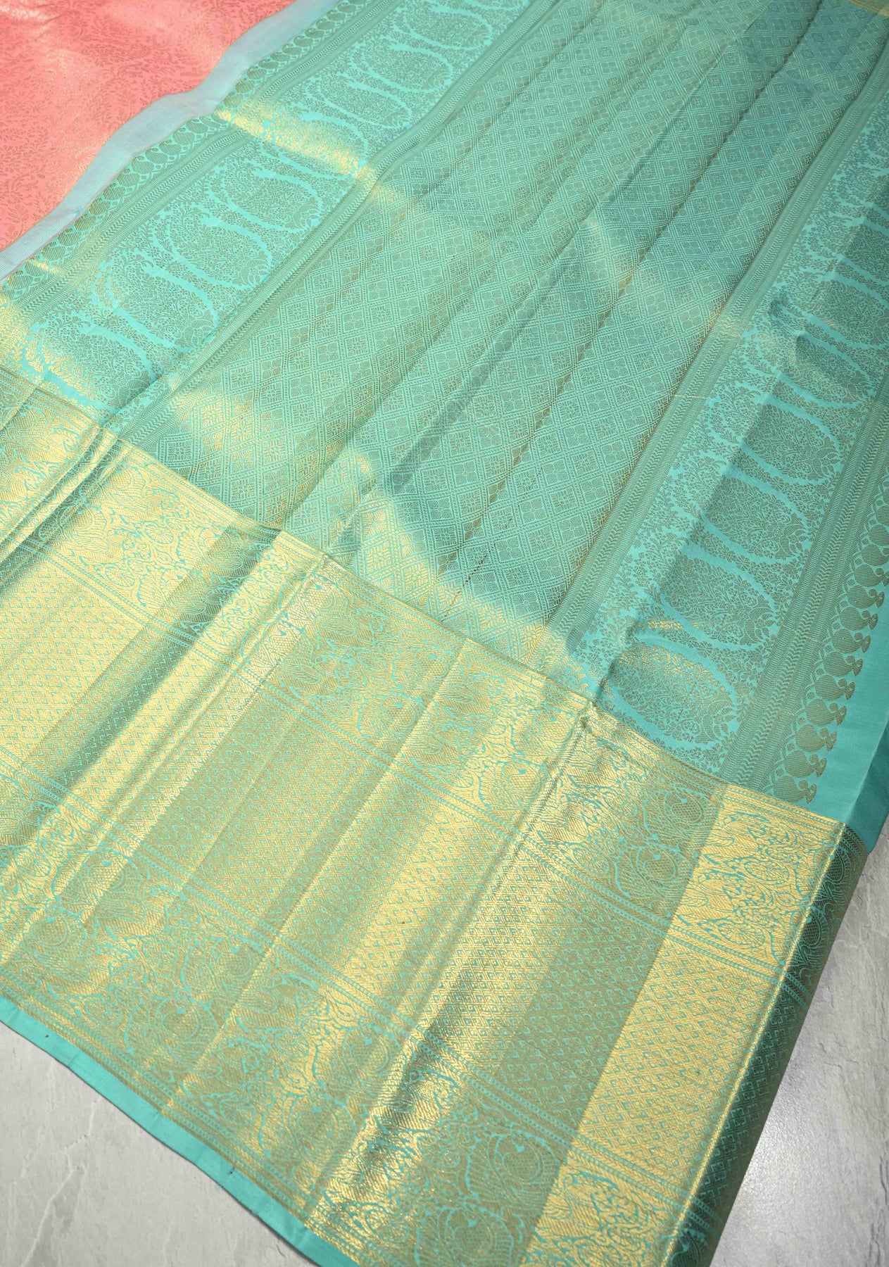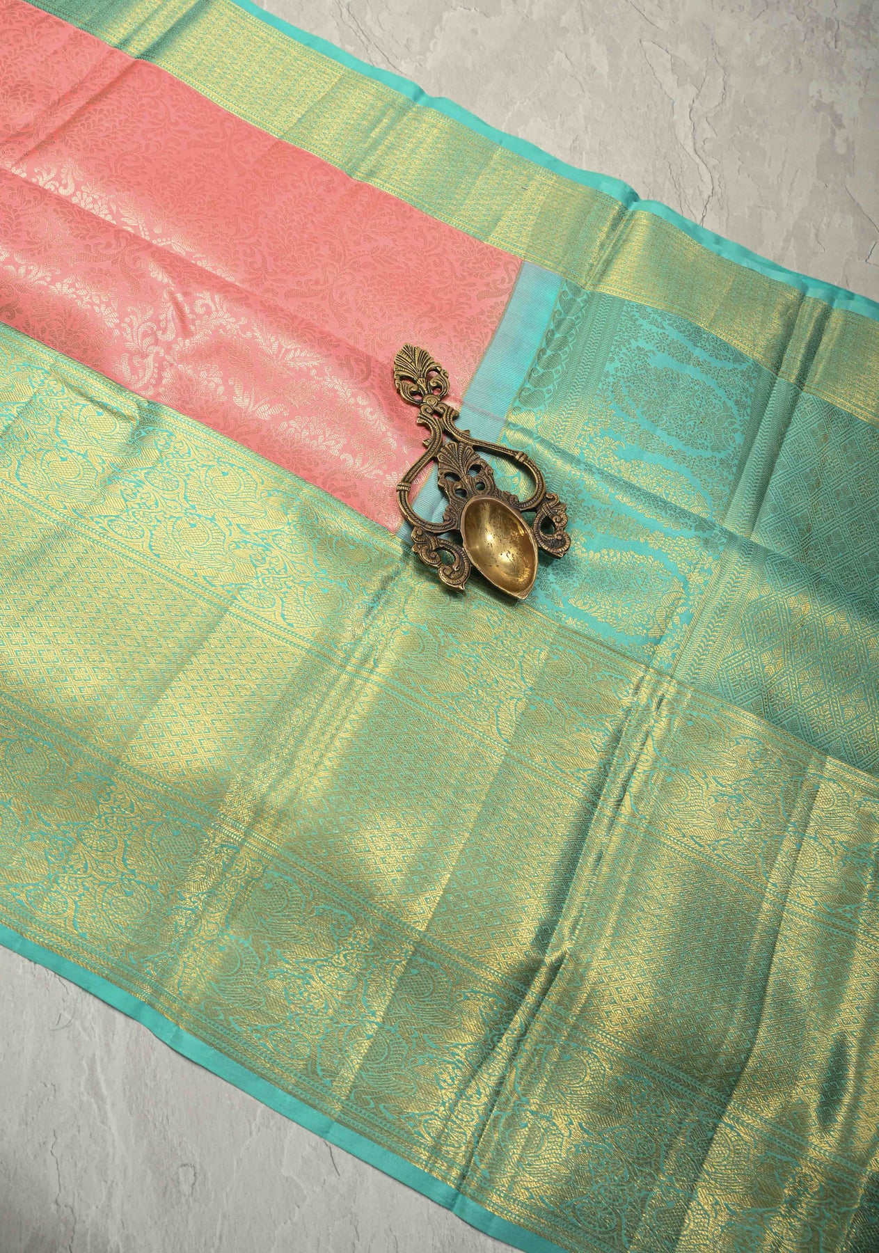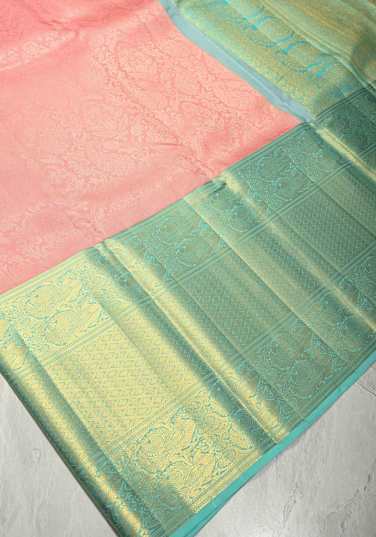 Radiate timeless charm in this Salmon Pink Kanjivaram Pure Silk Saree. The delicate pastel body is exquisitely adorned with an all-over silver Zari floral jaal brocade, creating a sophisticated, shimmering texture. A striking contrast Sea Green wide border provides a refreshing and regal finish, meticulously woven with traditional Zari motifs. Perfect for weddings and grand celebrations, this heritage masterpiece beautifully balances soft, feminine tones with vibrant, festive elegance.