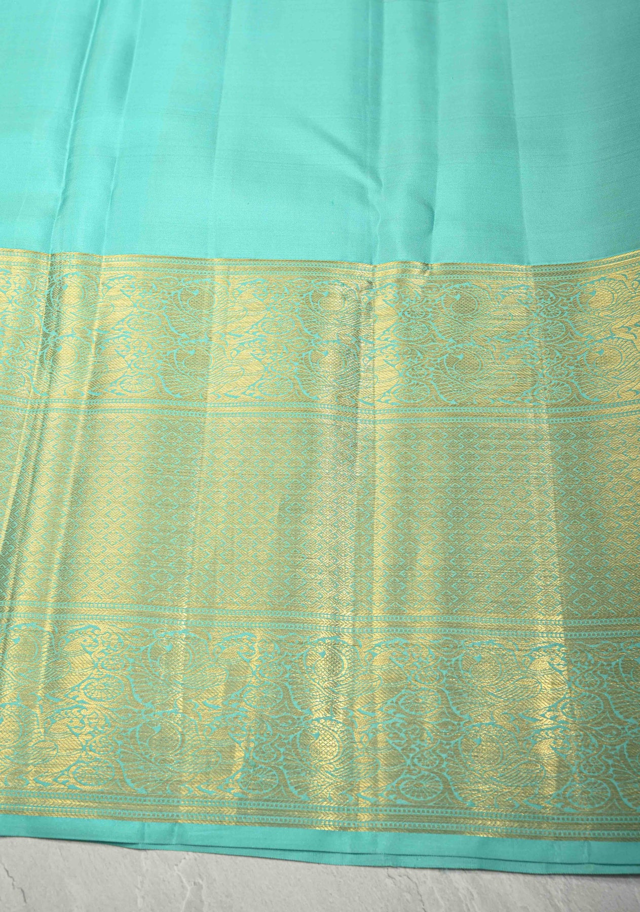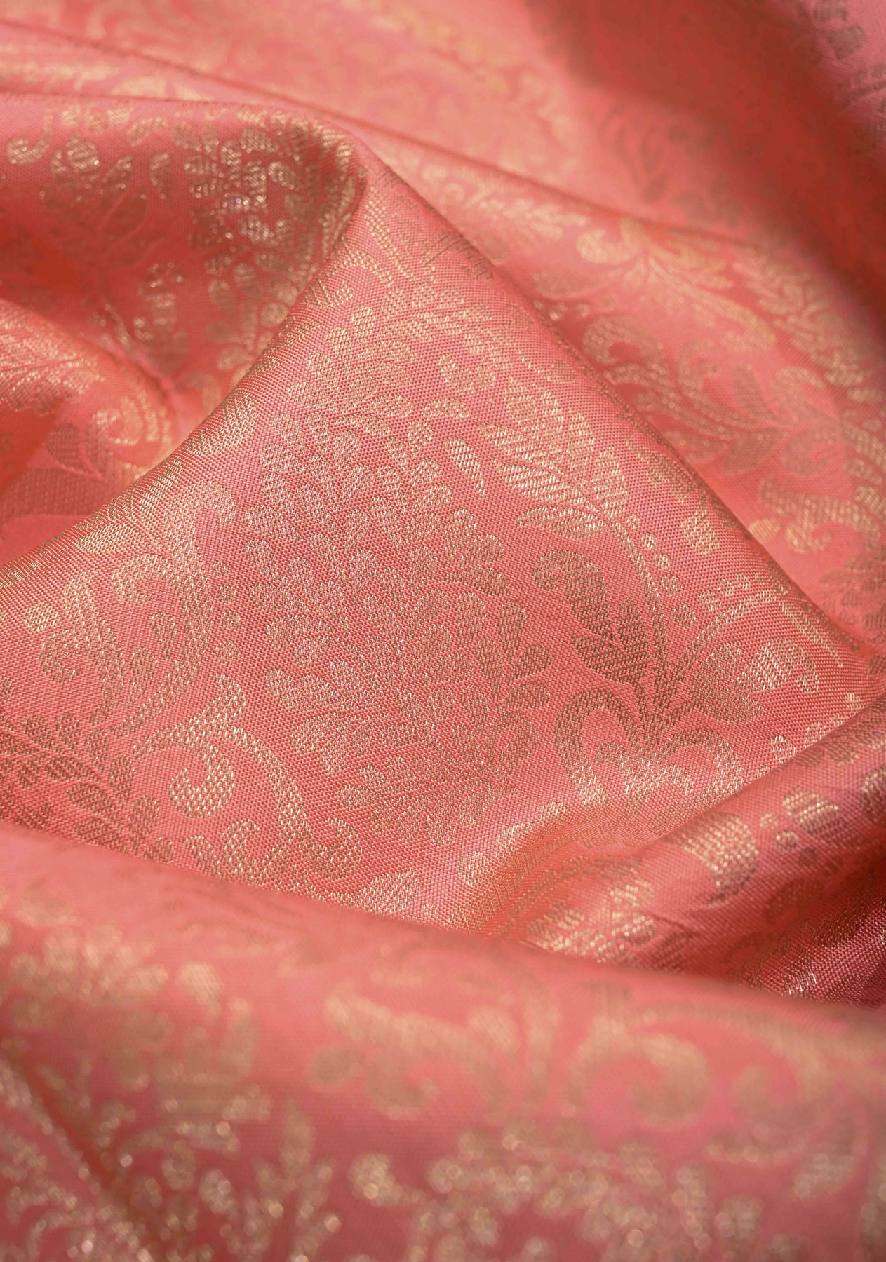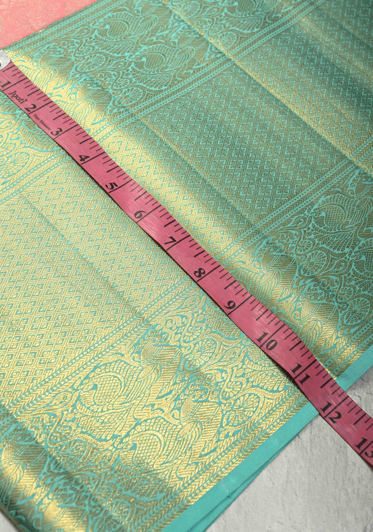Radiate timeless charm in this Salmon Pink Kanjivaram Pure Silk Saree. The delicate pastel body is exquisitely adorned with an all-over silver Zari floral jaal brocade, creating a sophisticated, shimmering texture. A striking contrast Sea Green wide border provides a refreshing and regal finish, meticulously woven with traditional Zari motifs. Perfect for weddings and grand celebrations, this heritage masterpiece beautifully balances soft, feminine tones with vibrant, festive elegance.