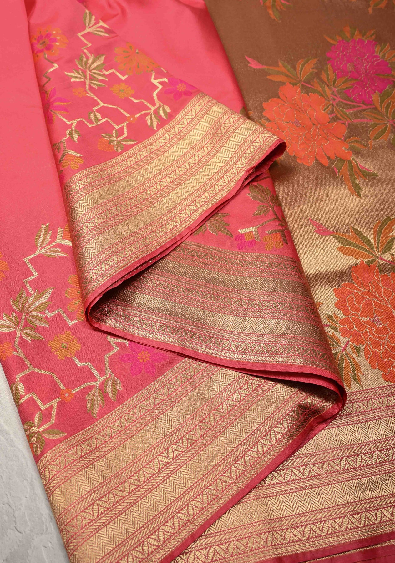 Radiate grace and charm in this salmon pink semi-silk saree, a perfect blend of subtle elegance and traditional artistry. The body of the saree is adorned with delicate zari buttas, adding a gentle shimmer to the pink base. Enhancing its appeal is a beautifully crafted zari border, intricately woven with a Meenakari jaal design that introduces rich color and intricate detail. Lightweight and luxurious, this saree is ideal for festive celebrations, weddings, or special occasions where understated beauty makes a lasting impression.