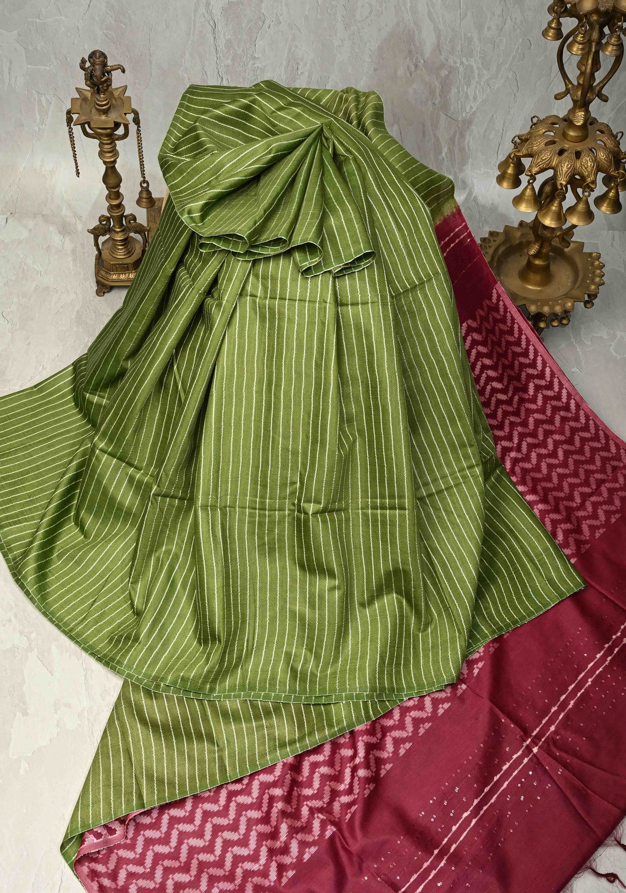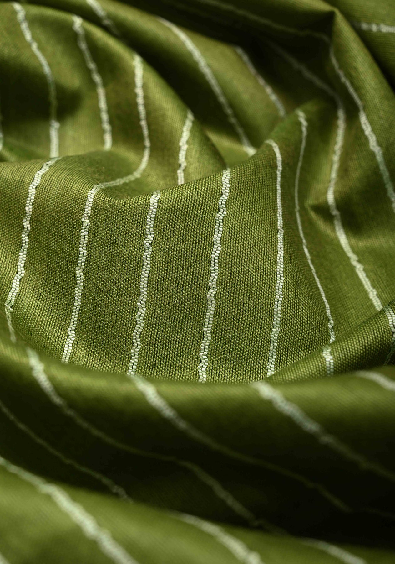 This sap green borderless semi Tussar saree reflects effortless elegance with its finely woven thread horizontal stripes that add subtle depth and texture. Designed with a contrast pallu embellished with delicate sequins, it brings a soft touch of shimmer to the understated silhouette. Lightweight and comfortable, this saree is perfect for office wear, daytime festivities, and graceful casual occasions.