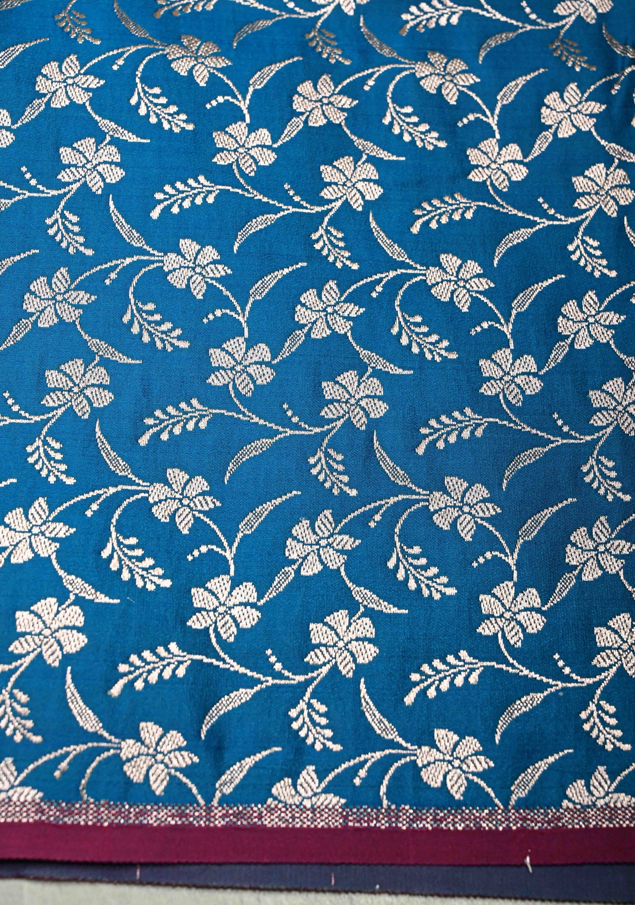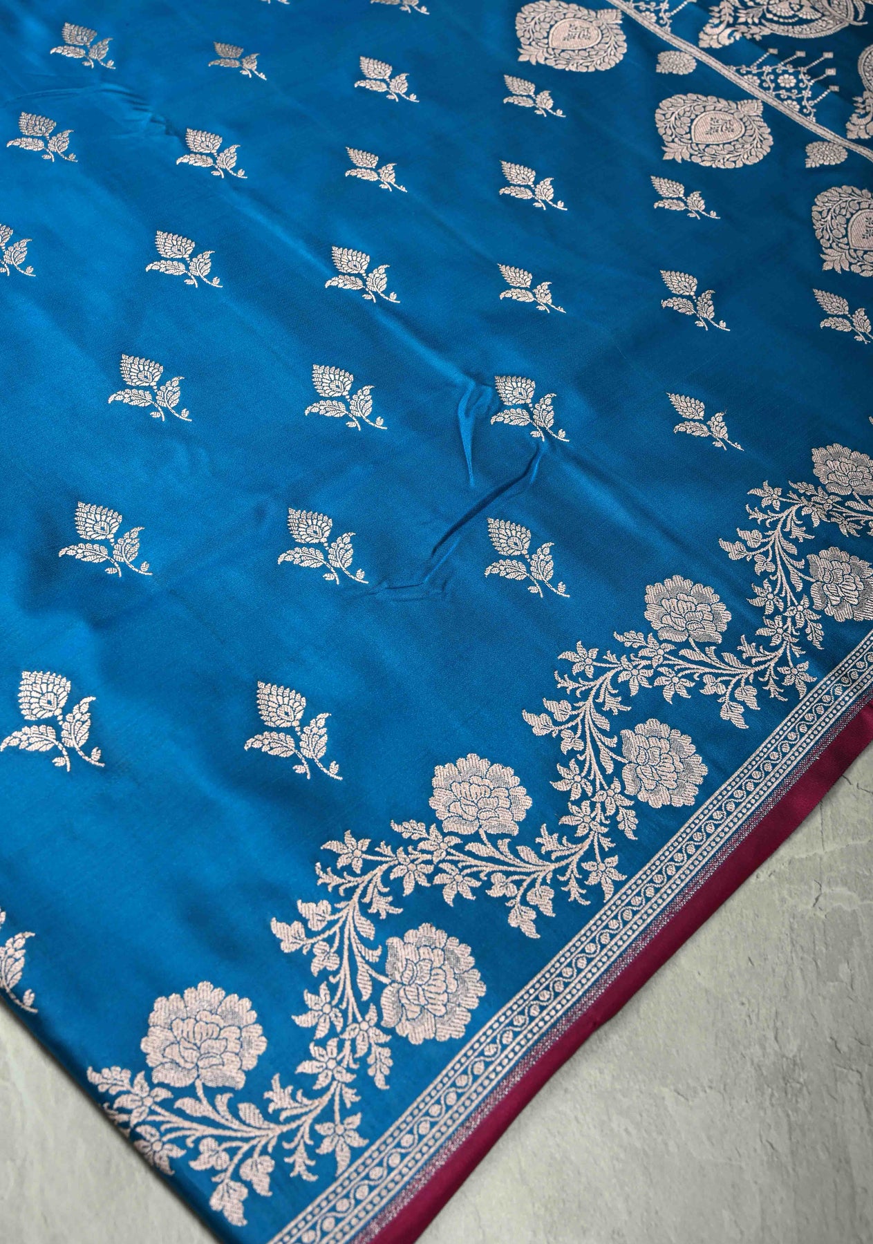 Add a touch of royal elegance to your wardrobe with this Sapphire Blue Banarasi Semi Mashru Silk Saree, crafted for a lustrous, smooth drape that beautifully complements the blue tone. The saree is adorned with delicate floral silver zari buttas, adding subtle shimmer and intricate detailing across the body.