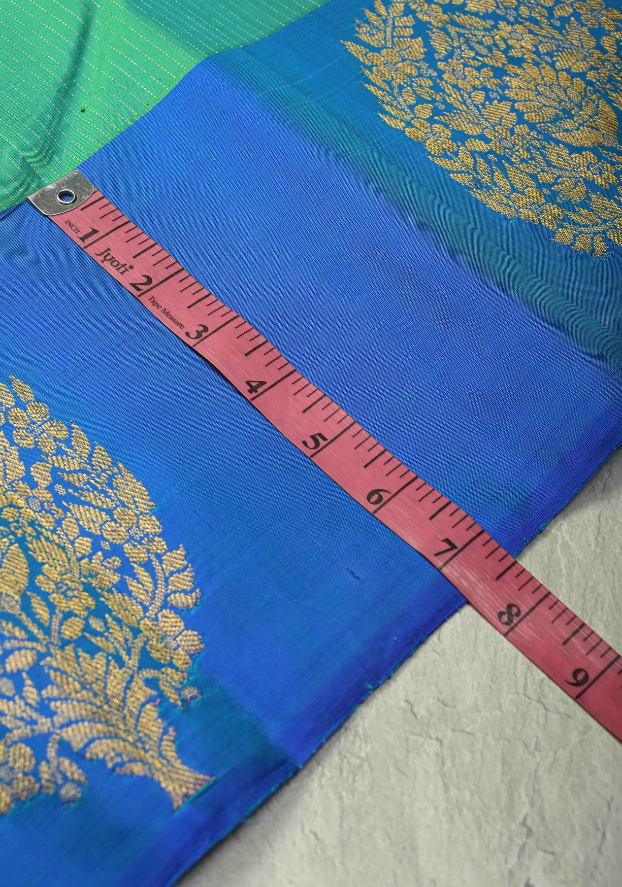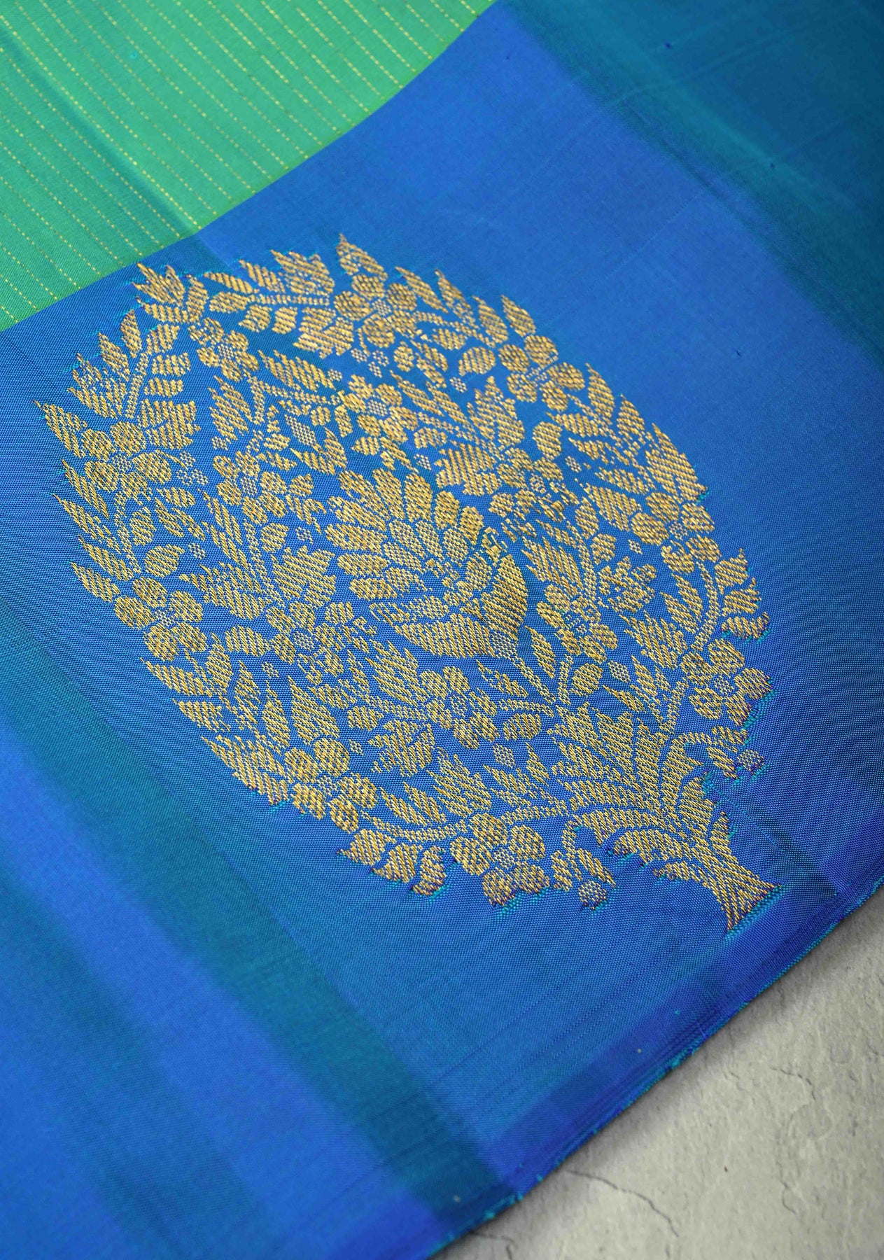 This Sea Green Dual Tone Pure Kanjivaram Silk Handloom Saree is a stunning blend of tradition and elegance. The saree features a beautiful dual-tone sea green hue that gradually transitions, creating a soft yet radiant effect. The fabric is enriched with Vairaoosi Zari stripes, adding a luxurious metallic sheen that enhances the saree’s overall charm.