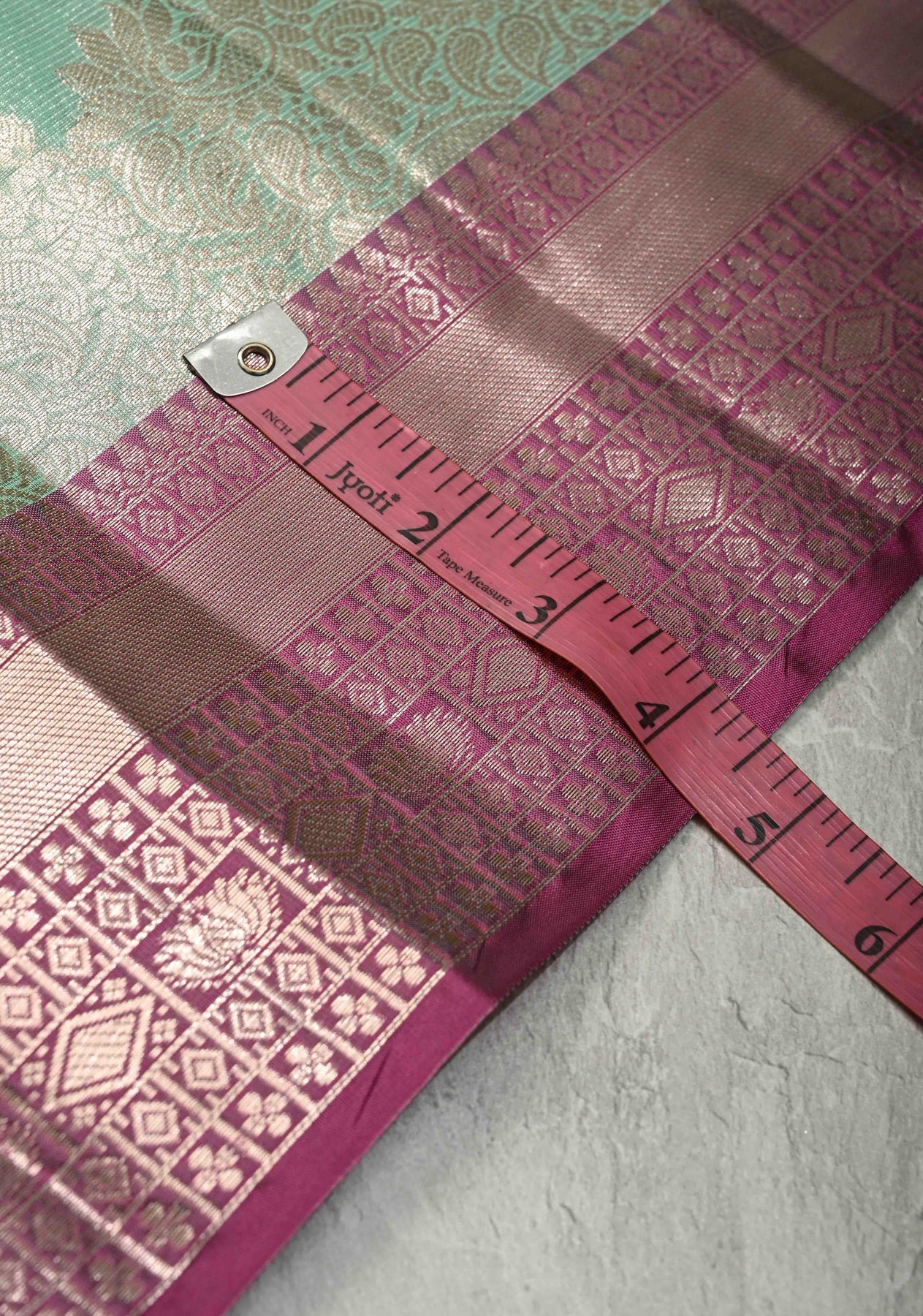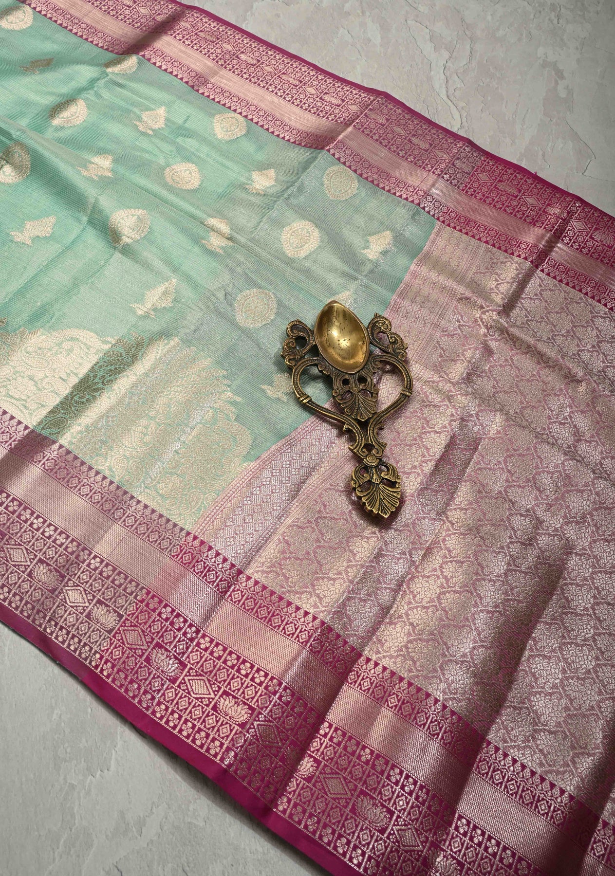 This Seafoam Green Kanjivaram Tissue Semi Silk Saree combines refreshing elegance with classic craftsmanship. The saree body is adorned with delicate zari buttas, adding a subtle shimmer and enhancing its traditional appeal. Woven in lightweight tissue semi silk, it drapes gracefully, offering both comfort and a regal look. The striking contrast zari border beautifully frames the saree, creating a perfect balance between simplicity and opulence. Ideal for weddings, festive occasions, and special celebrations, this saree is a timeless choice for those seeking understated luxury with a touch of sophistication