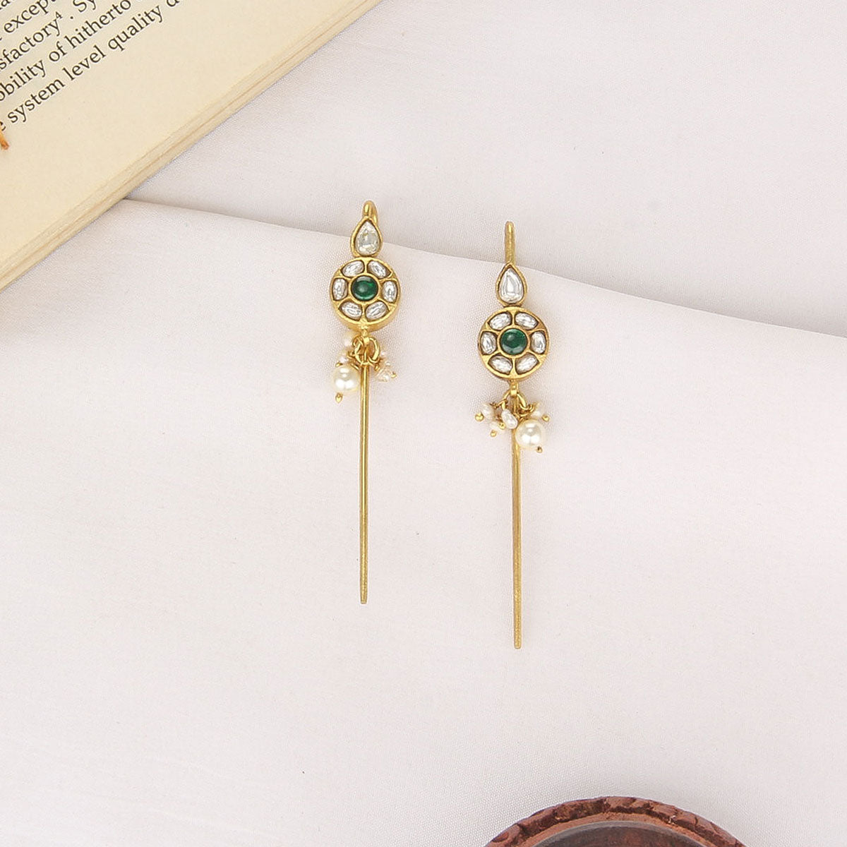 This 92.5 Silver, 24 kt Gold-Plated Needle Ear cuffs is adorned with Semi-precious Kundan Stones for a luxurious aesthetic.