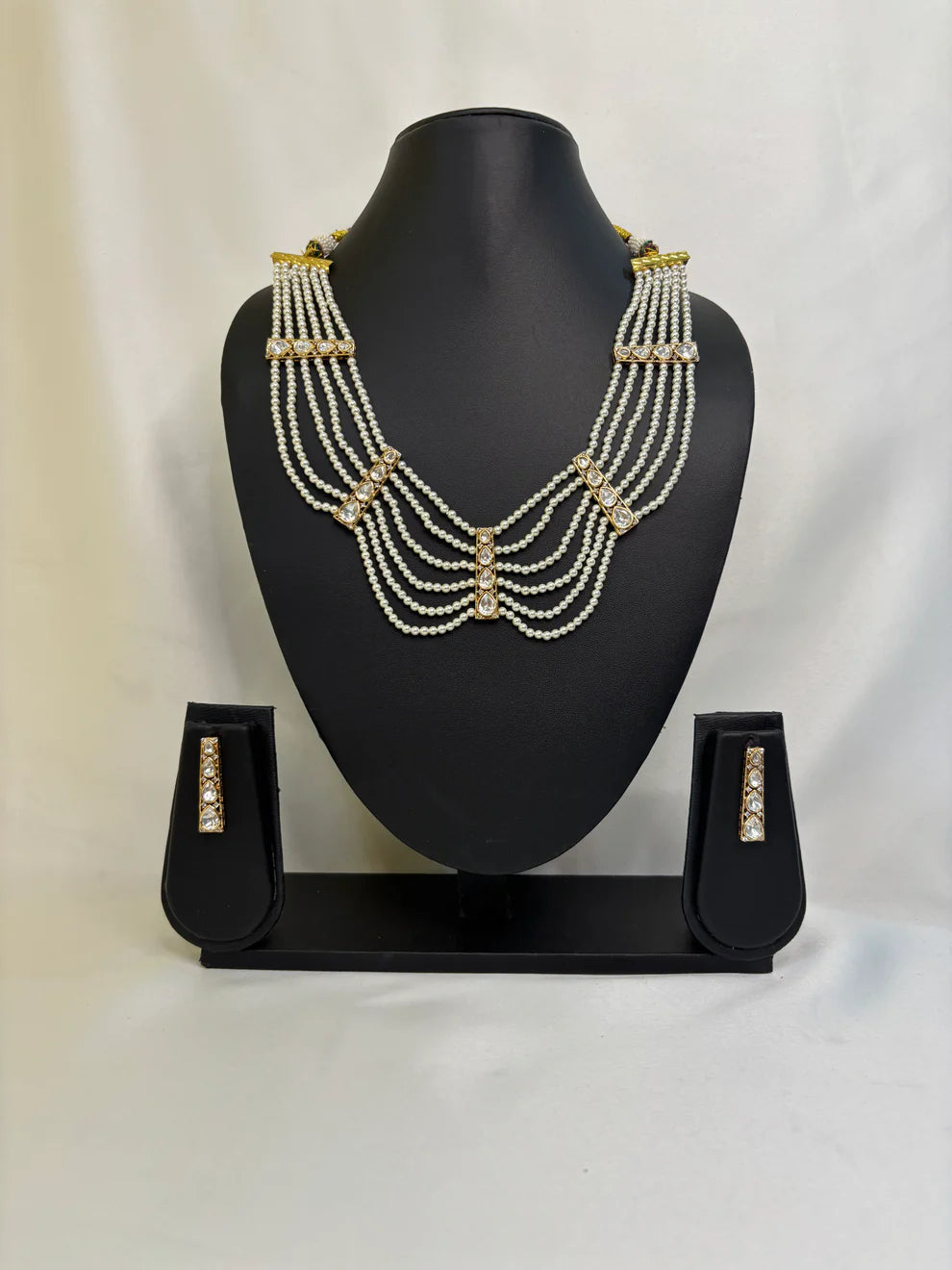 This Sitara Layered Pearl & Kundan Necklace Set is a stunning example of traditional craftsmanship blended with timeless elegance. Featuring seven delicate strands of luminous white pearls, this statement piece is anchored by intricate gold-toned spacers adorned with shimmering Kundan-style stones.