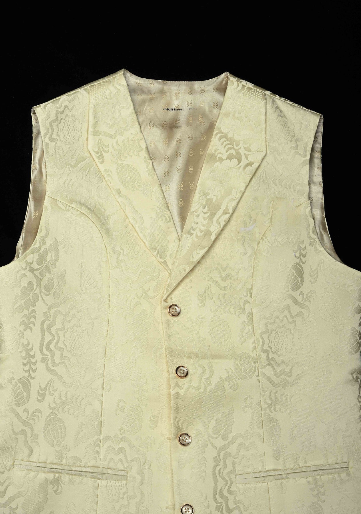 Elevate your ethnic and fusion ensembles with this Women's ivory Silk Blend Waistcoat featuring elegant self brocade detailing. Crafted from a silk blend fabric, it offers a luxurious sheen and a sophisticated texture that adds depth and charm to any outfit. The tailored silhouette ensures a flattering fit, while the off-white shade makes it a versatile piece that pairs beautifully with kurtas, sarees, shirts, and lehengas. Perfect for festive occasions, celebrations, or stylish everyday wear, this waistcoat blends tradition with modern refinement.