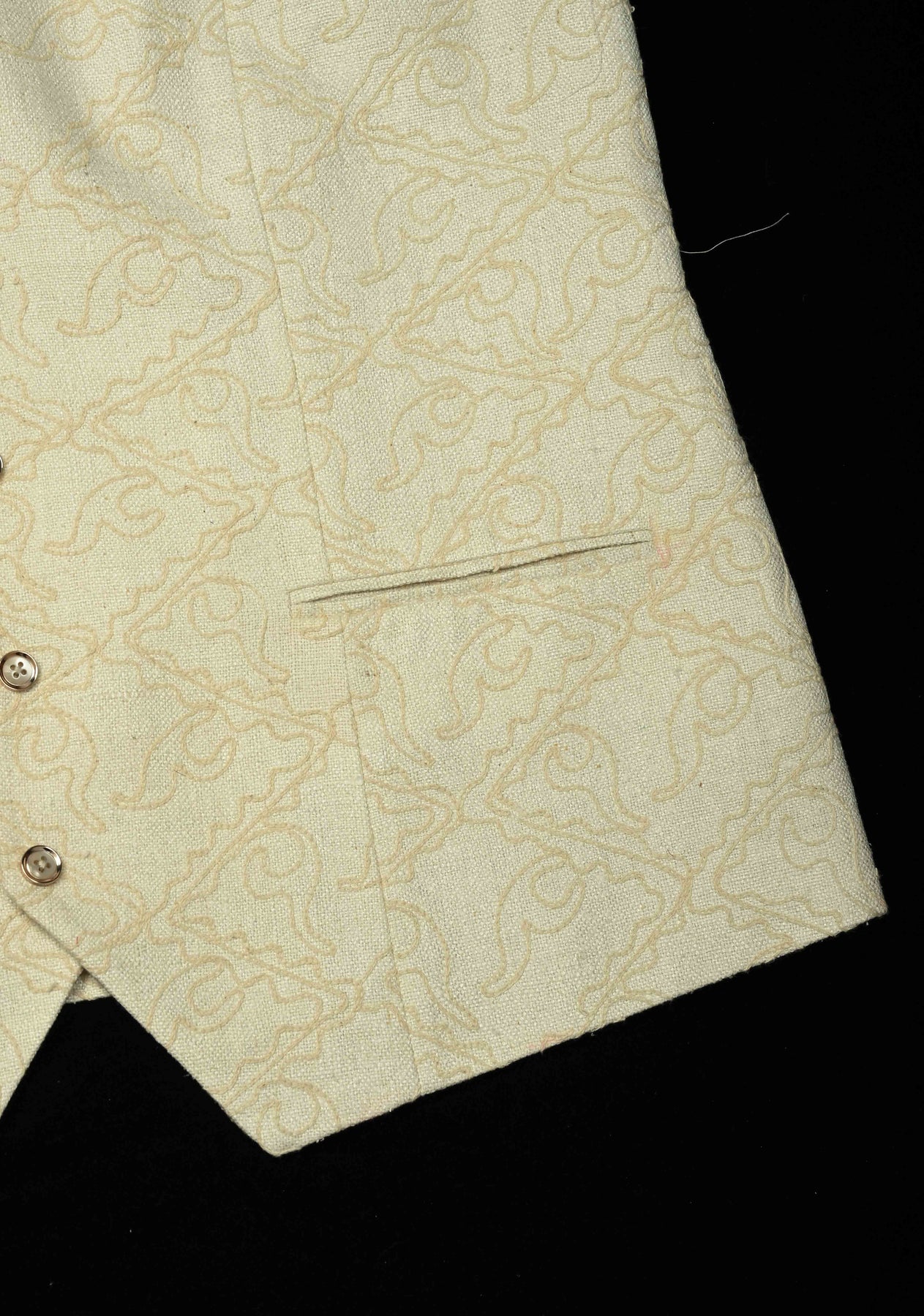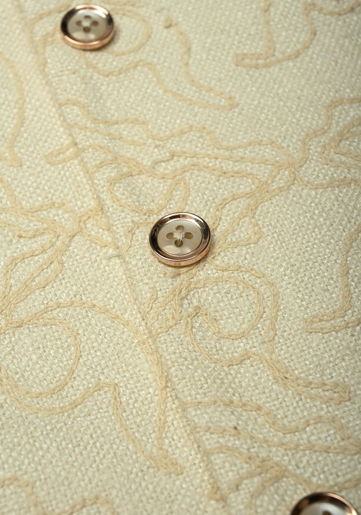 Add a touch of handcrafted elegance to your wardrobe with this Women’s Cream Jute Self-Embroidery Nehru Jacket / Waistcoat. Made from jute fabric, it features delicate self-embroidery that adds subtle texture and sophistication to a classic silhouette.