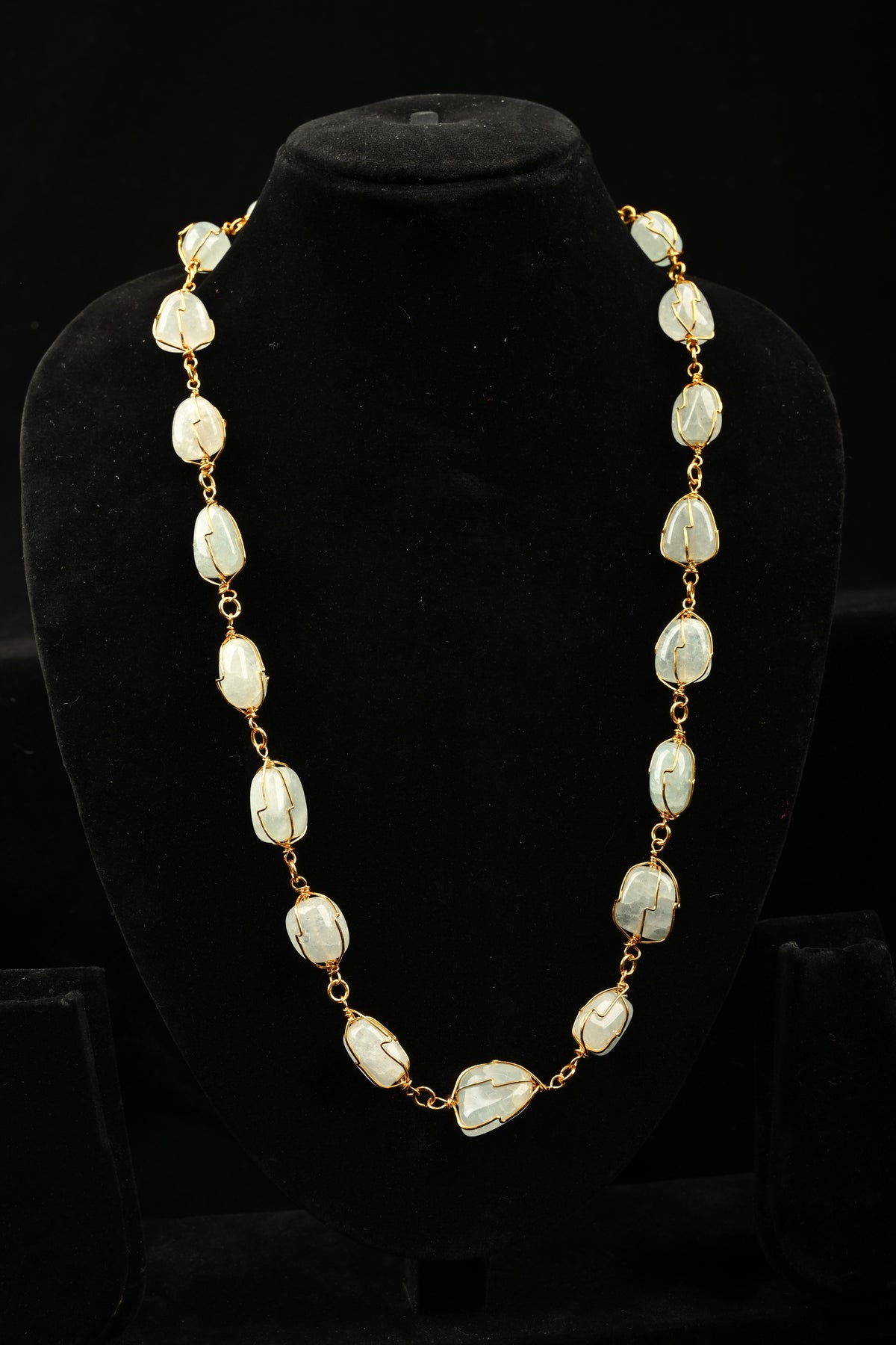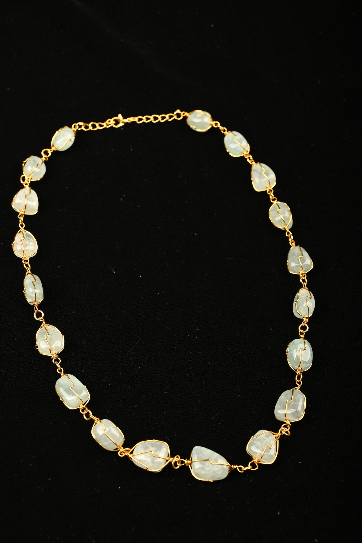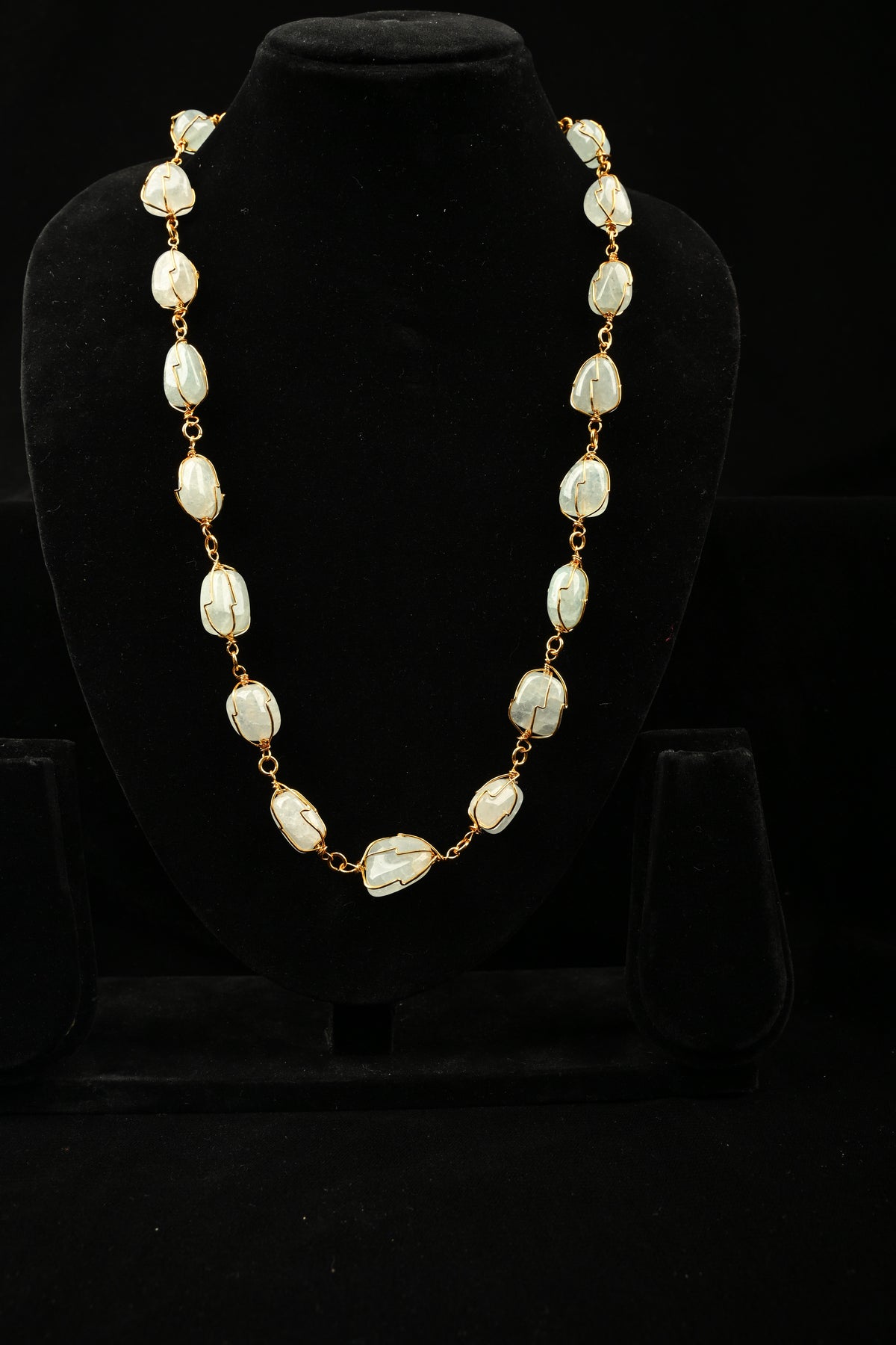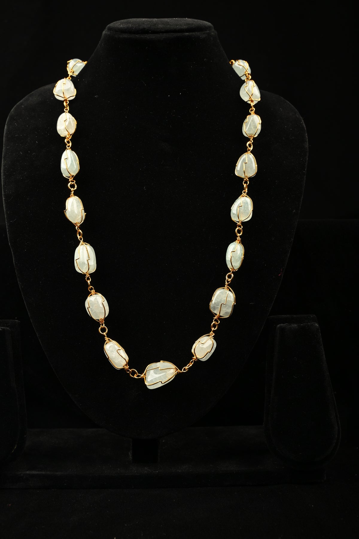 A graceful composition of softly polished quartz stones, delicately framed in warm gold-tone wire, this necklace radiates understated elegance. The organic shapes of each stone enhance its natural charm, while the translucent pastel blue hues catch light with a subtle glow.