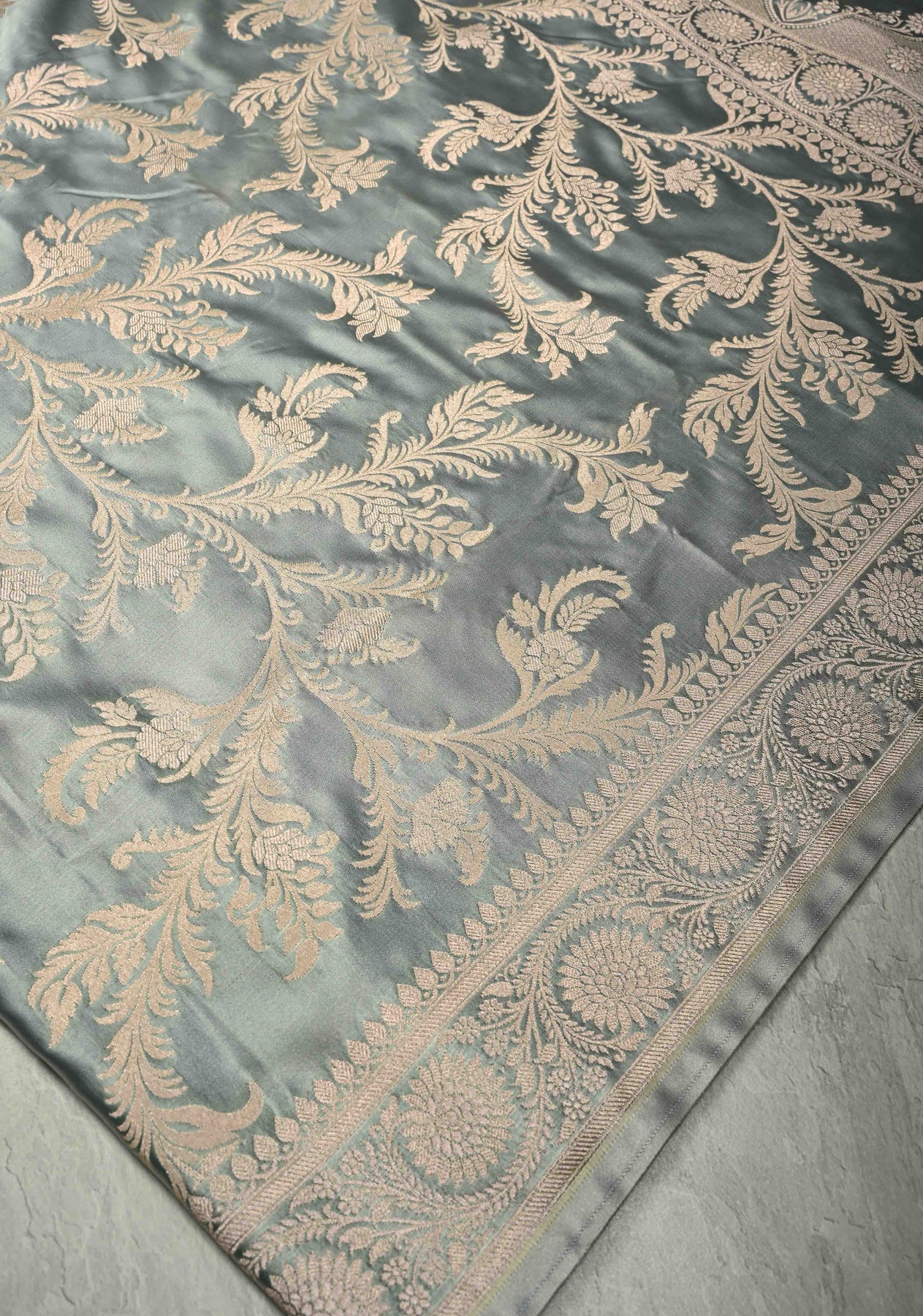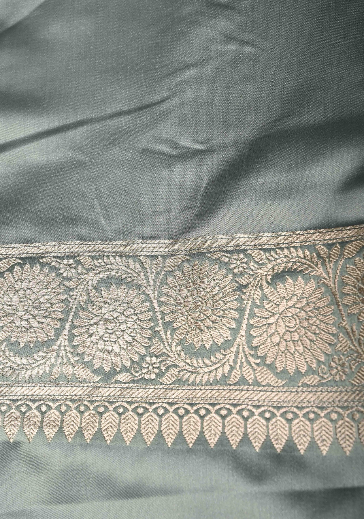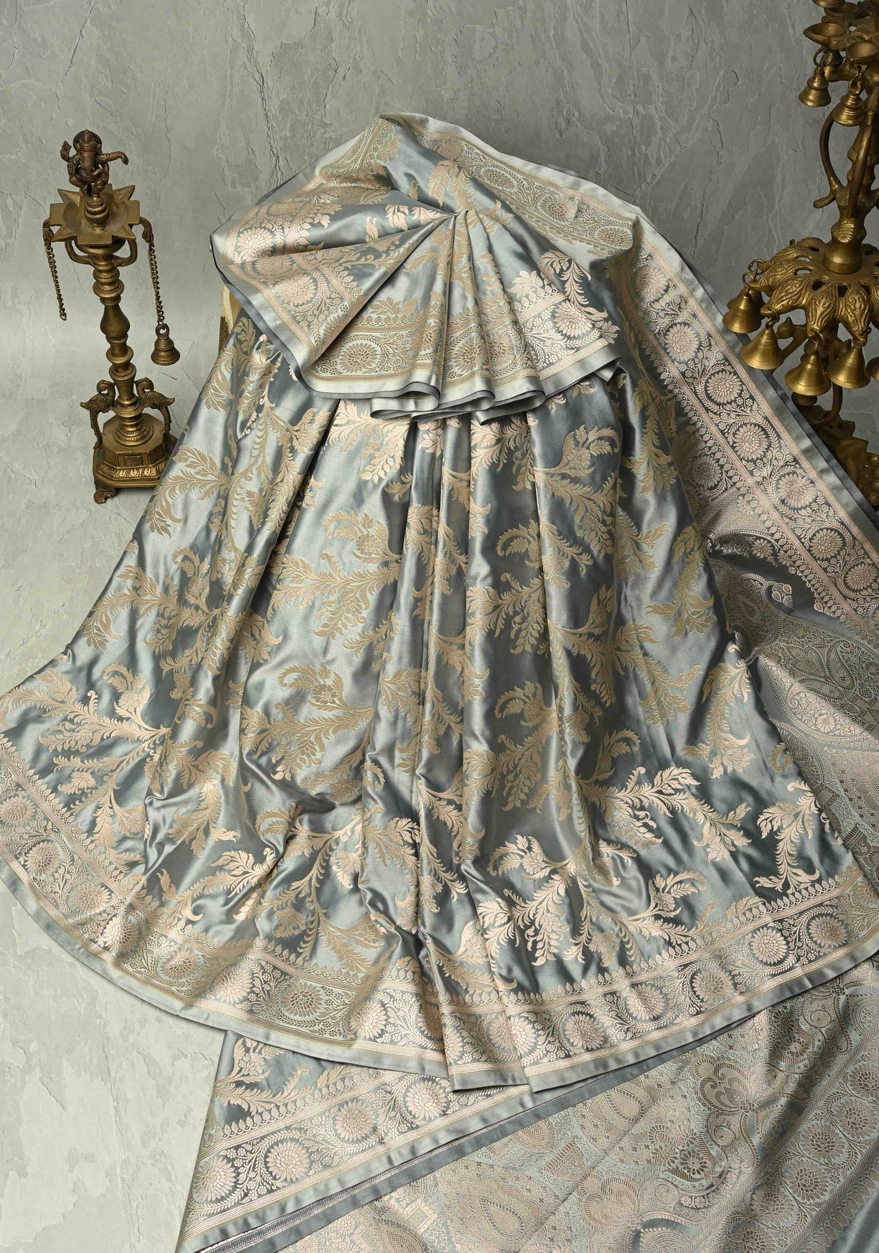 Complementing the elegant gray tone is a finely crafted zari border, adding a touch of traditional charm while enhancing the saree’s timeless appeal. Perfect for weddings, receptions, festive gatherings, and evening celebrations, this saree is designed for women who appreciate heritage Banarasi artistry with contemporary elegance.