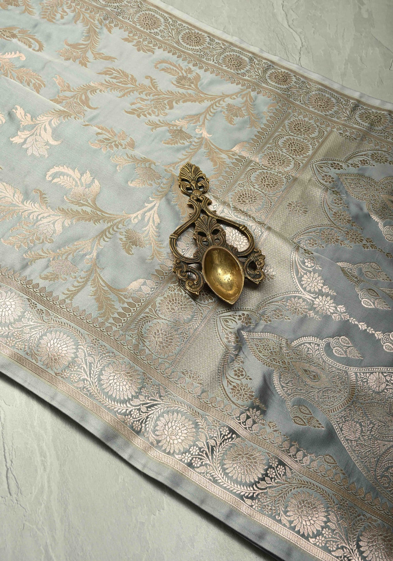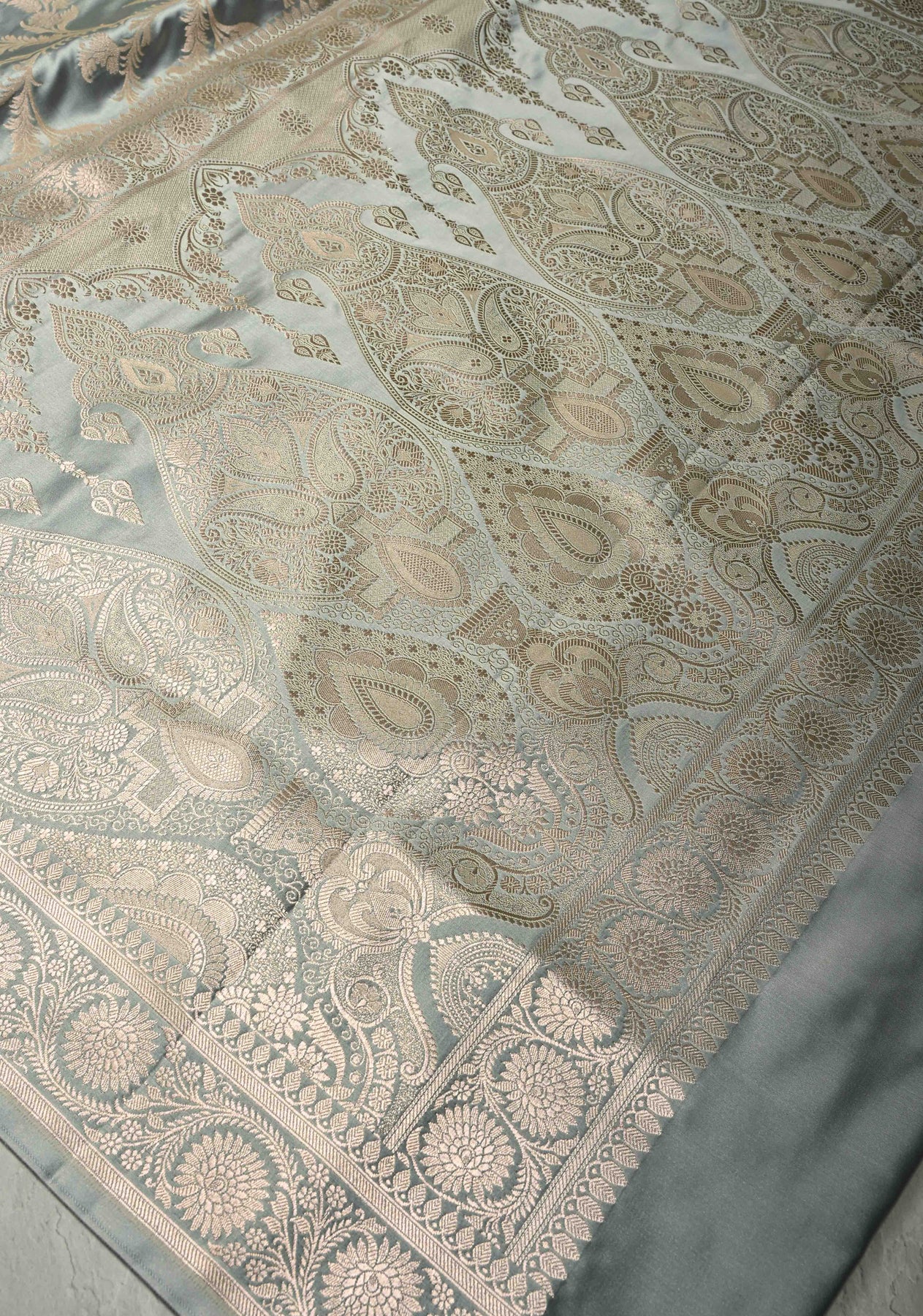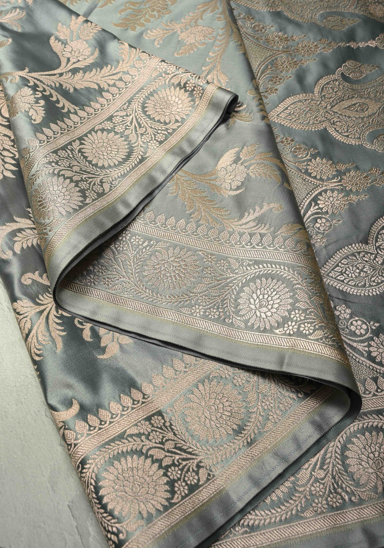 Complementing the elegant gray tone is a finely crafted zari border, adding a touch of traditional charm while enhancing the saree’s timeless appeal. Perfect for weddings, receptions, festive gatherings, and evening celebrations, this saree is designed for women who appreciate heritage Banarasi artistry with contemporary elegance.