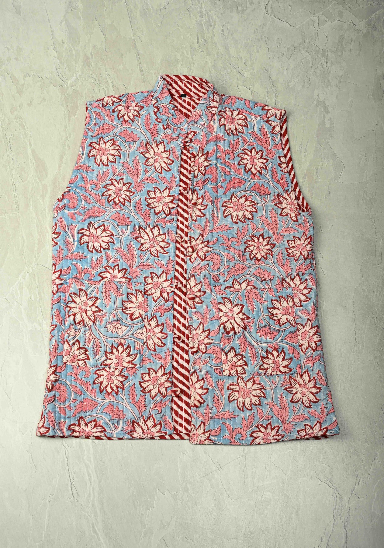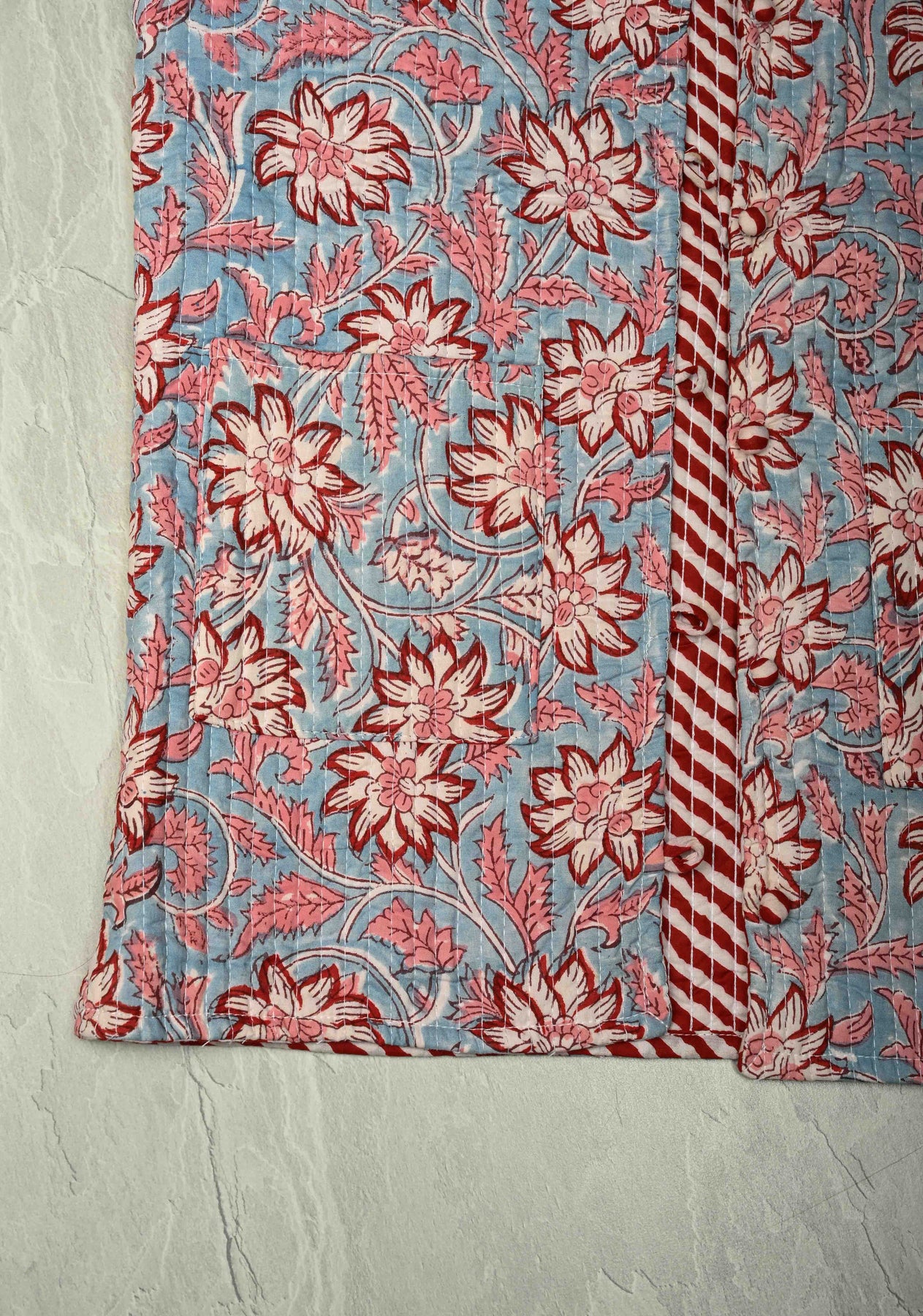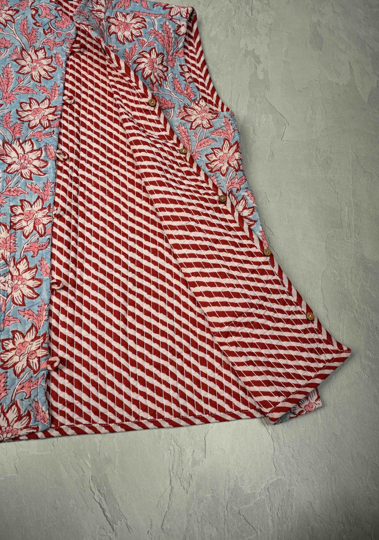 This Soft Dusty Blue Print Quilted Reversible Jacket exudes effortless elegance and comfort. Crafted from breathable cotton fabric, it features delicate floral prints in soothing dusty blue tones that add a subtle charm. The reversible design offers two unique looks, making it a versatile addition to your wardrobe. Lightly quilted for warmth and style, this jacket pairs beautifully with both ethnic and casual outfits, perfect for year-round wear.