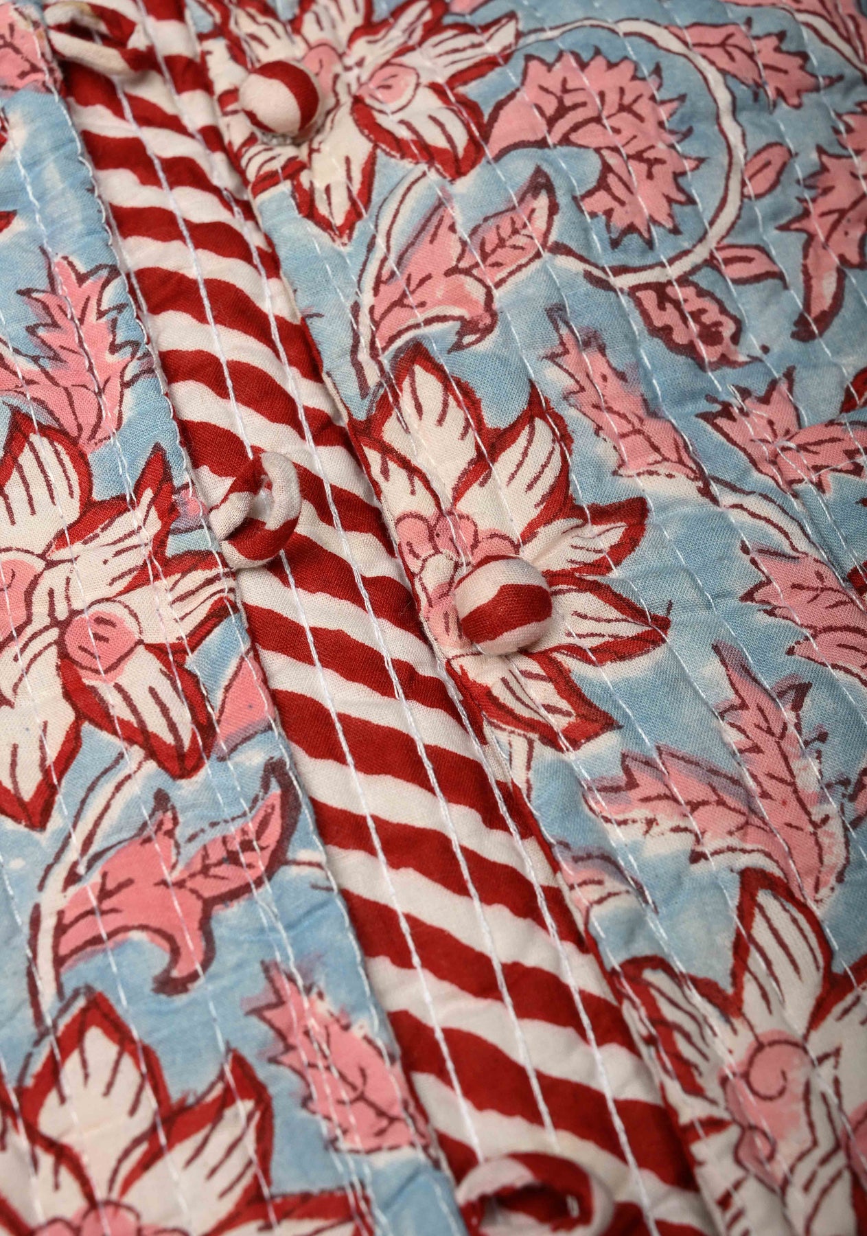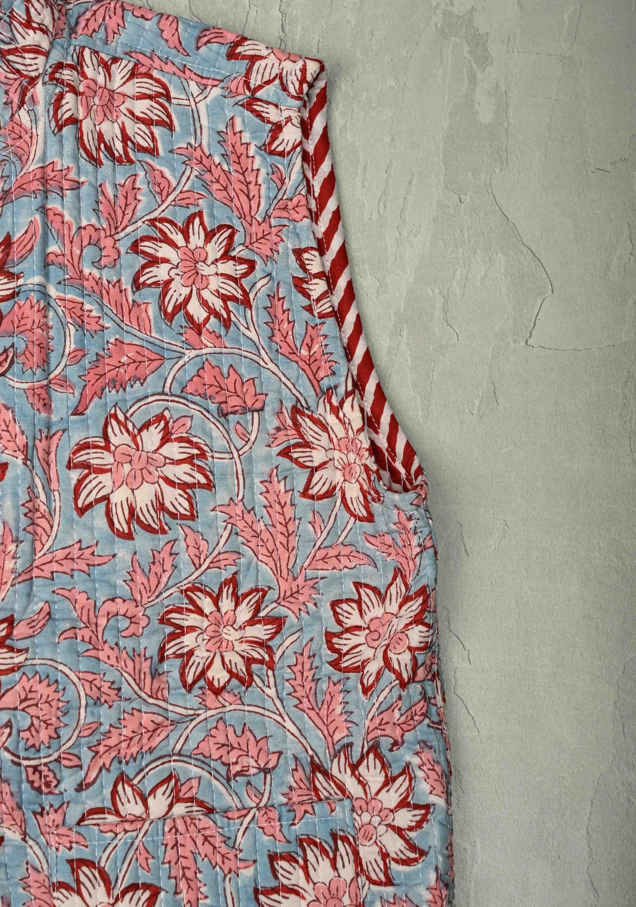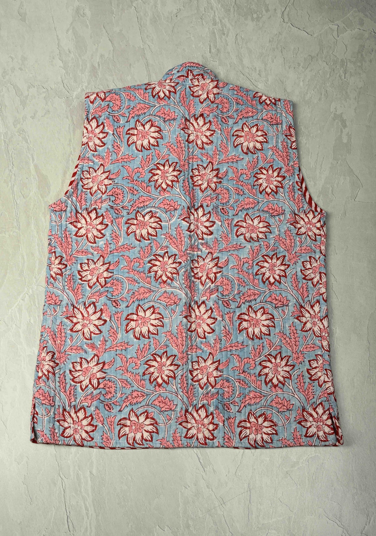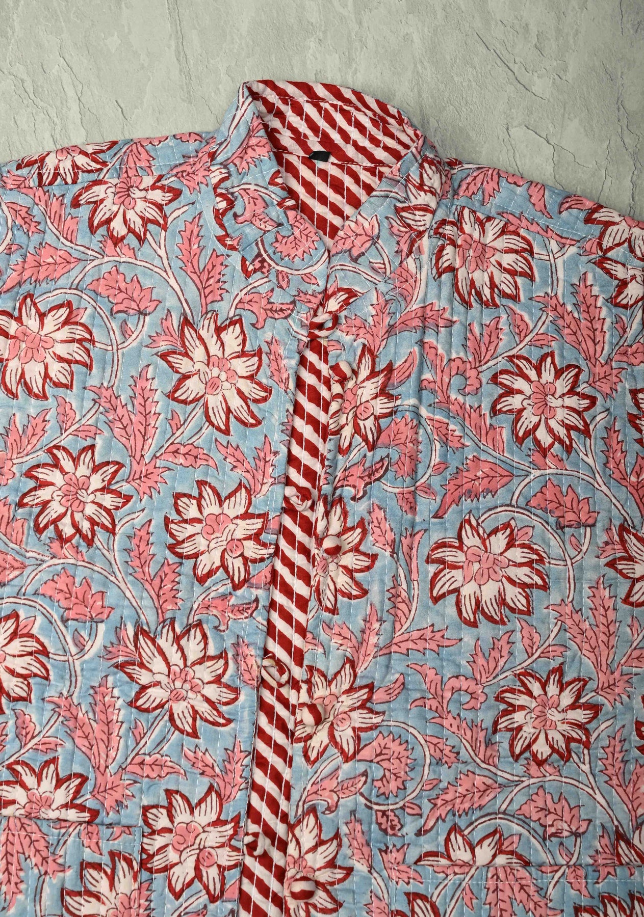 This Soft Dusty Blue Print Quilted Reversible Jacket exudes effortless elegance and comfort. Crafted from breathable cotton fabric, it features delicate floral prints in soothing dusty blue tones that add a subtle charm. The reversible design offers two unique looks, making it a versatile addition to your wardrobe. Lightly quilted for warmth and style, this jacket pairs beautifully with both ethnic and casual outfits, perfect for year-round wear.