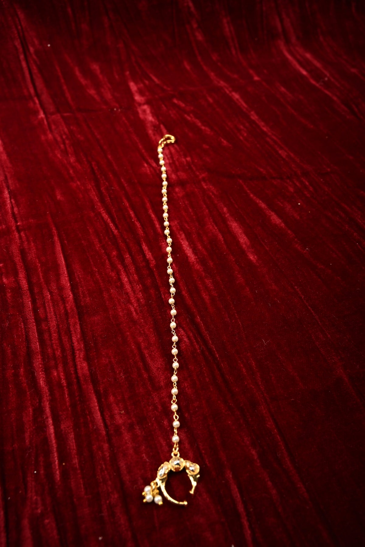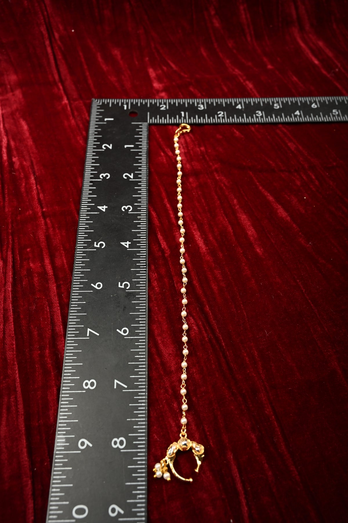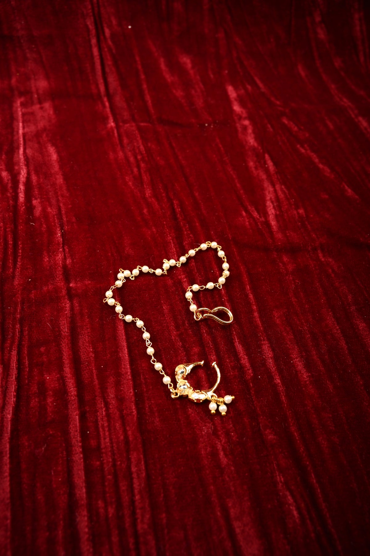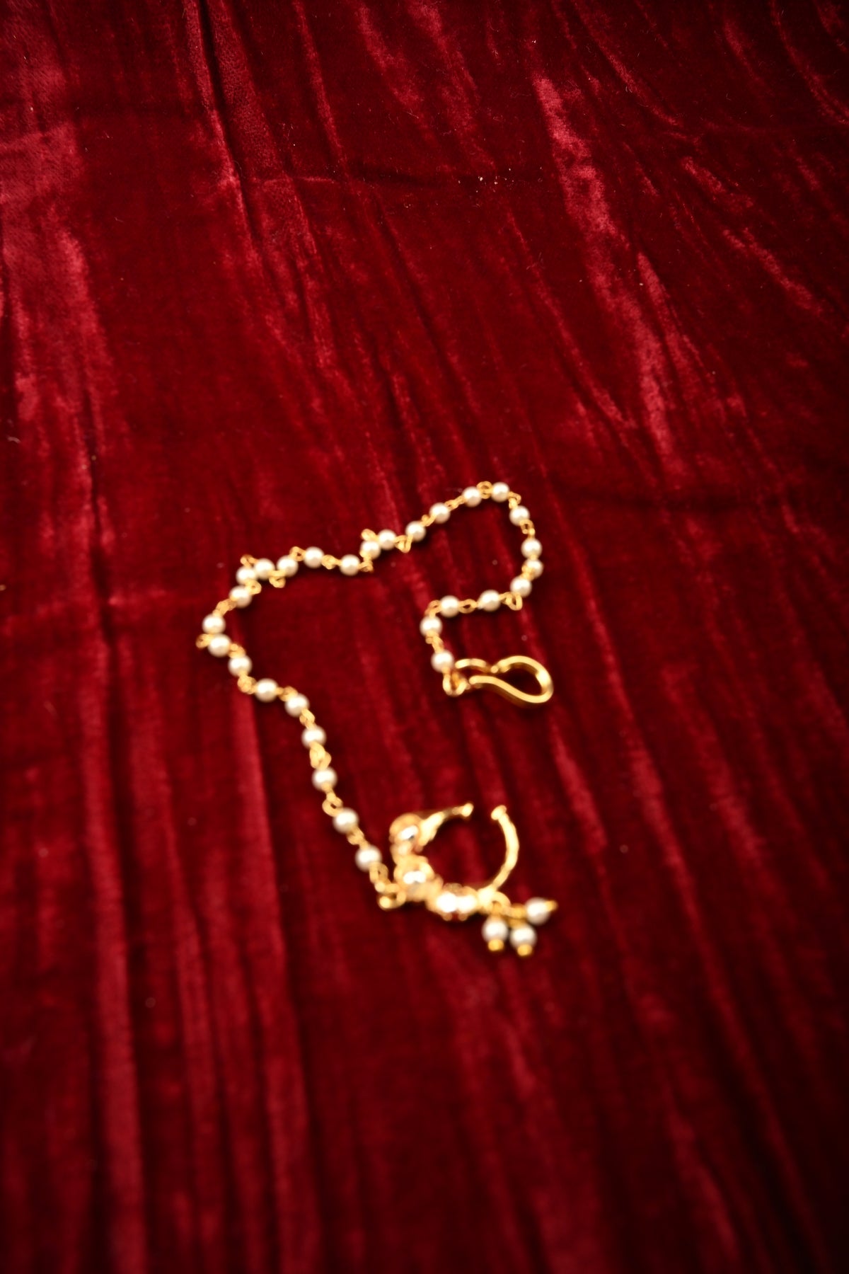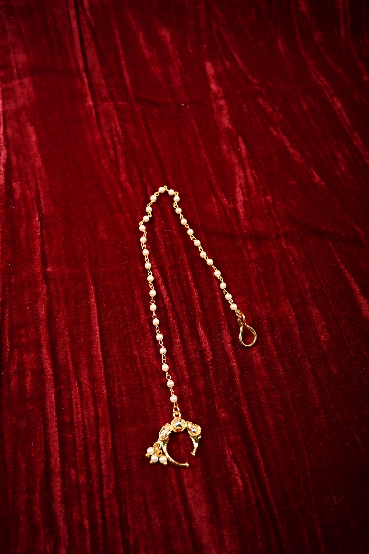 Make a regal bridal statement with this Statement Kundan Nath with Long Pearl Chain, beautifully handcrafted to reflect timeless tradition. Adorned with intricately set Kundan stones, the nath exudes royal elegance and classic charm. The long cascading pearl chain adds graceful movement and enhances its dramatic appeal, creating a perfect balance of sophistication and grandeur. Ideal for weddings, bridal ceremonies, and festive occasions, this exquisite nose ring pairs effortlessly with lehengas, sarees, and other traditional ensembles, completing your look with heritage-inspired beauty.