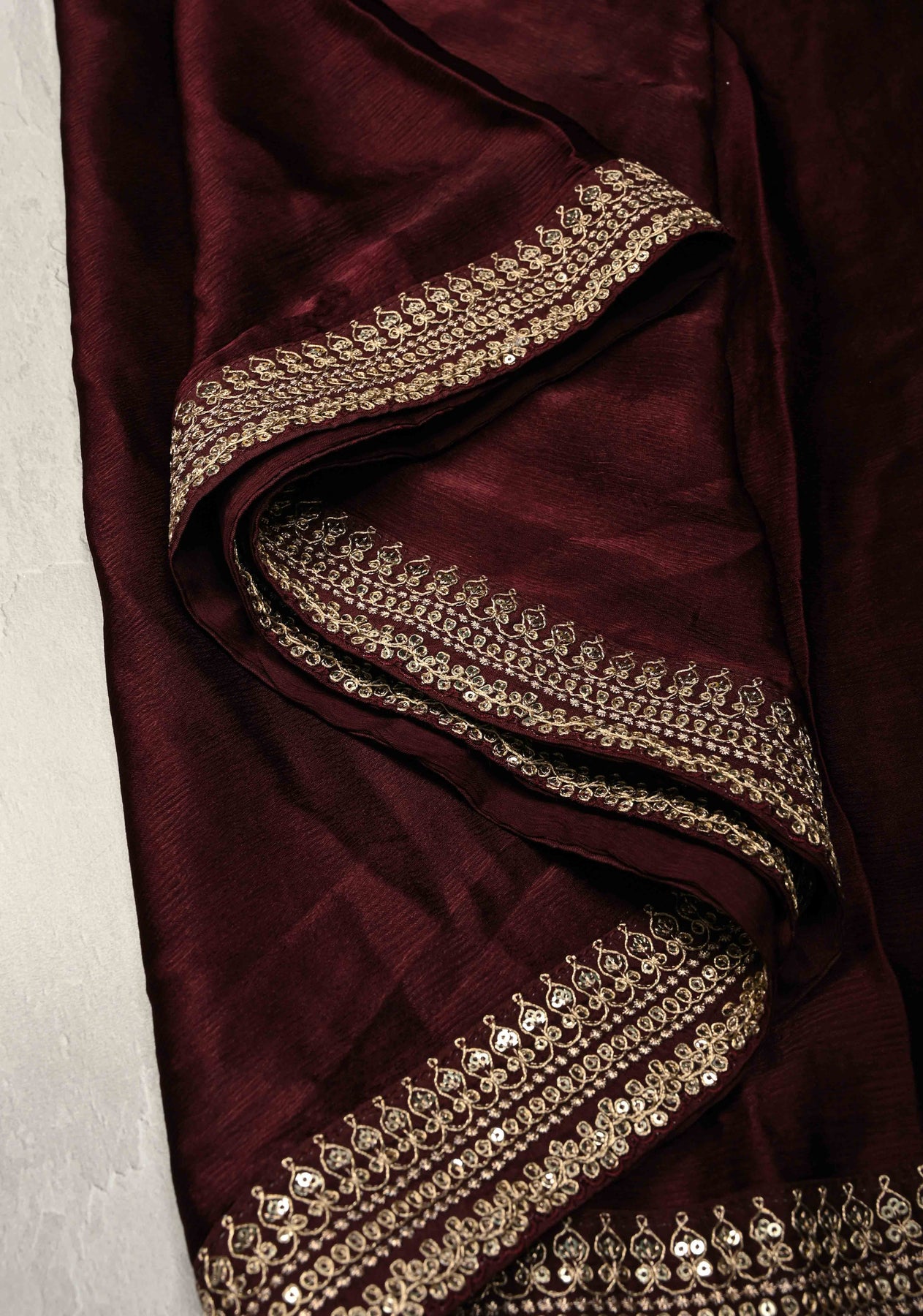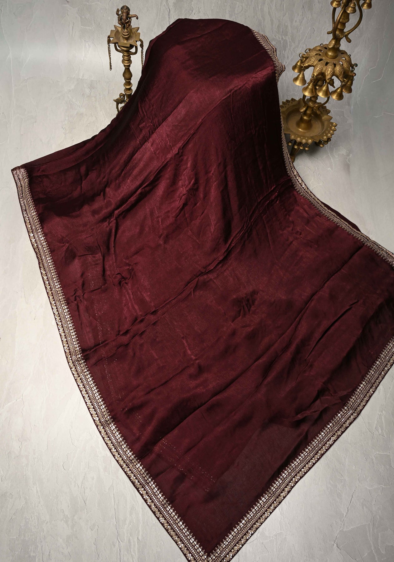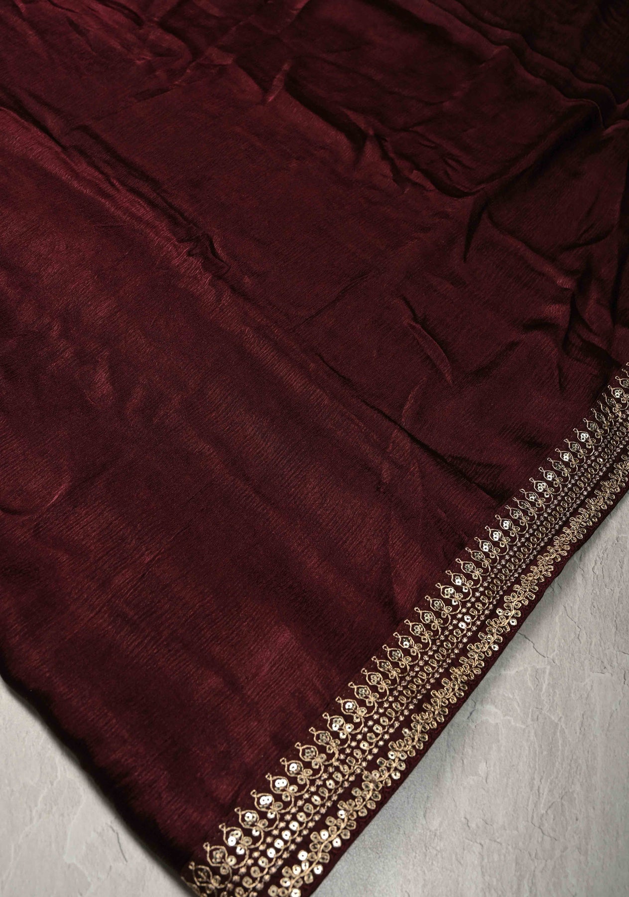 The Stunning Deep Burgundy Satin Georgette Saree is a beautiful fusion of luxury and understated elegance. Made from Deep Burgundy satin georgette, it offers a smooth, flowing drape with a subtle sheen that catches the light gracefully. The saree is enhanced with a fancy lace border, adding a refined touch of detail and femininity without overwhelming the overall look. Perfect for festive gatherings, formal events, or evening occasions, this saree is designed for those who appreciate classic style with a hint of modern charm.