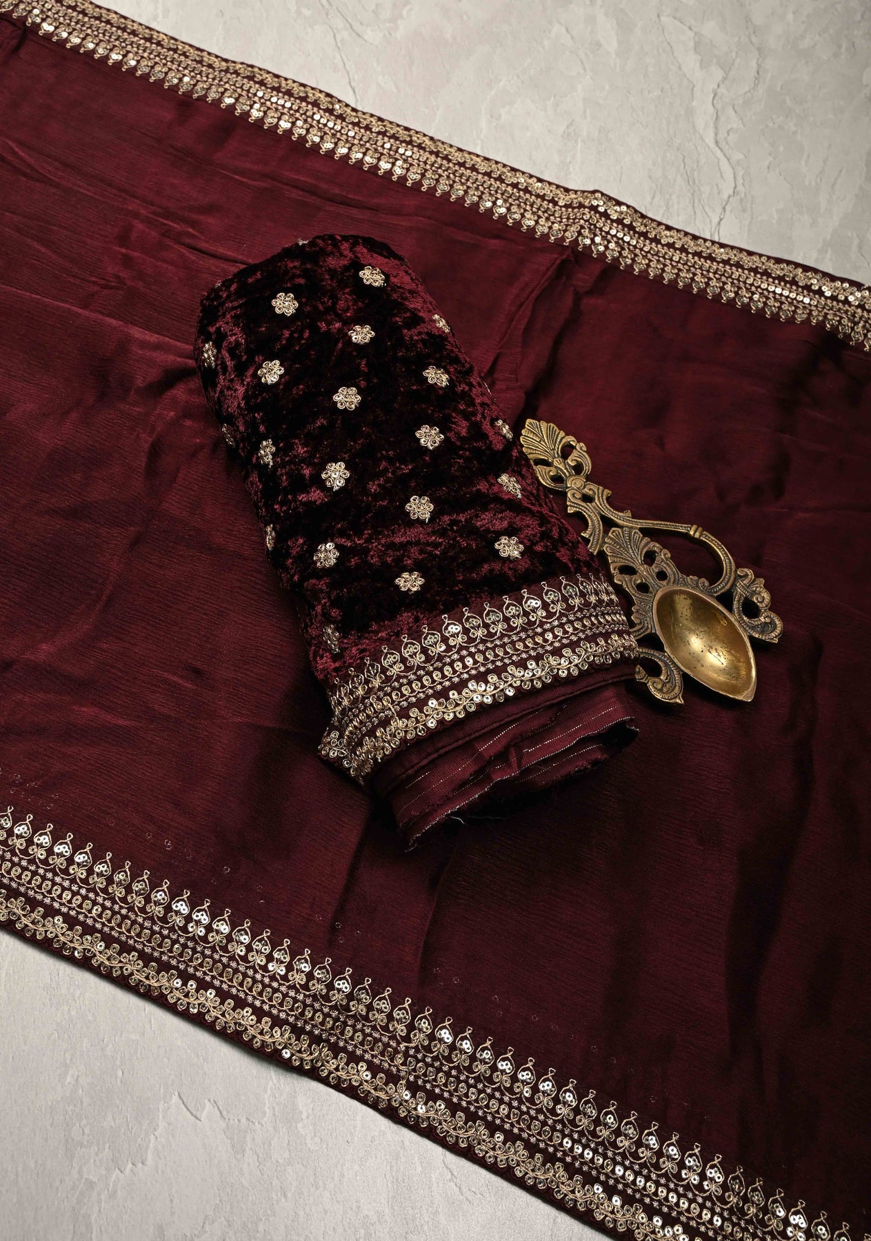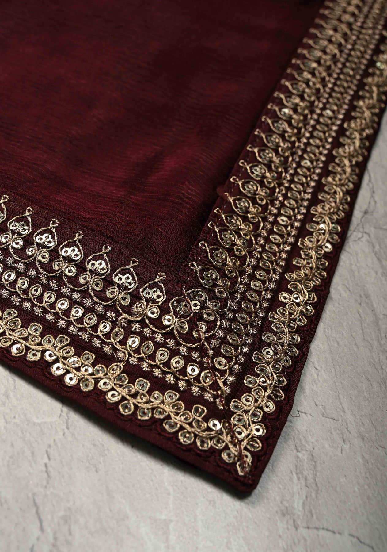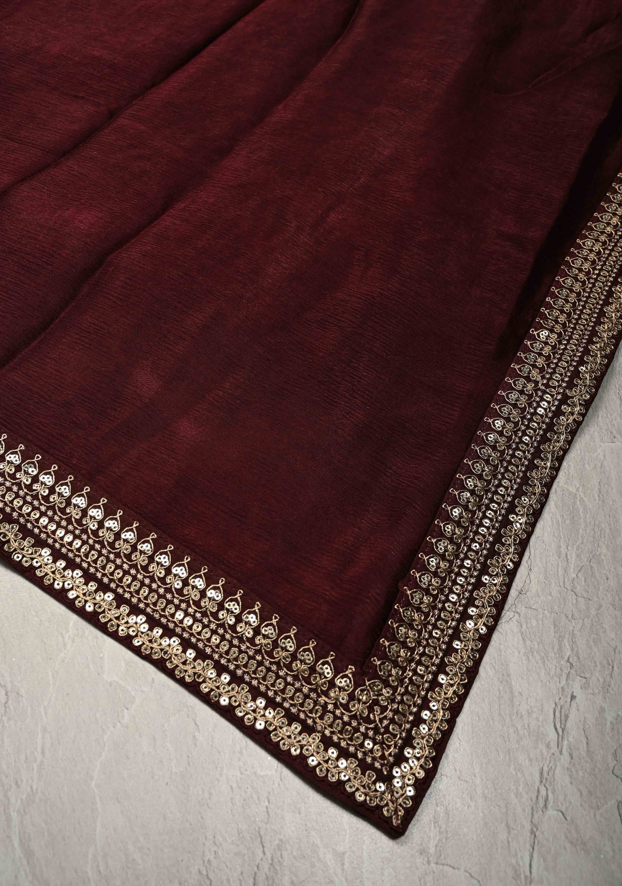 The Stunning Deep Burgundy Satin Georgette Saree is a beautiful fusion of luxury and understated elegance. Made from Deep Burgundy satin georgette, it offers a smooth, flowing drape with a subtle sheen that catches the light gracefully. The saree is enhanced with a fancy lace border, adding a refined touch of detail and femininity without overwhelming the overall look. Perfect for festive gatherings, formal events, or evening occasions, this saree is designed for those who appreciate classic style with a hint of modern charm.