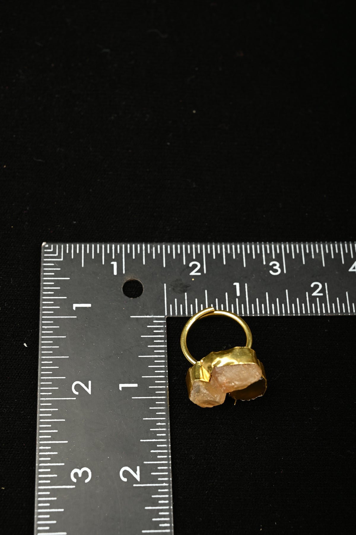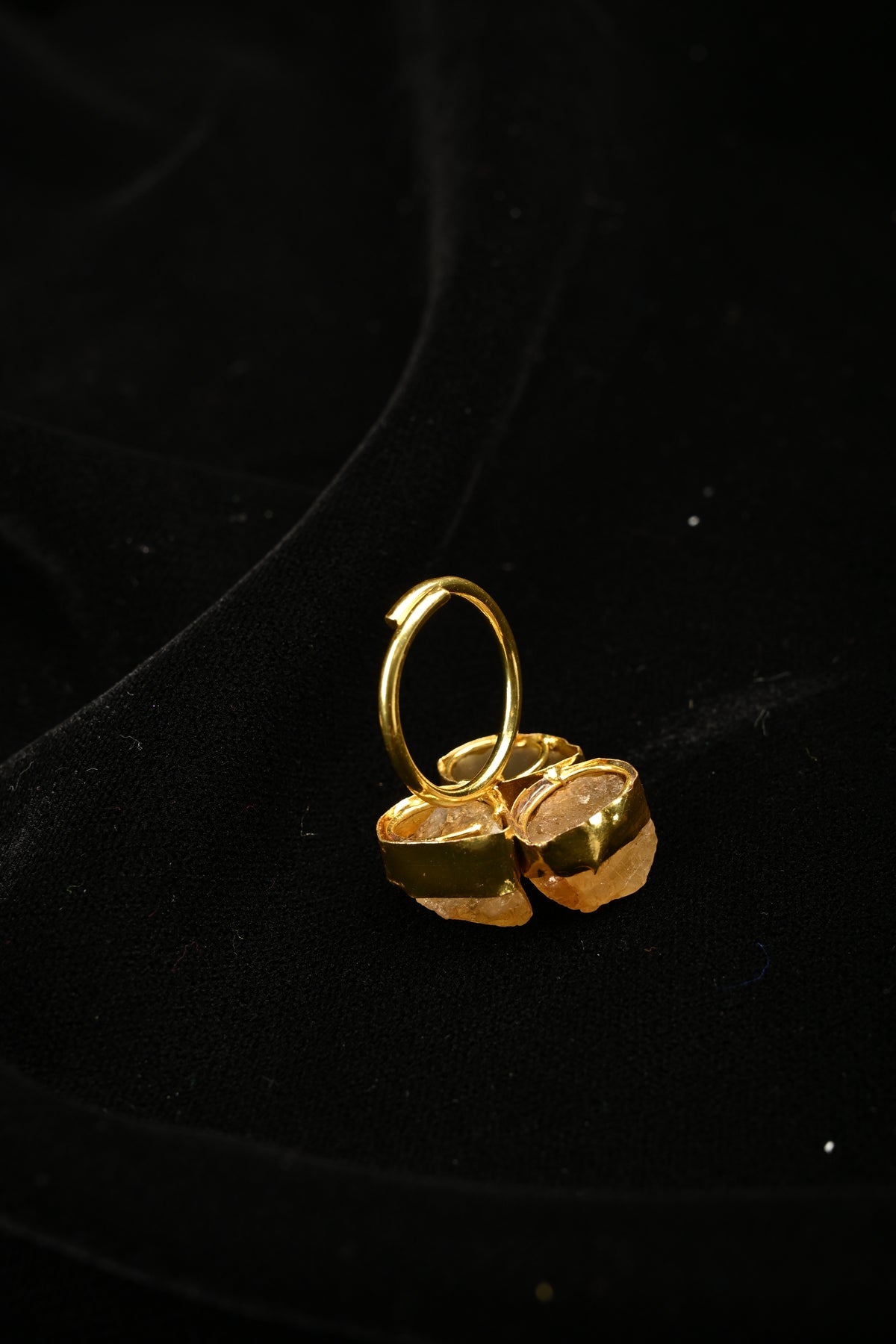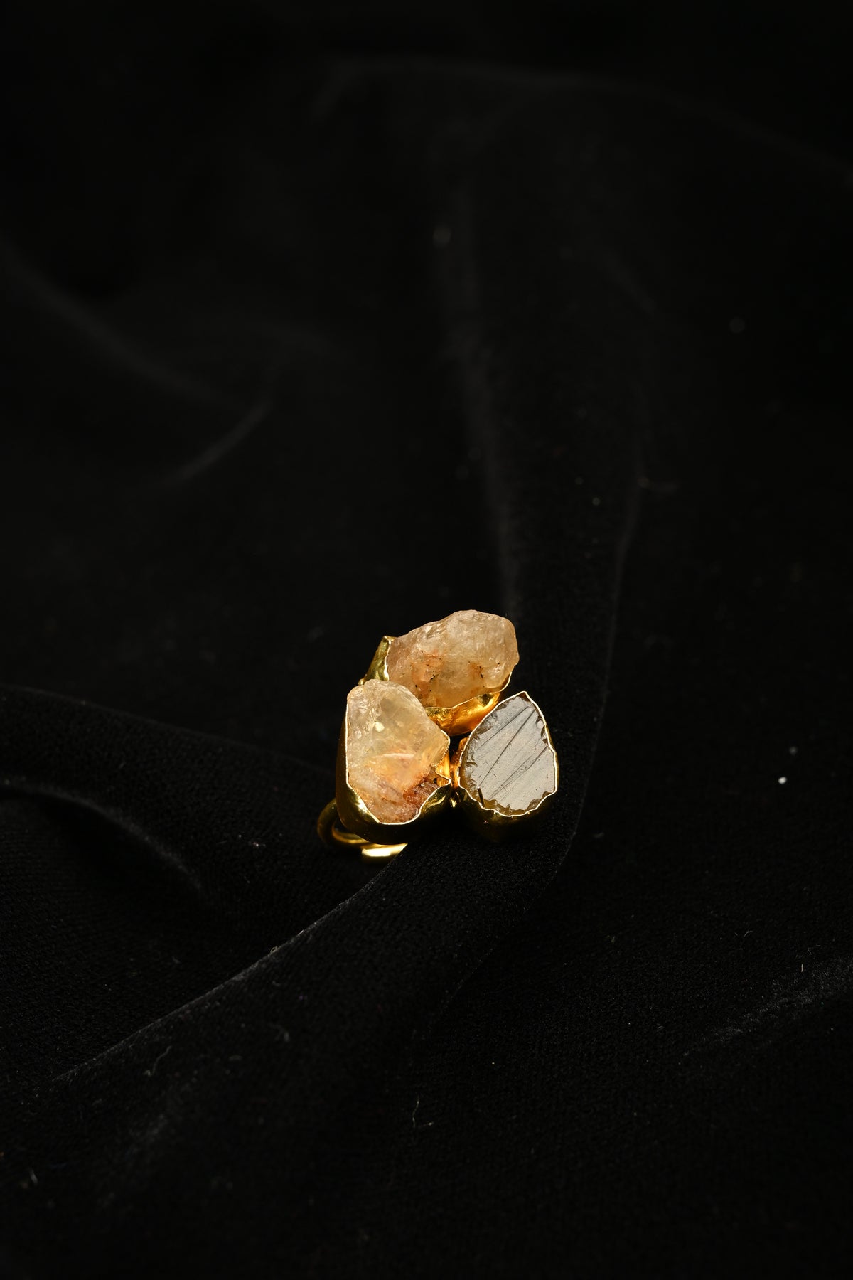 Artistic adjustable ring showcasing three raw citrine crystals and one milky white moonstone in an asymmetrical cluster, set in textured brass prongs that embrace their natural rough beauty. The open adjustable band fits sizes comfortably, ideal for multi-finger stacking, boho outfits, or as a unique everyday crystal accent.