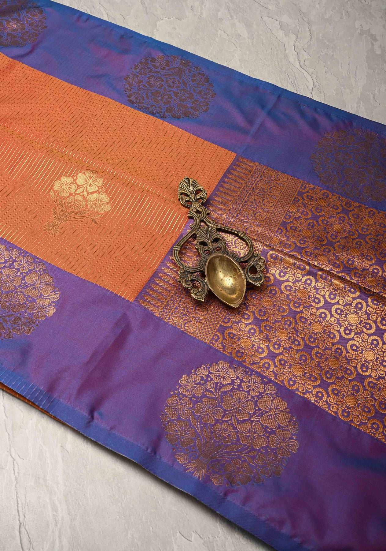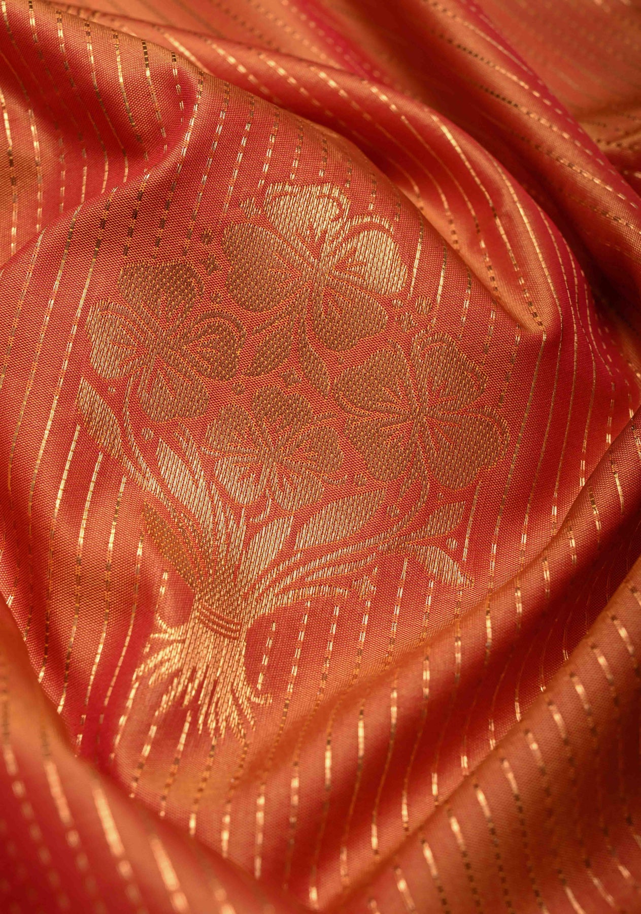 Sunset Orange Dual Tone Kanchi Semi Silk Saree with Vertical Stripes Zari Buttas  and Contrast Zari Border