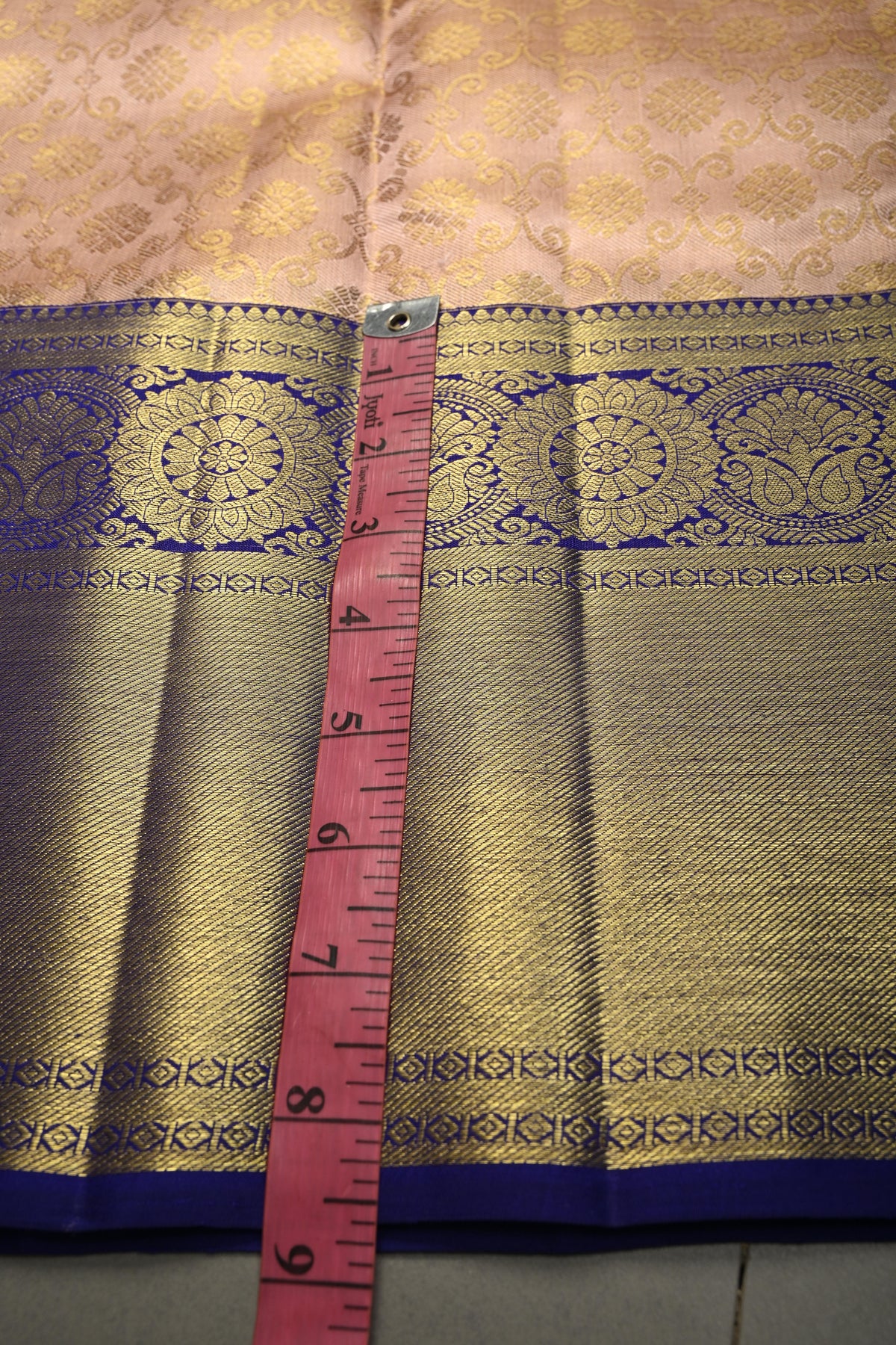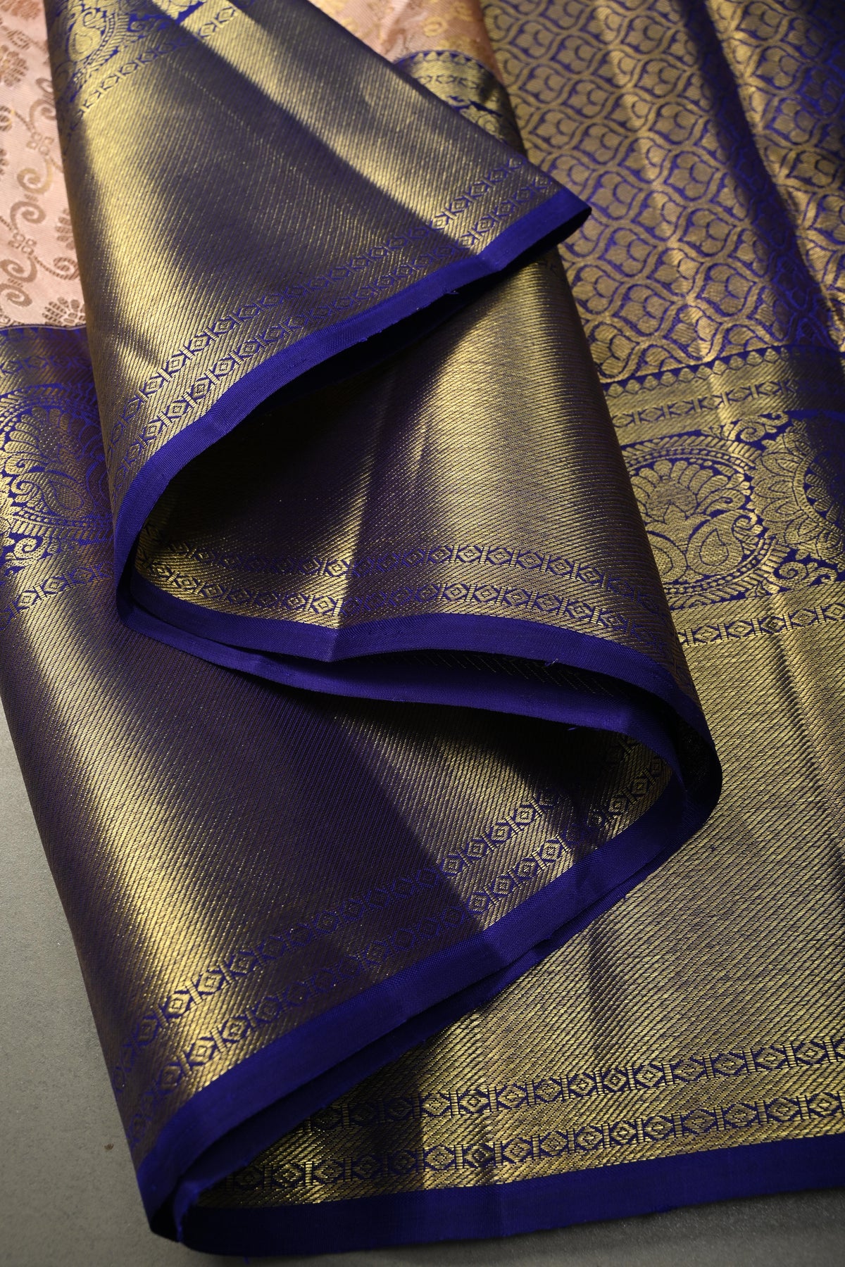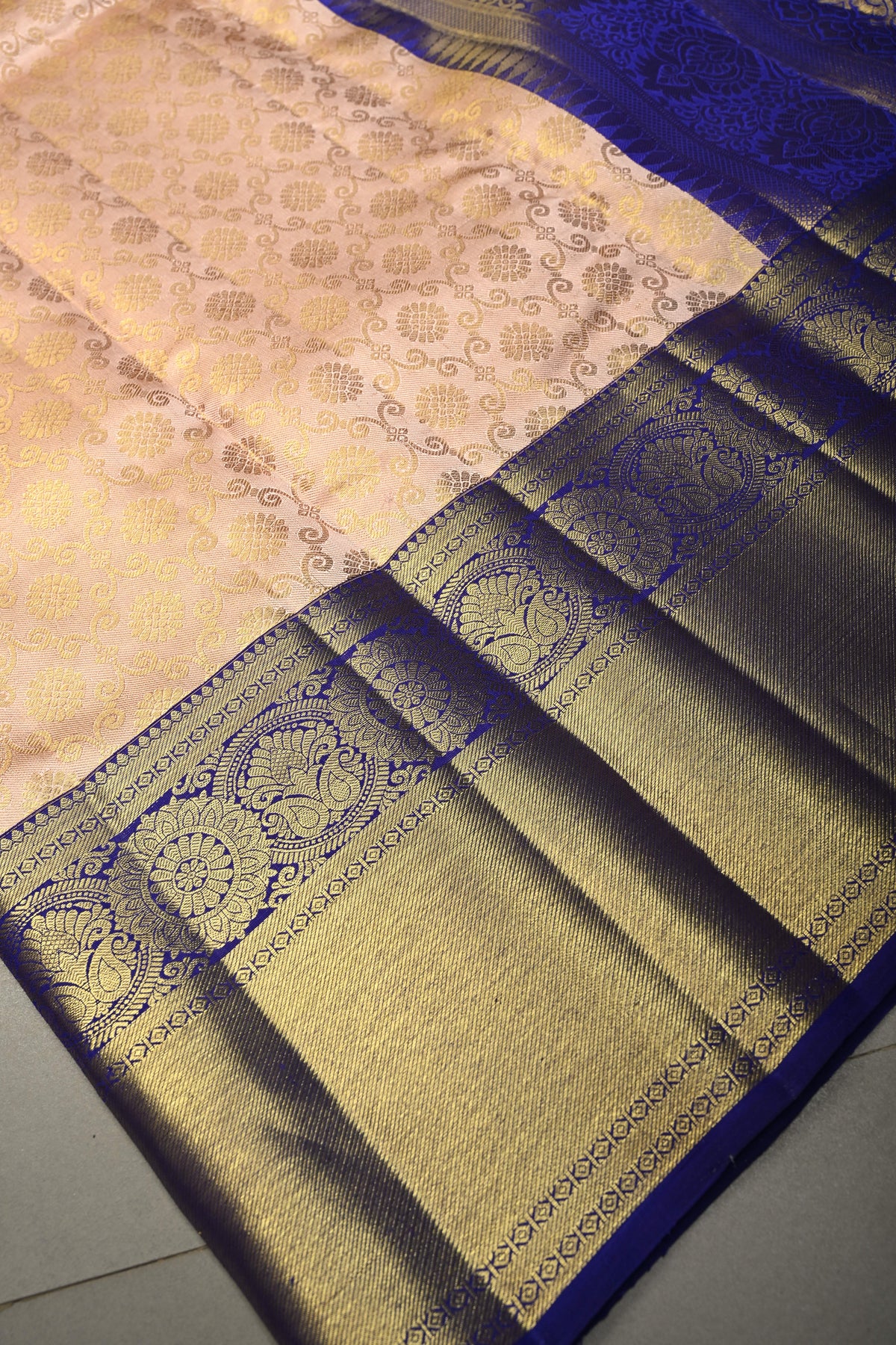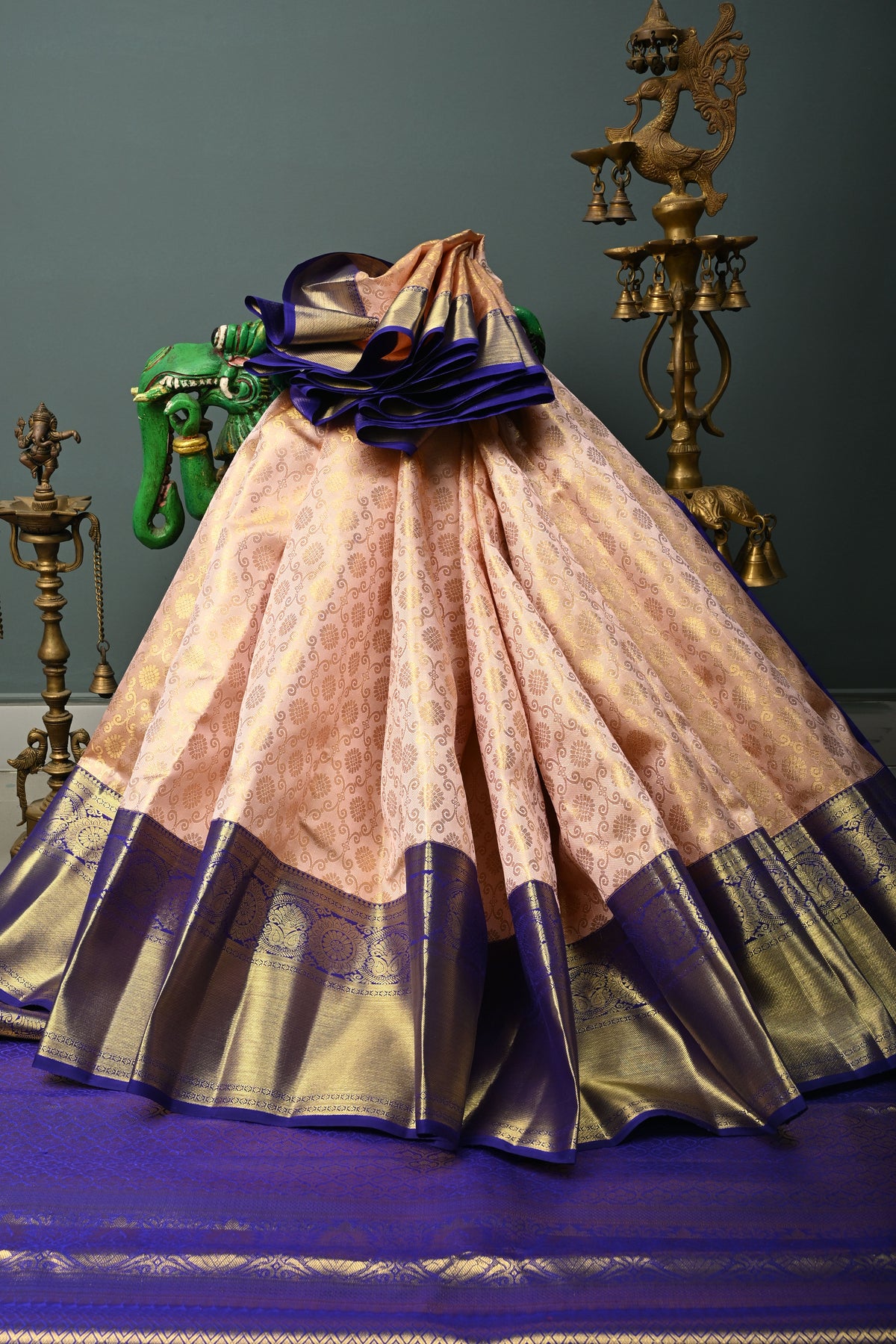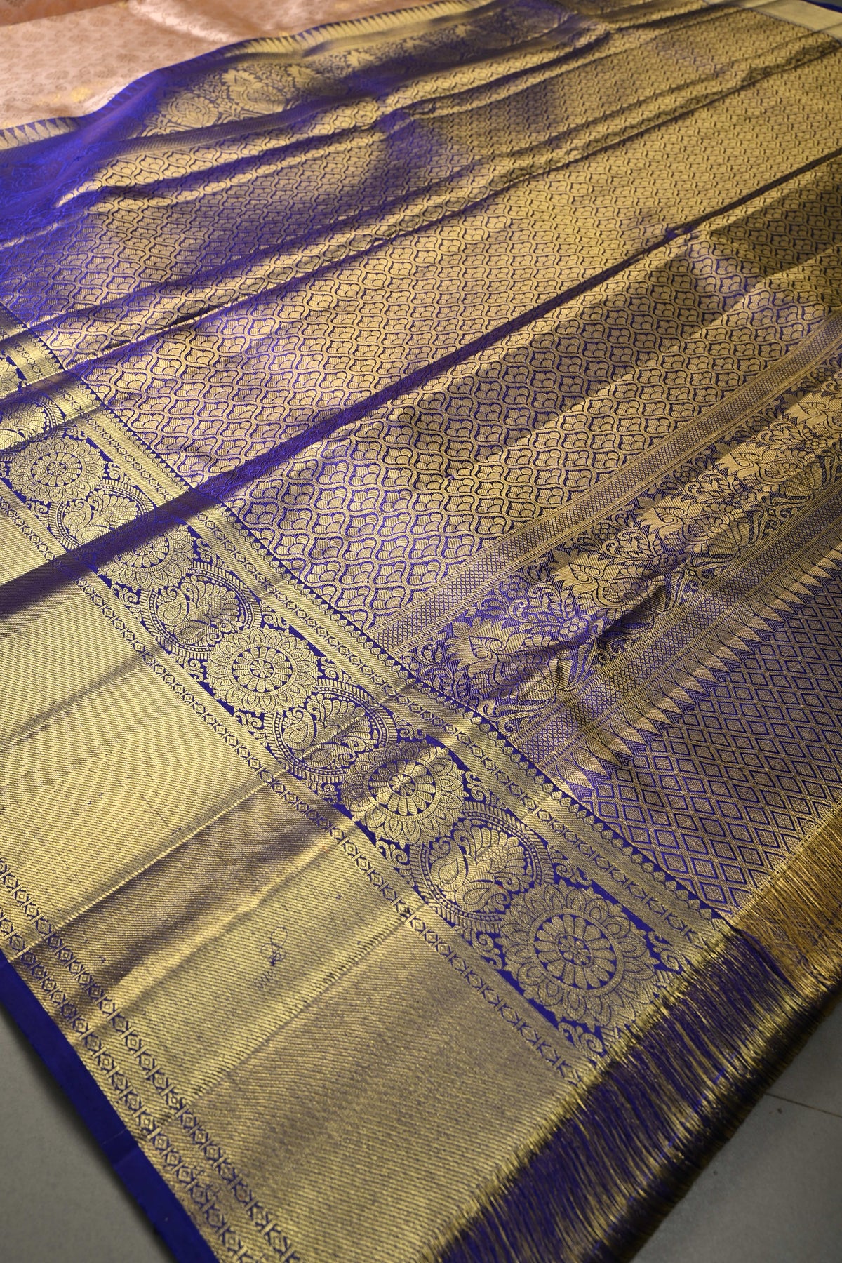 Embrace regal elegance with this Talambralu Blush Pink–Gold Pure Kanjivaram Tissue Silk Saree, a radiant blend of tradition and luxury. The blush pink base interwoven with luminous gold tissue creates a captivating dual-tone sheen, symbolizing grace and celebration. The body is adorned with an intricate brocade jaal that adds depth and grandeur, while the rich contrast zari border enhances its classic appeal with refined detailing. Woven from pure Kanjivaram tissue silk, this saree offers a structured yet fluid drape, making it an exquisite choice for weddings, bridal ceremonies, and auspicious occasions. A true heirloom-worthy piece, it reflects timeless craftsmanship and opulent charm.