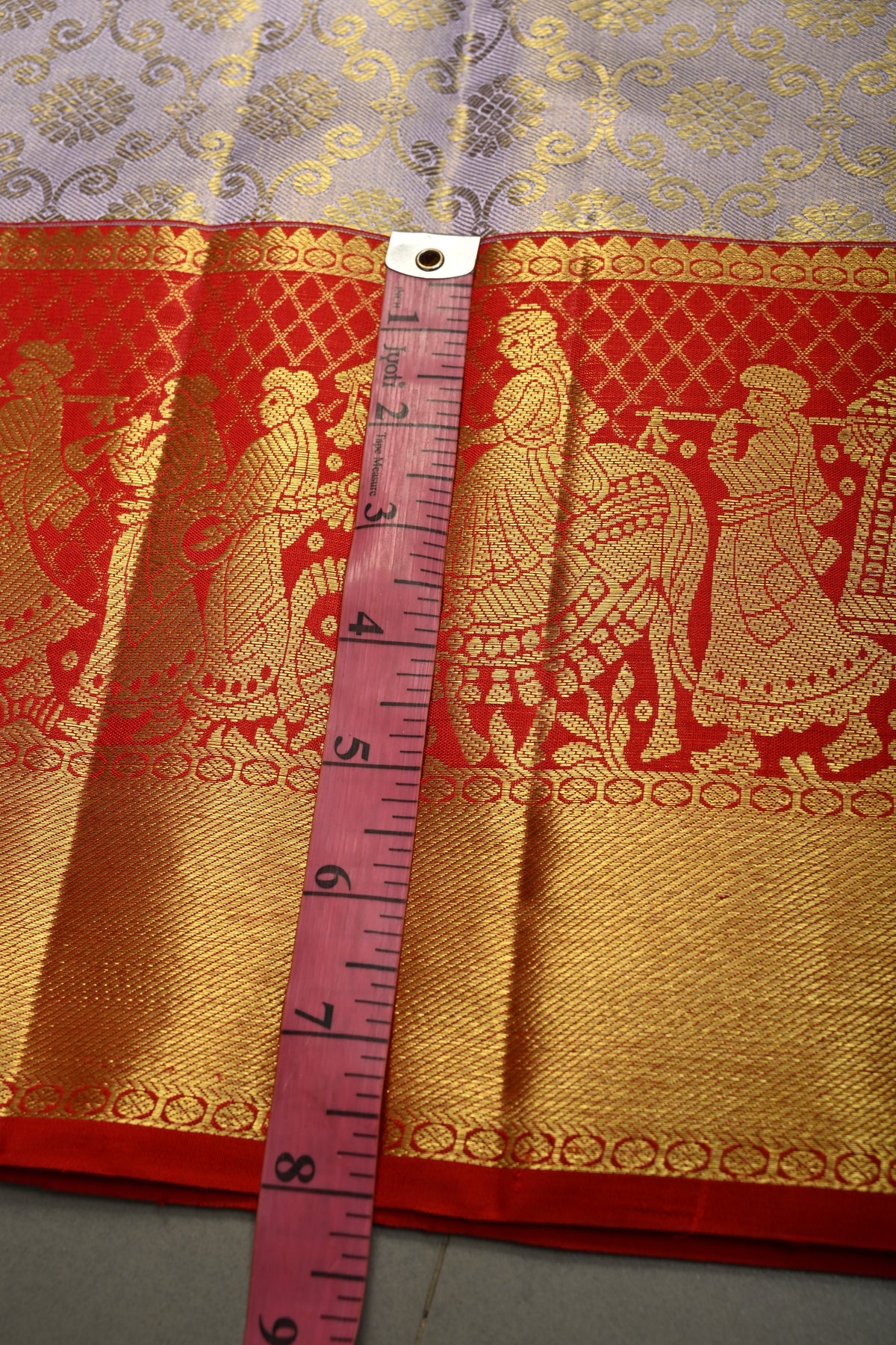 Step into timeless elegance with this Talambralu Lilac–Gold Pure Kanjivaram Tissue Silk Saree, a radiant creation that beautifully blends softness with grandeur. The delicate lilac hue interwoven with luminous gold tissue lends a graceful dual-tone shimmer, creating a refined yet festive appeal. The body is enriched with an intricate brocade jaal that adds texture and regal depth, while the striking contrast Doli-Baraat zari border showcases traditional celebratory motifs, symbolizing joy and auspicious beginnings. Expertly woven from pure Kanjivaram tissue silk, this saree offers a structured drape, rich sheen, and heirloom-worthy craftsmanship—perfect for weddings, bridal ceremonies, and grand occasions.