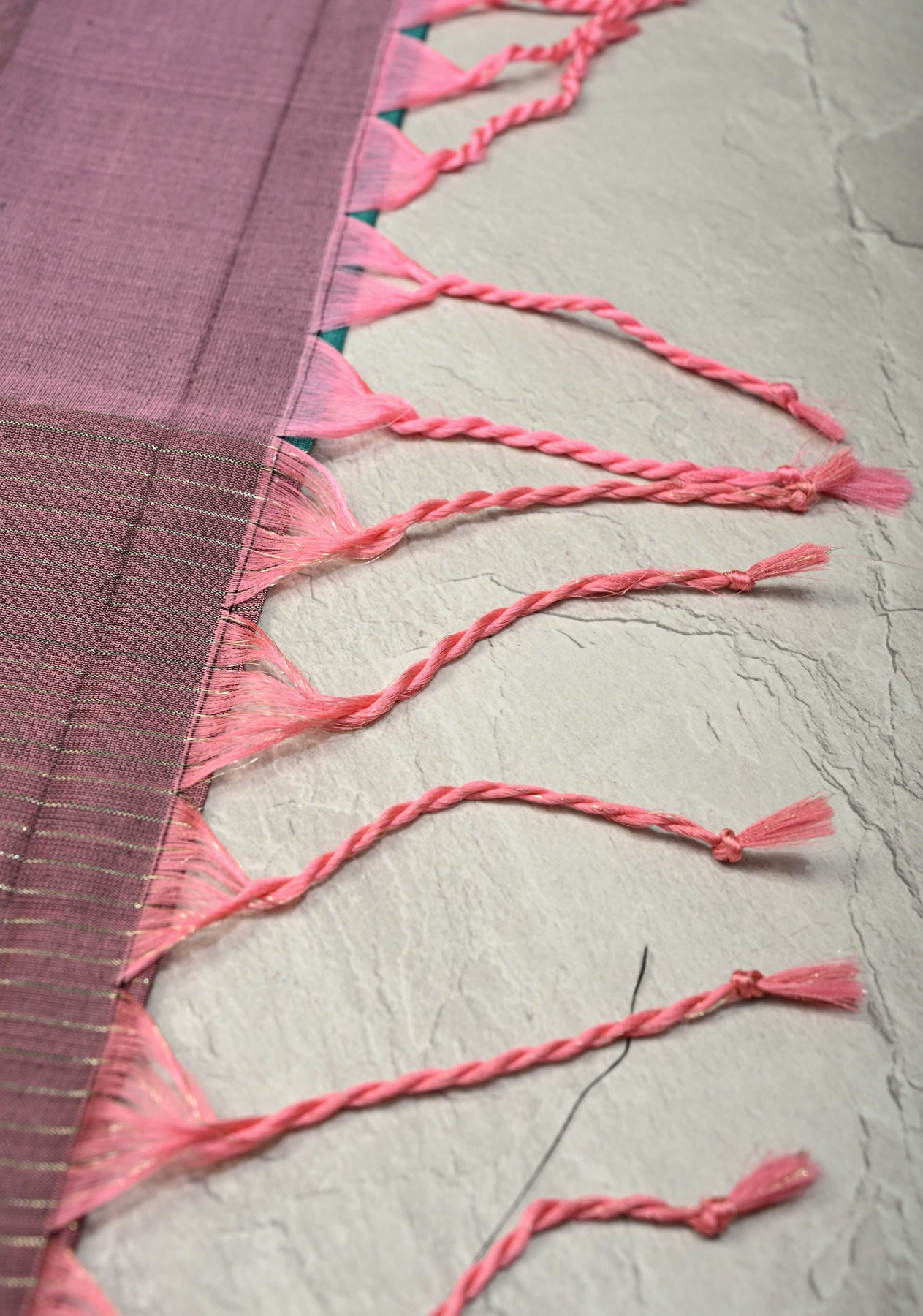 This saree is ready to wear with fall and pico done. Handmade silk tassels as seen in the pic adorn the pallu and add more grace to it. An unstitched blouse fabric is included.