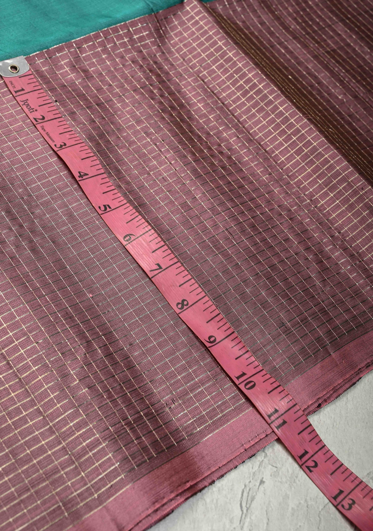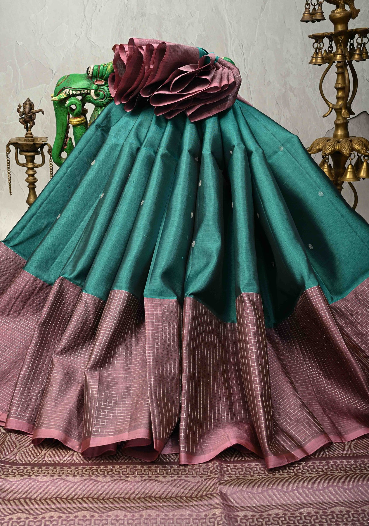 The teal body is beautifully accented with delicate silver polka dots, adding a subtle shimmer and modern charm. Completing the look is a contrast wide checks border, which introduces a bold, structured element while retaining classic appeal. Perfect for weddings, festive occasions, and sophisticated ethnic gatherings, this saree is a versatile addition to your wardrobe.