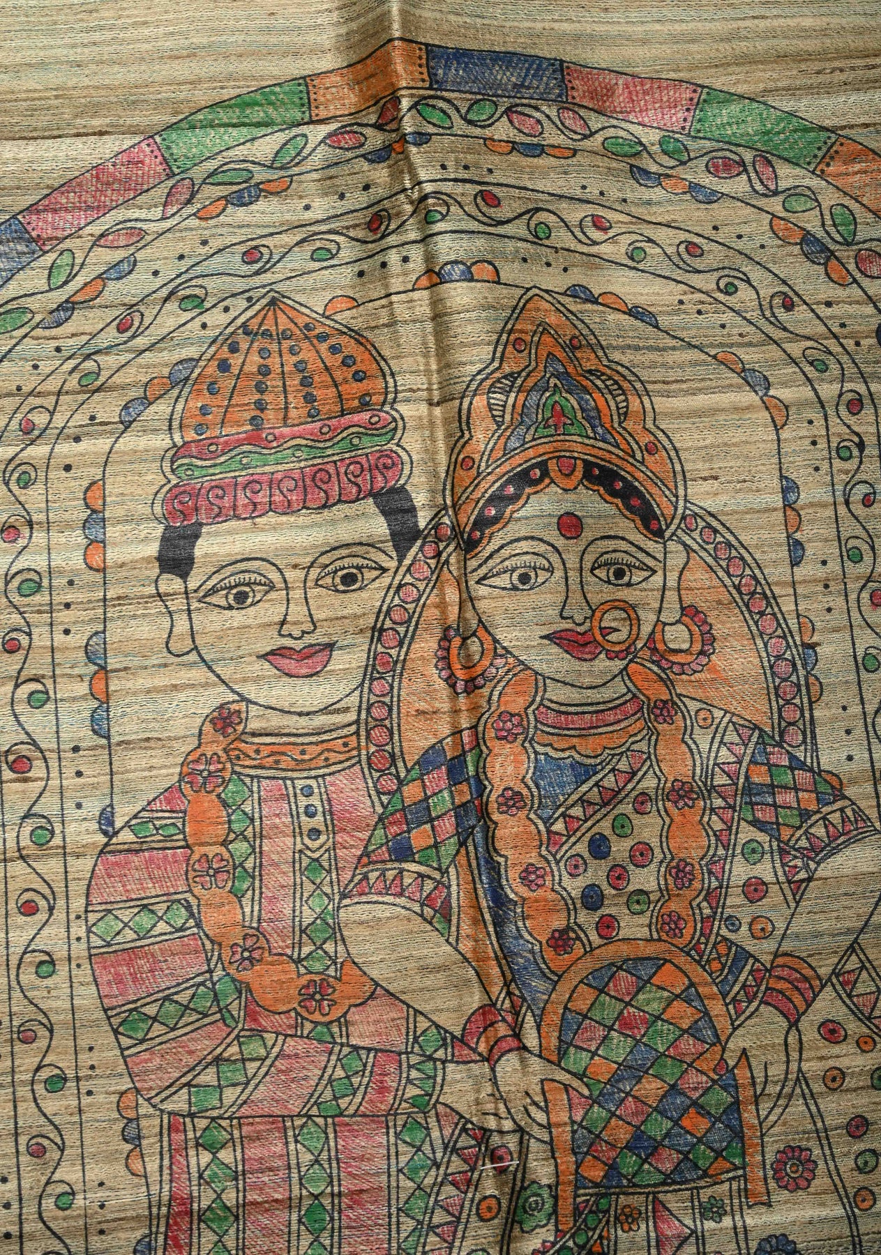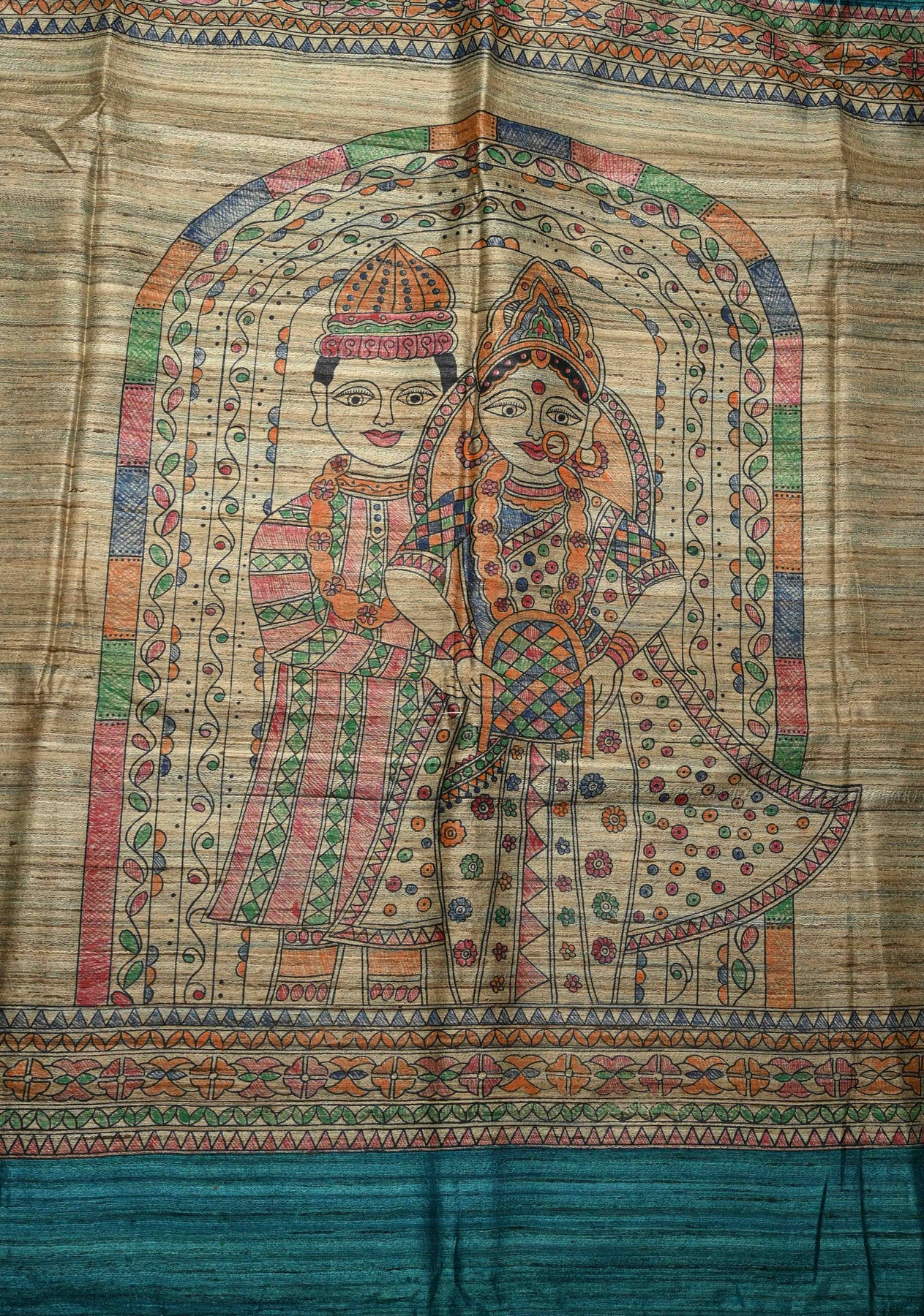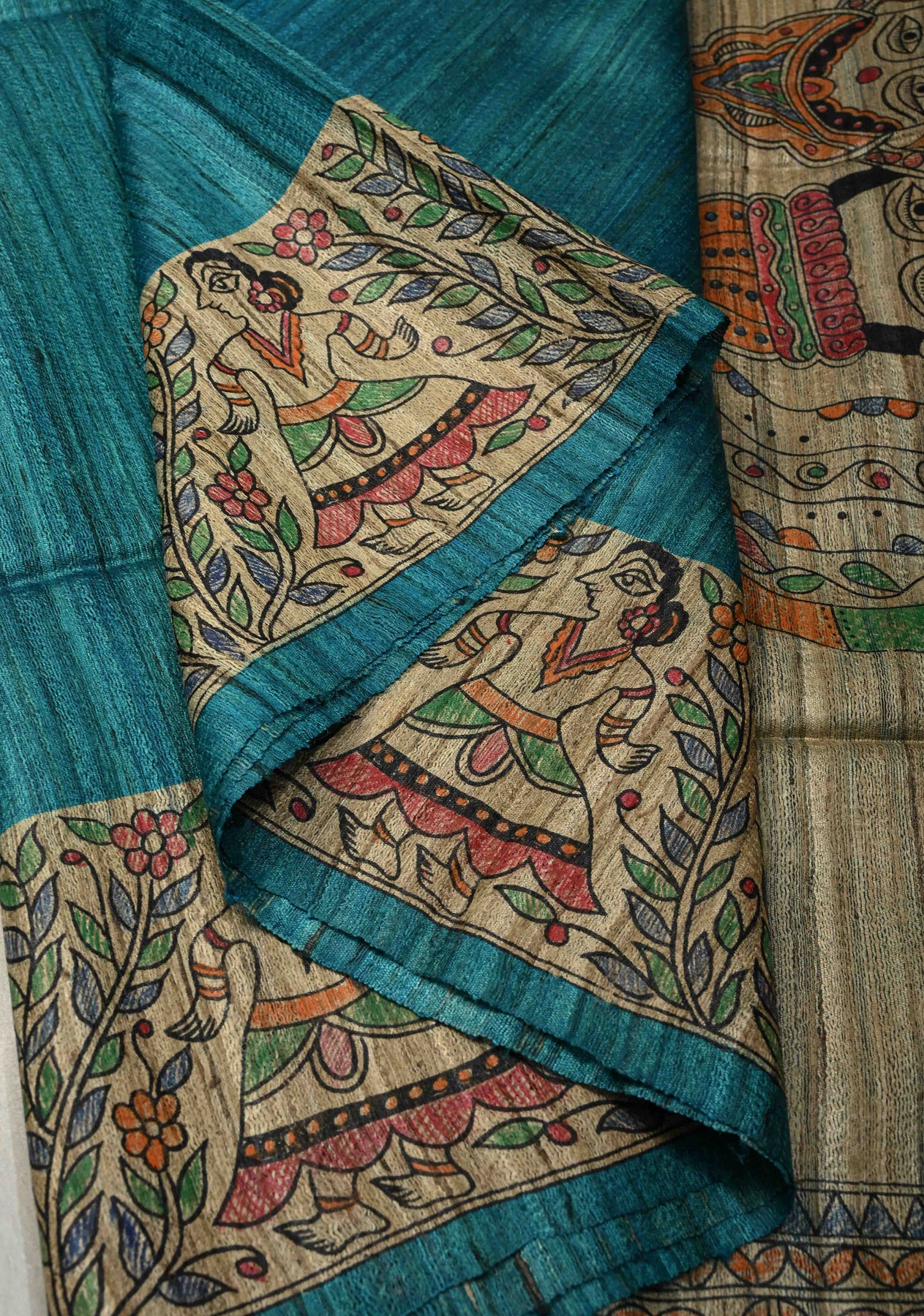 Teal Madhubani hand painting on Neelam Katha Ghicha Silk Saree | SILK MARK CERTIFIED
