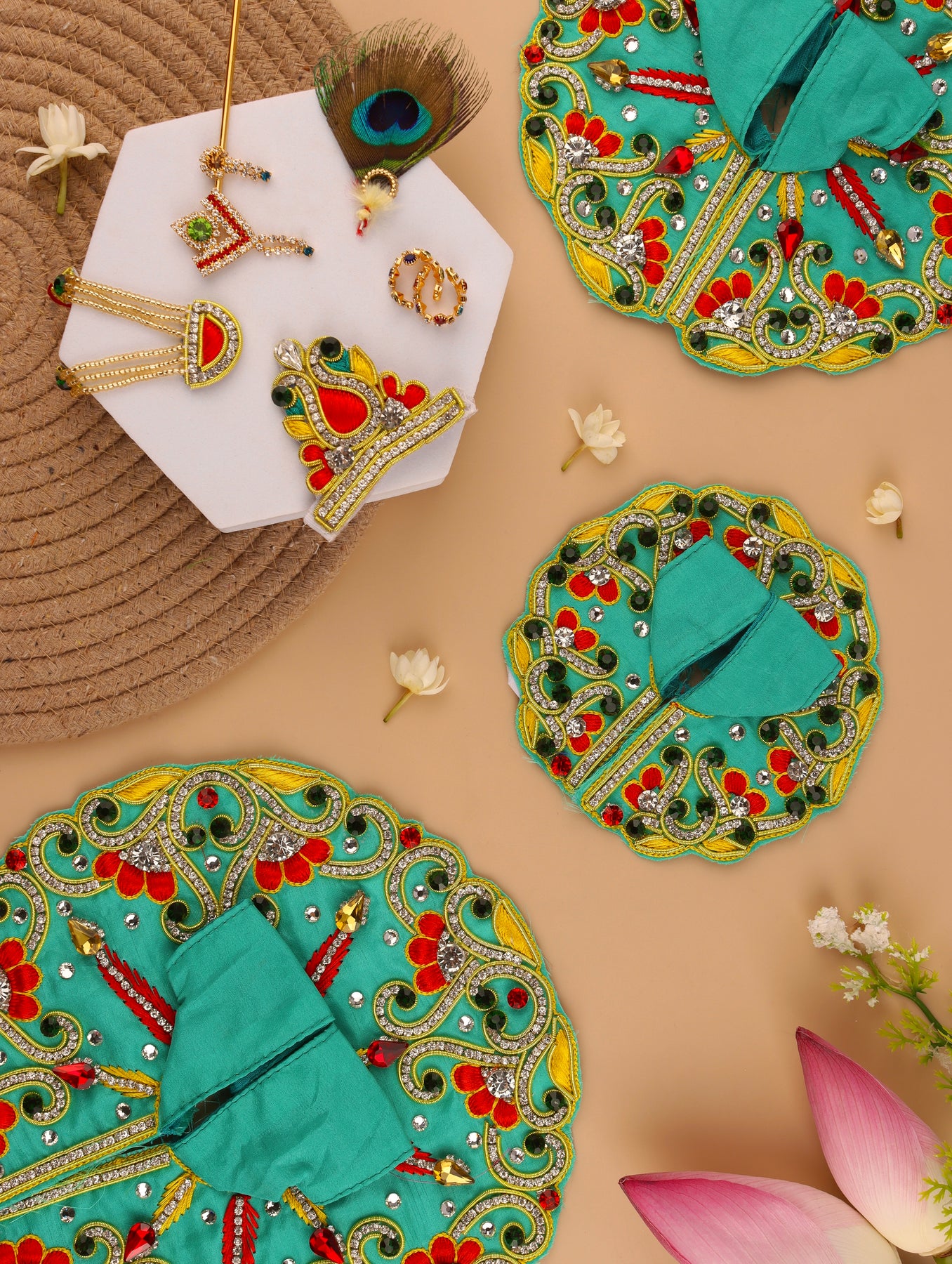 Celebrate the playful charm of Kanha with the Makhan Chor Poshak. This classic teal green Poshak is adorned with golden zari, emerald green, red and silver crystals, and intricate yellow and red embroidery representing the shape of a Matki. The set features contrasting red and green embellished Bangles and Bansi, along with matching handcrafted Mala and Mukut for your Thakur Ji. Packed in a golden fabric pouch, this Poshak will add a delightful touch to your mandir, capturing the essence of the beloved Makhan Chor.