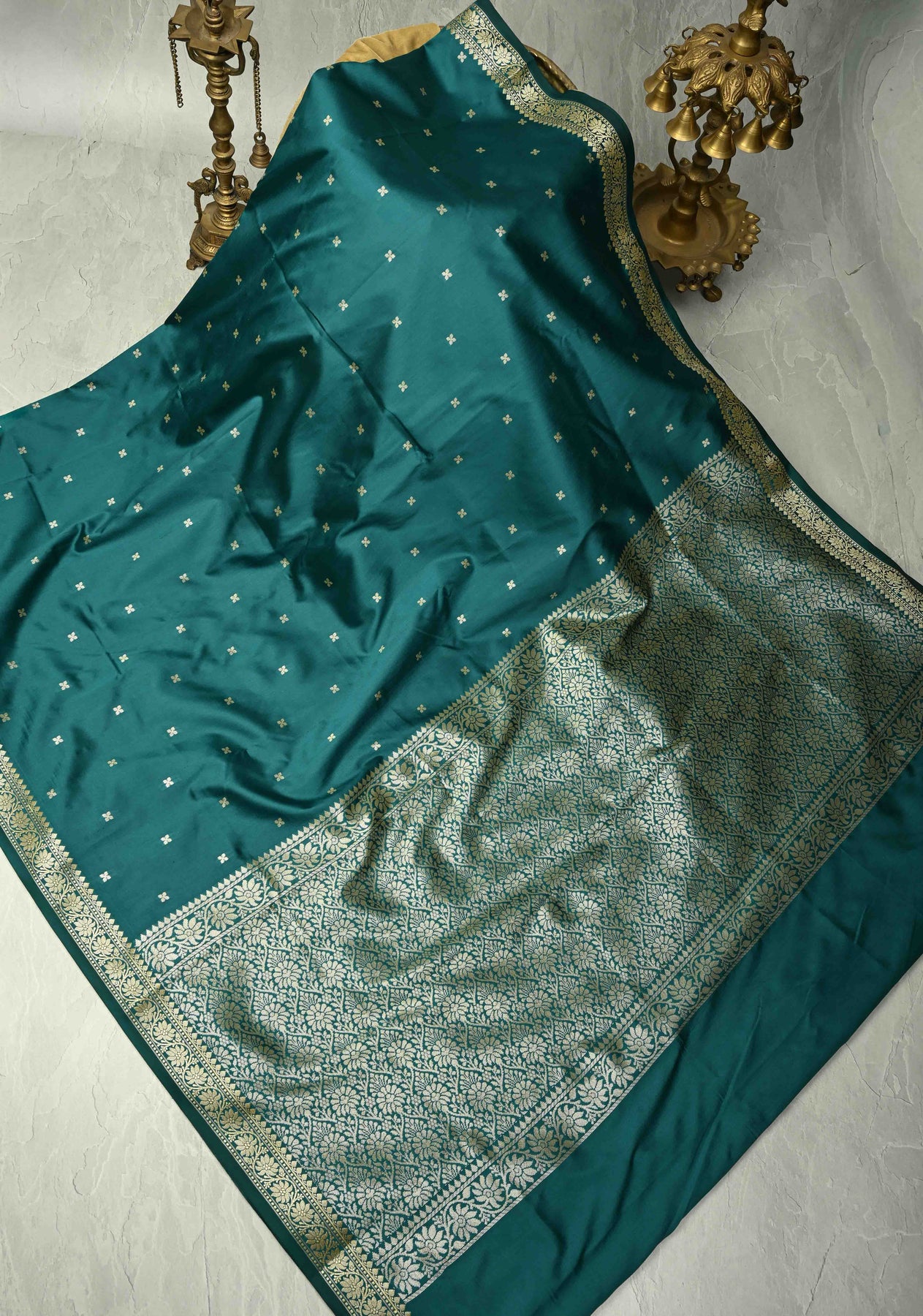 The Teal Semi Silk Saree with Chunri Buttis is a stunning blend of modern elegance and traditional charm. Crafted from semi-silk fabric, this saree drapes beautifully, offering both comfort and sophistication. The subtle yet intricate chunri butti pattern scattered across the fabric adds a timeless touch, while the minimal zari border provides a gentle hint of sparkle. The teal color enhances its allure, making it an ideal choice for a variety of occasions—whether it’s a festive gathering, a family celebration, or an evening event where you want to exude quiet elegance with a pop of color.