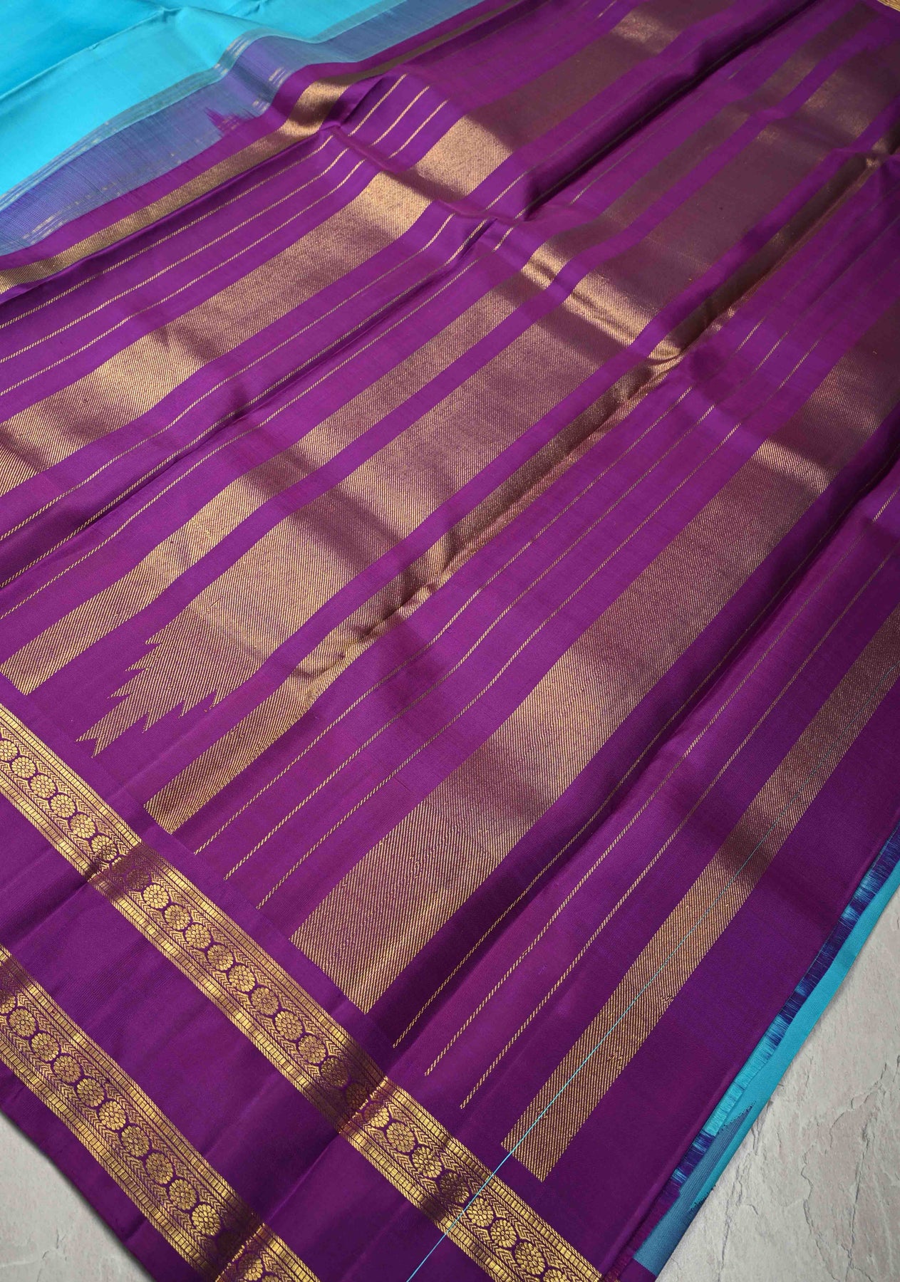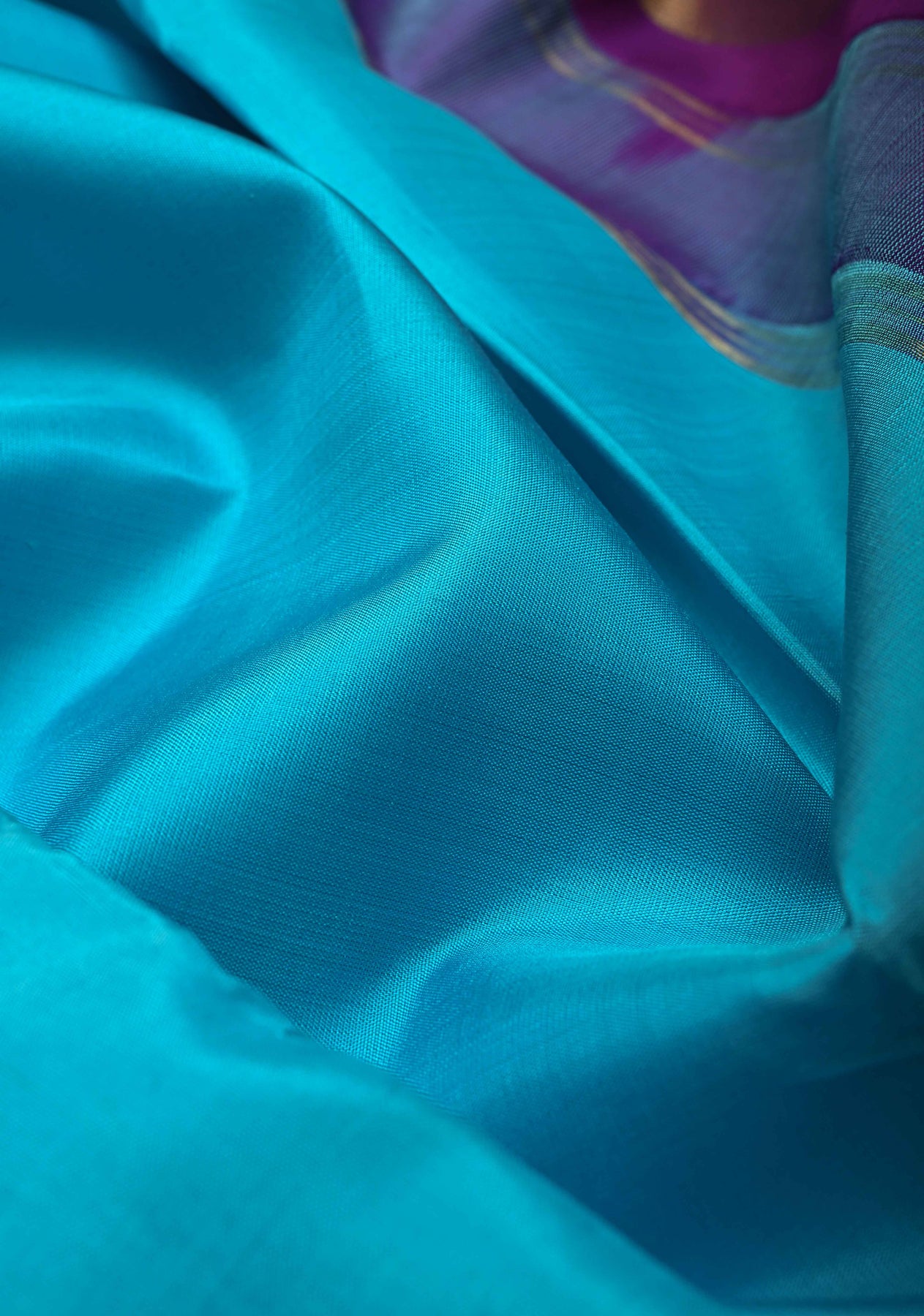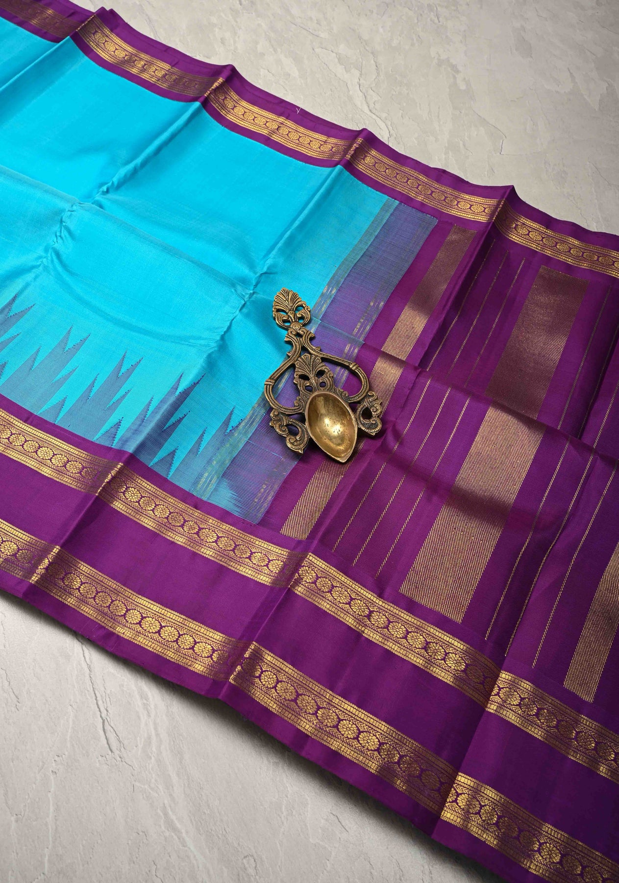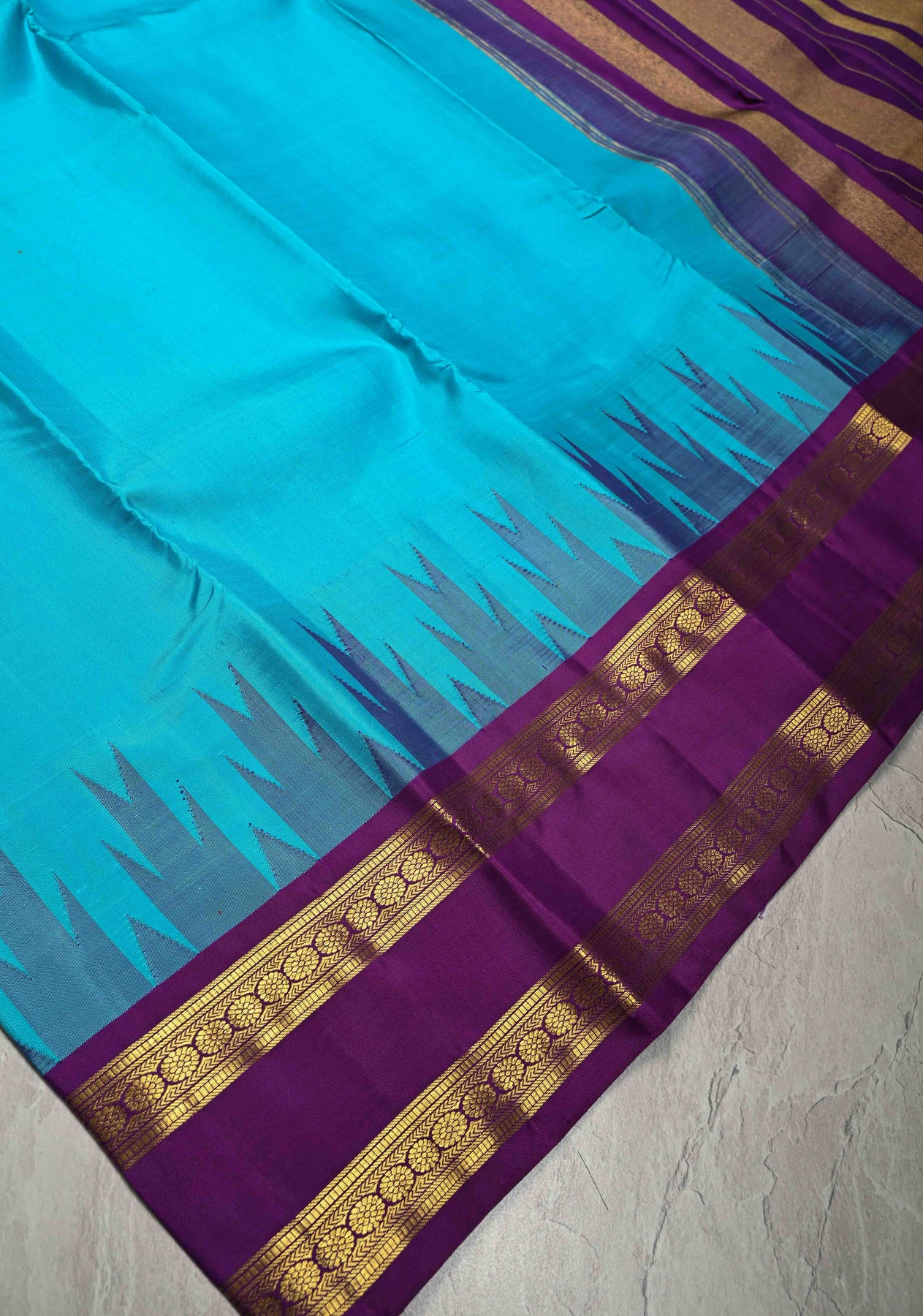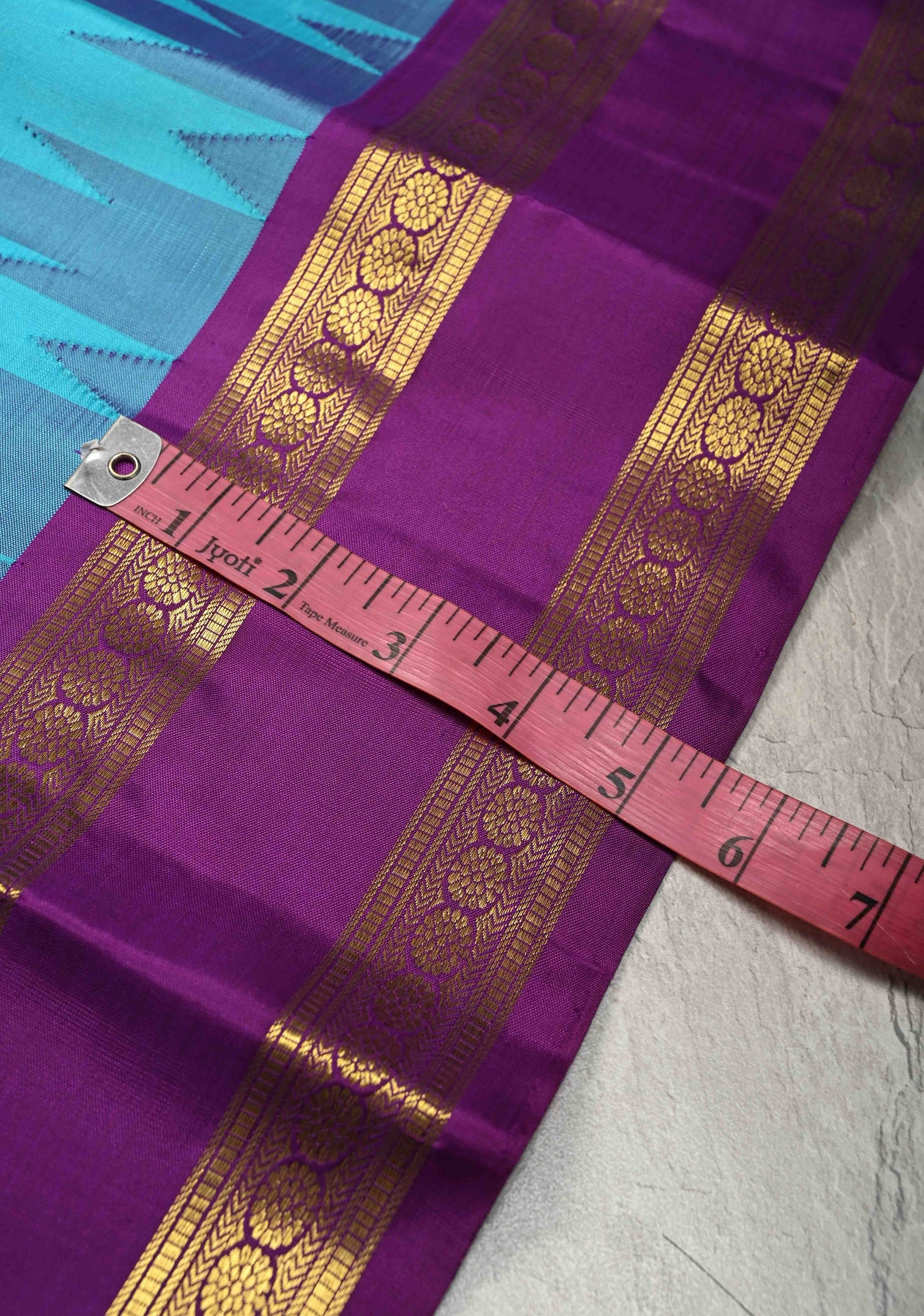 Make a regal statement with this Turquoise Blue Kanjivaram Pure Silk Saree, exquisitely handwoven to showcase the timeless beauty of South Indian craftsmanship. The saree is accentuated by a striking Contrast Temple Rettaipet Zari Border, featuring traditional triangular motifs in rich zari work that highlight the heritage of Kanjivaram weaving. Ideal for weddings, festivities, and grand celebrations, this saree offers a perfect blend of vibrant color, intricate detailing, and cultural elegance