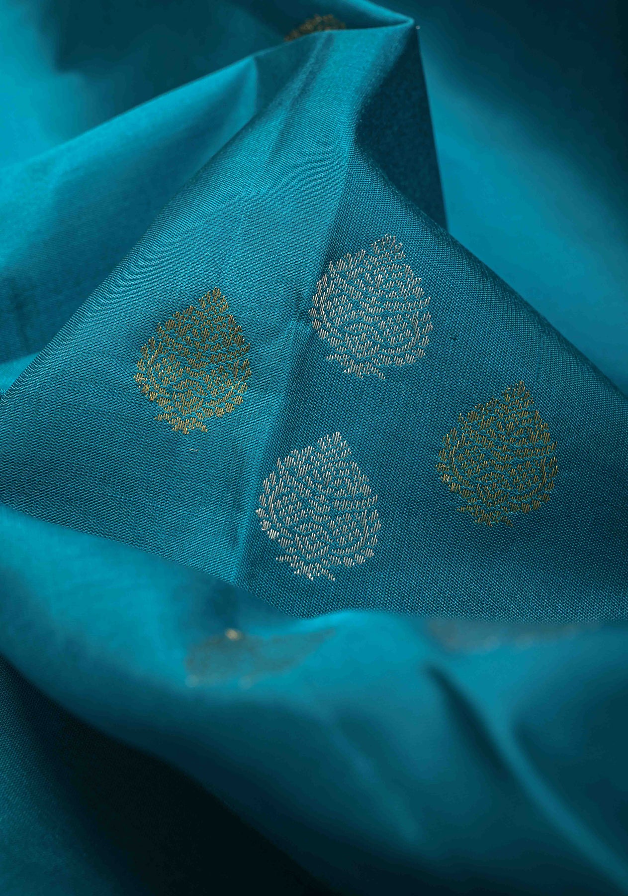 The Turquoise Blue Pure Kanjivaram Soft Silk Saree is a captivating blend of vibrant elegance and traditional craftsmanship. Woven from pure soft Kanjivaram silk, this saree features a radiant turquoise blue base that exudes freshness and sophistication. The body is adorned with exquisite gold–silver floral buttas, delicately woven to create a subtle shimmer and refined charm. Enhancing its grandeur is the intricately crafted Rangkaat style border, showcasing harmonious color blending and classic artistry. With its smooth texture, graceful drape, and timeless appeal, this saree is an ideal choice for weddings, festive celebrations, and special occasions that call for elegance rooted in tradition