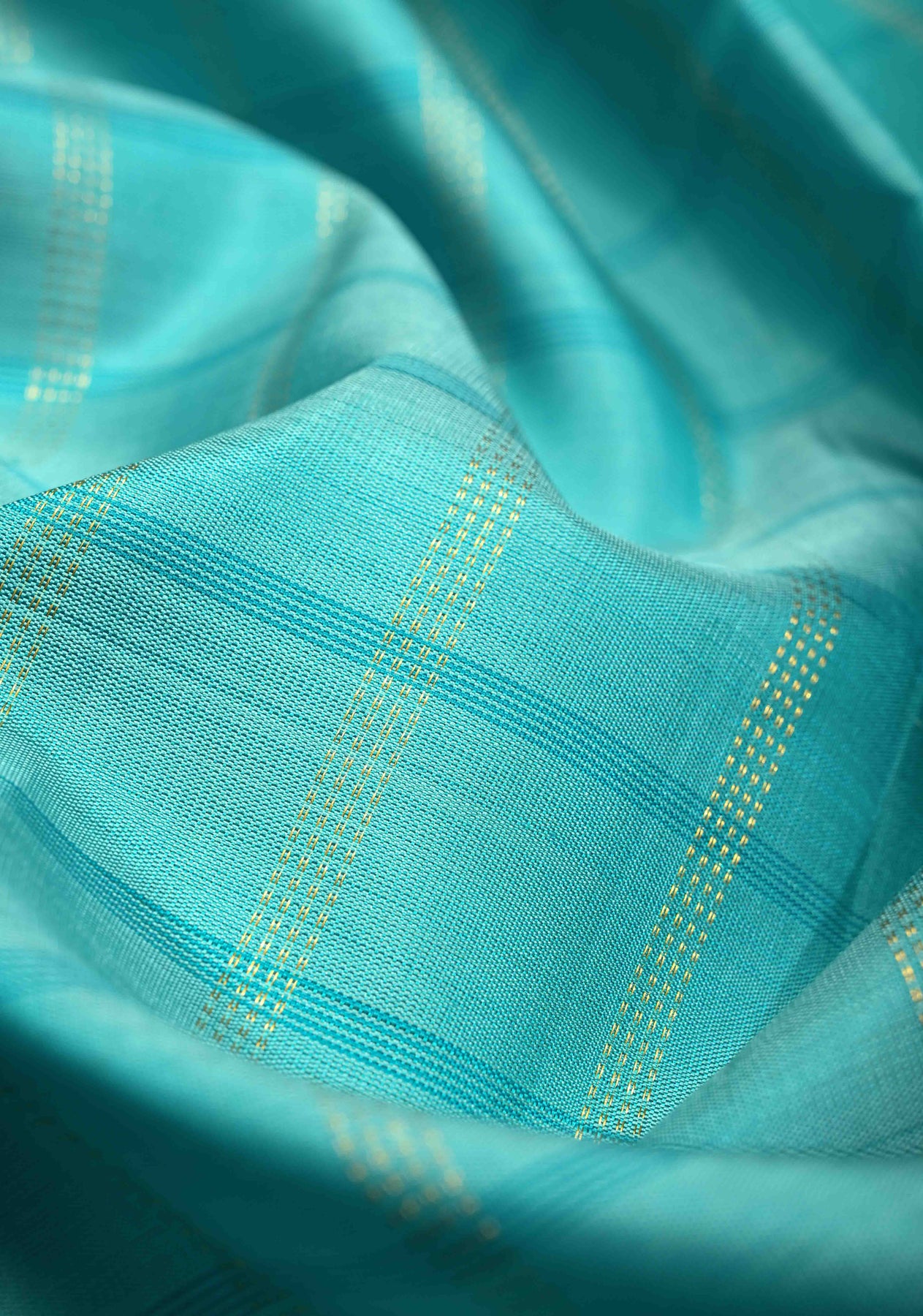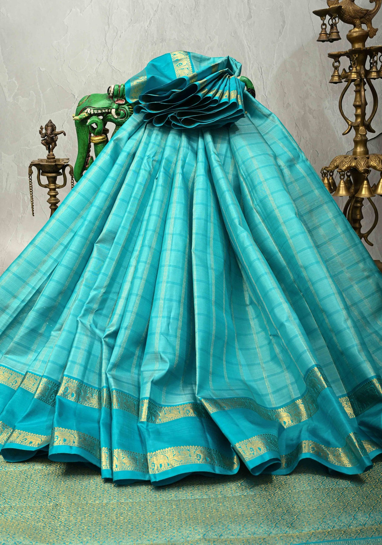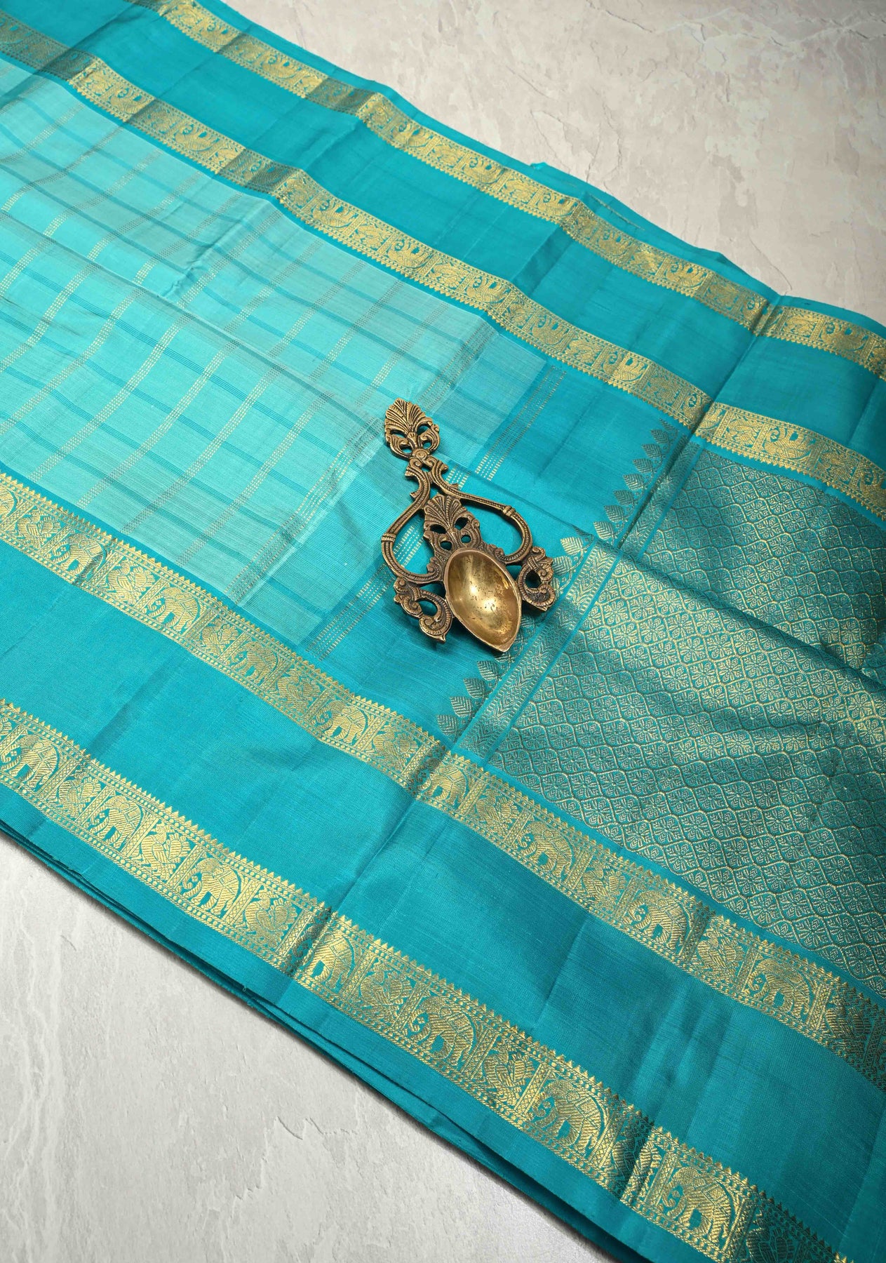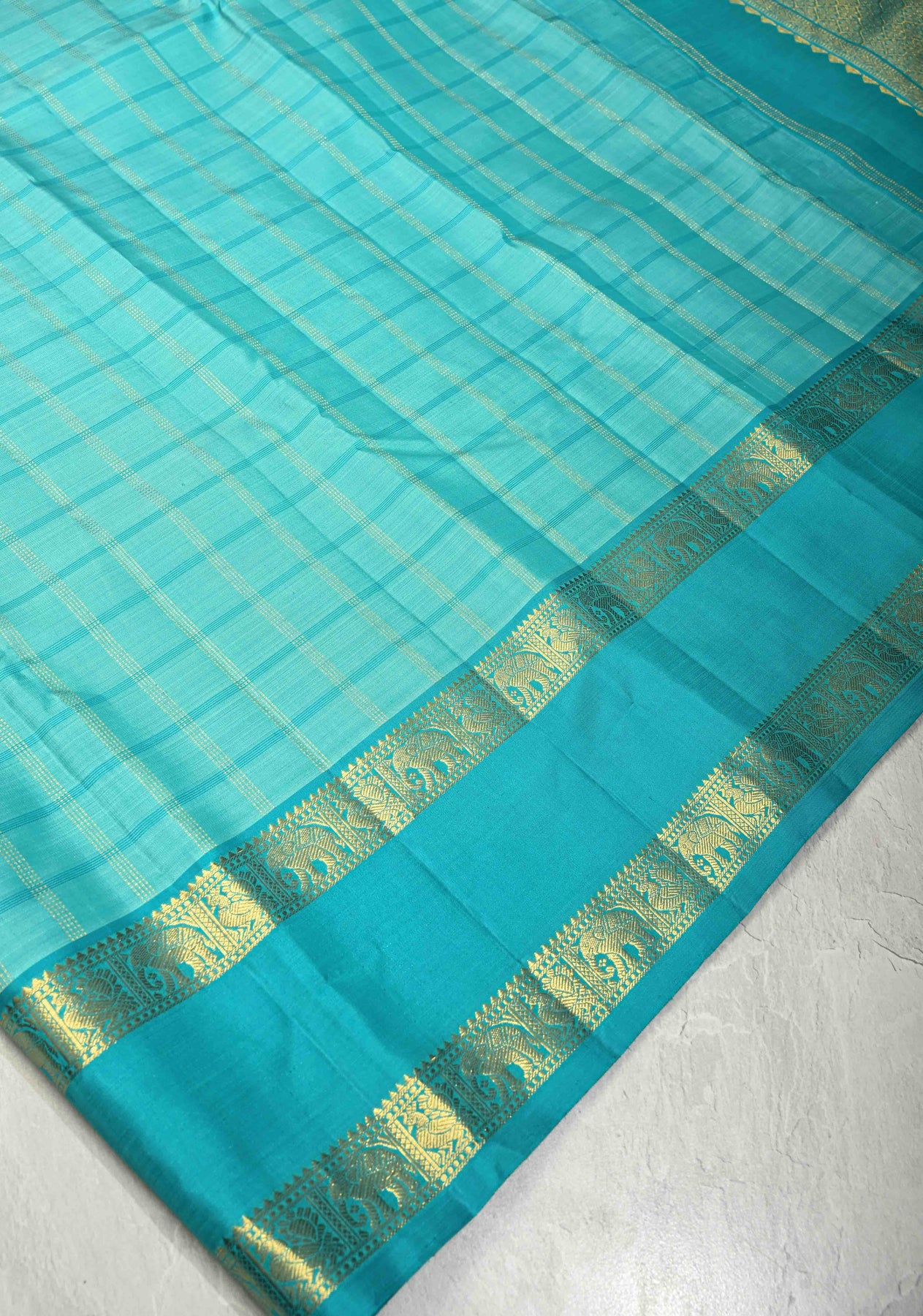 Turquoise Kanjivaram Pure Silk Saree with Zari Checks and Rettaipet Zari Border | SILK MARK CERTIFIED