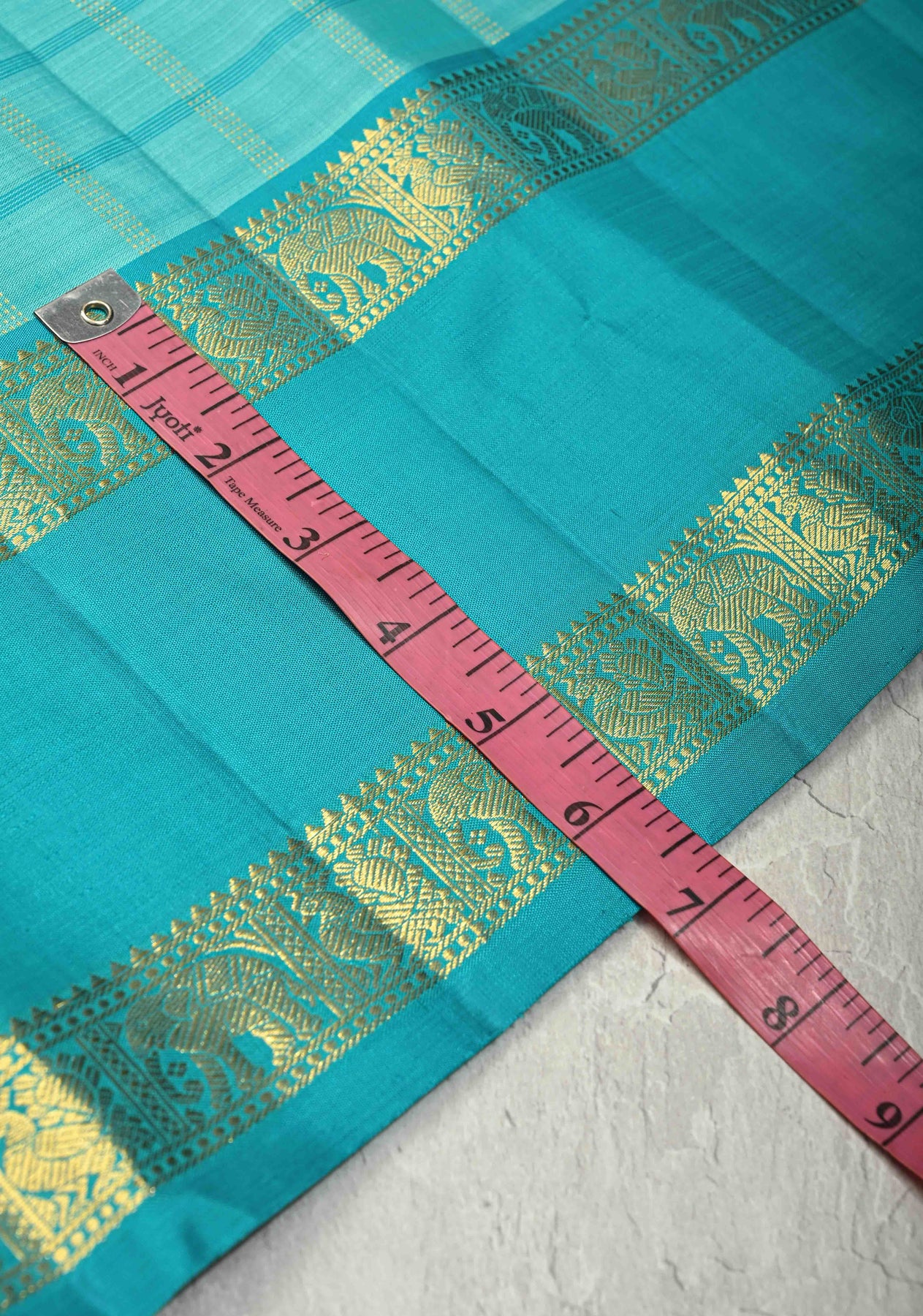 The turquoise body is adorned with classic zari checks, adding a sophisticated shimmer and timeless appeal. Complementing the design is a Rettaipet zari border, which enhances the saree’s elegance and brings a striking contrast to the overall look. A must-have for those who appreciate heritage artistry with modern styling.