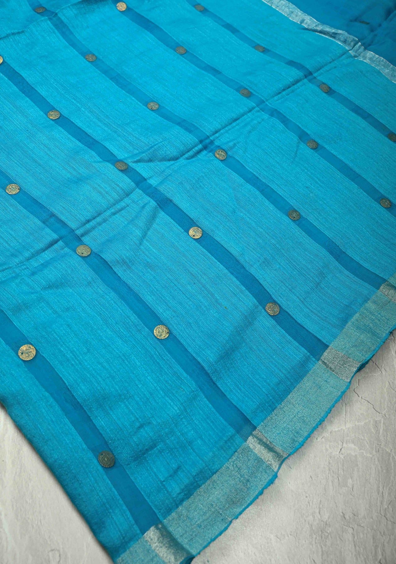 Delicate coin interweave detailing adds a subtle shimmer, enhancing the saree’s luxurious appeal. The serene turquoise hue brings freshness and vibrancy, making it ideal for festive occasions, formal gatherings, or cultural events. Lightweight, breathable, and effortlessly graceful, this saree is a timeless addition to any elegant wardrobe