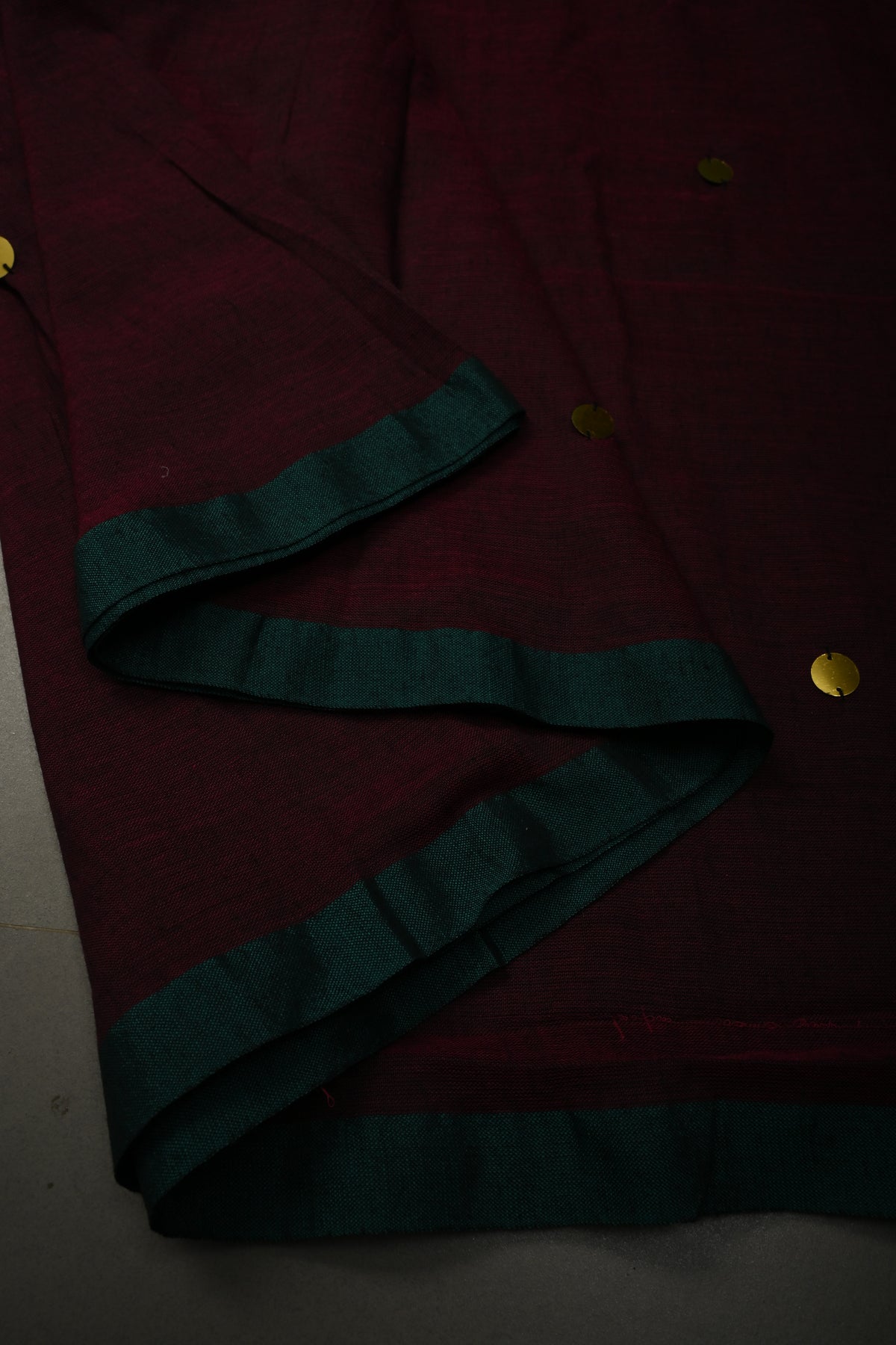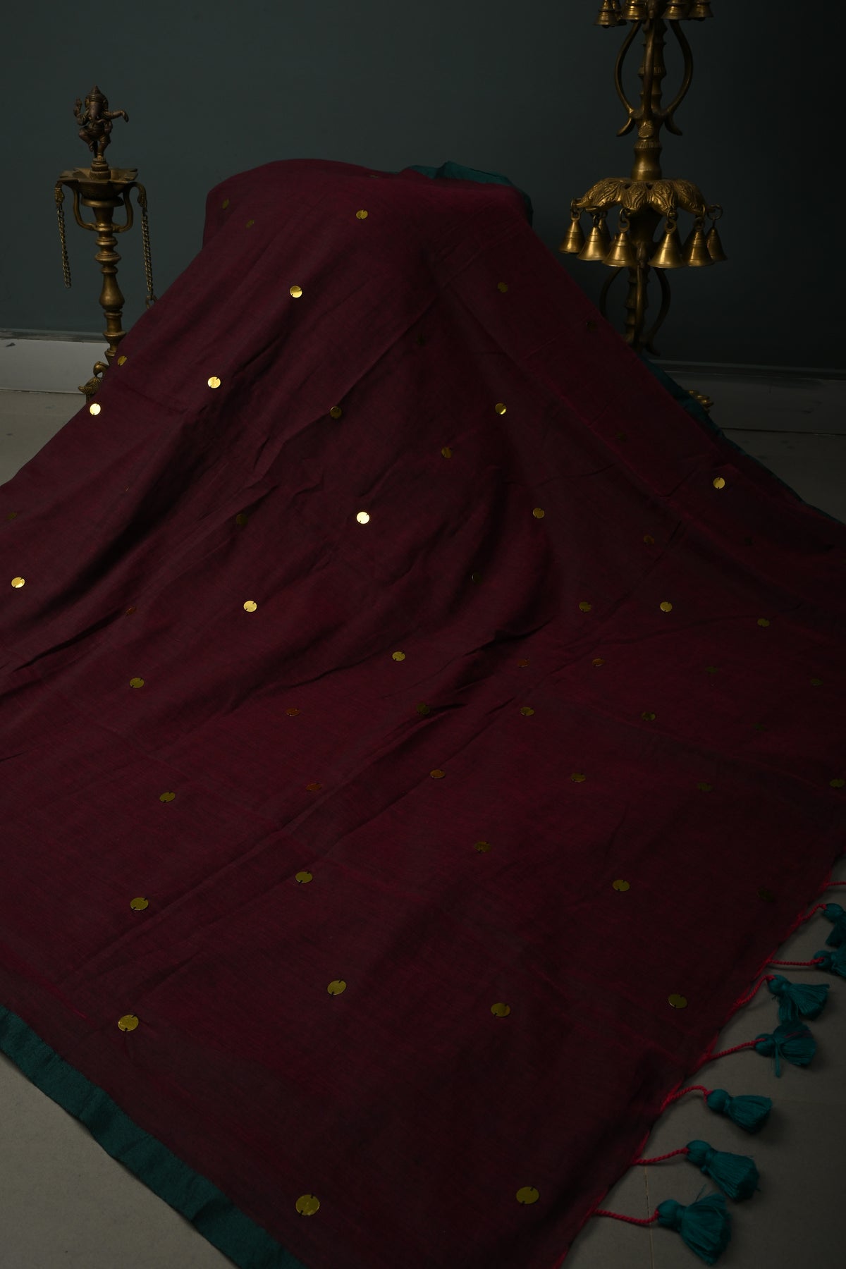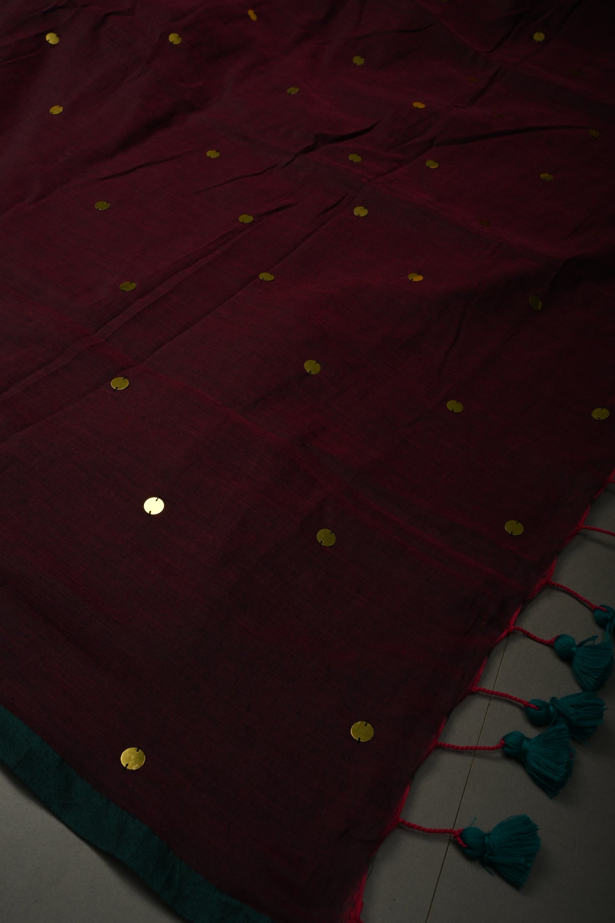 The Tyrian Purple Mercerized Mul Cotton Saree exudes royalty and elegance, perfect for making a statement at any special occasion. Made from mul cotton, it offers a soft, breathable texture that ensures comfort throughout the day. The rich Tyrian purple hue adds depth and grandeur, while the intricate Tikki work along the borders adds a touch of tradition and craftsmanship. Long, flowing tassels at the pallu give the saree a refined, graceful finish. Ideal for weddings, festive gatherings, and cultural celebrations, this saree seamlessly combines comfort, style, and timeless beauty.