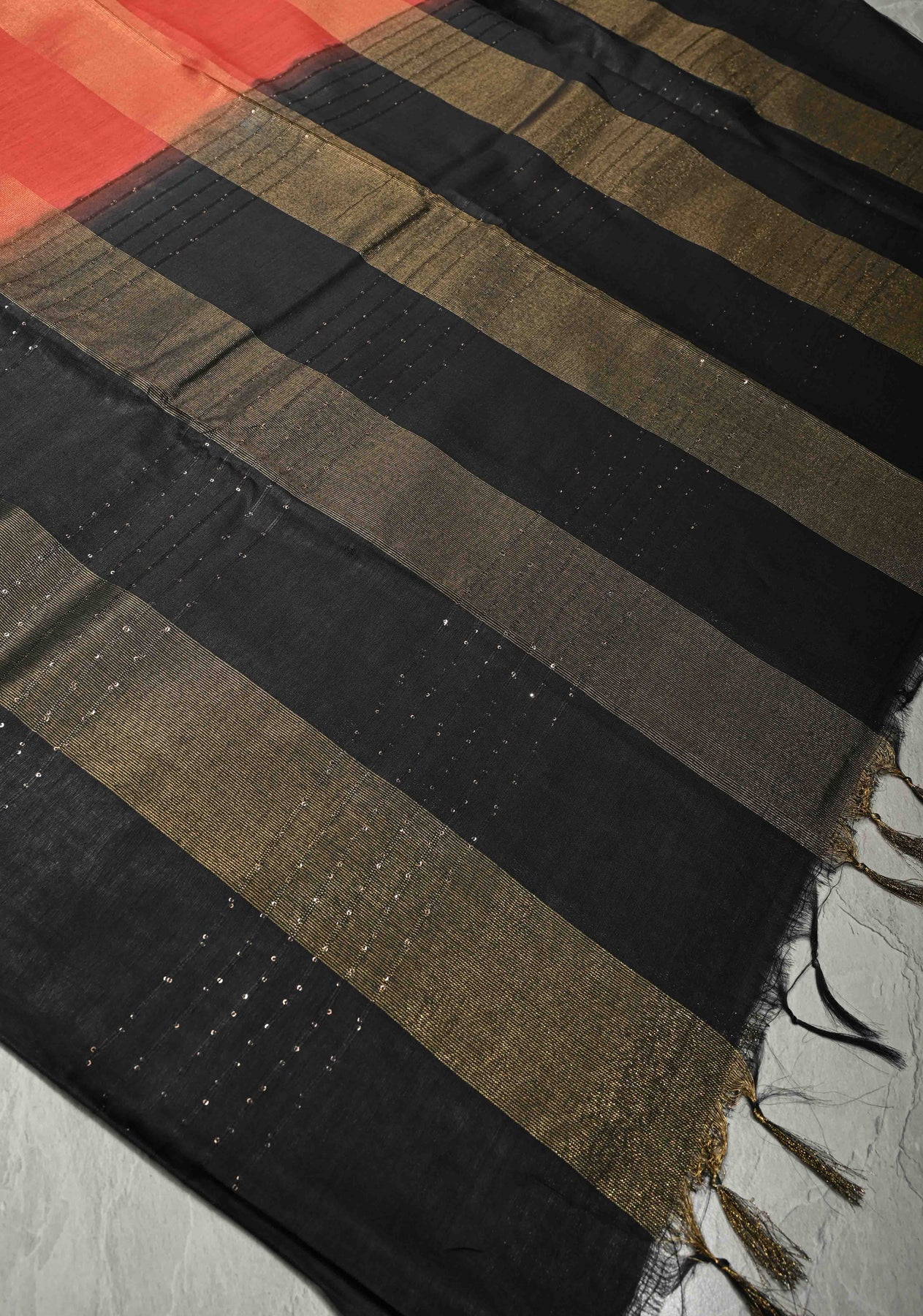 Vermilion Red Borderless Semi Tussar Saree with Muted Tissue Panel and Contrast Sequins Pallu
