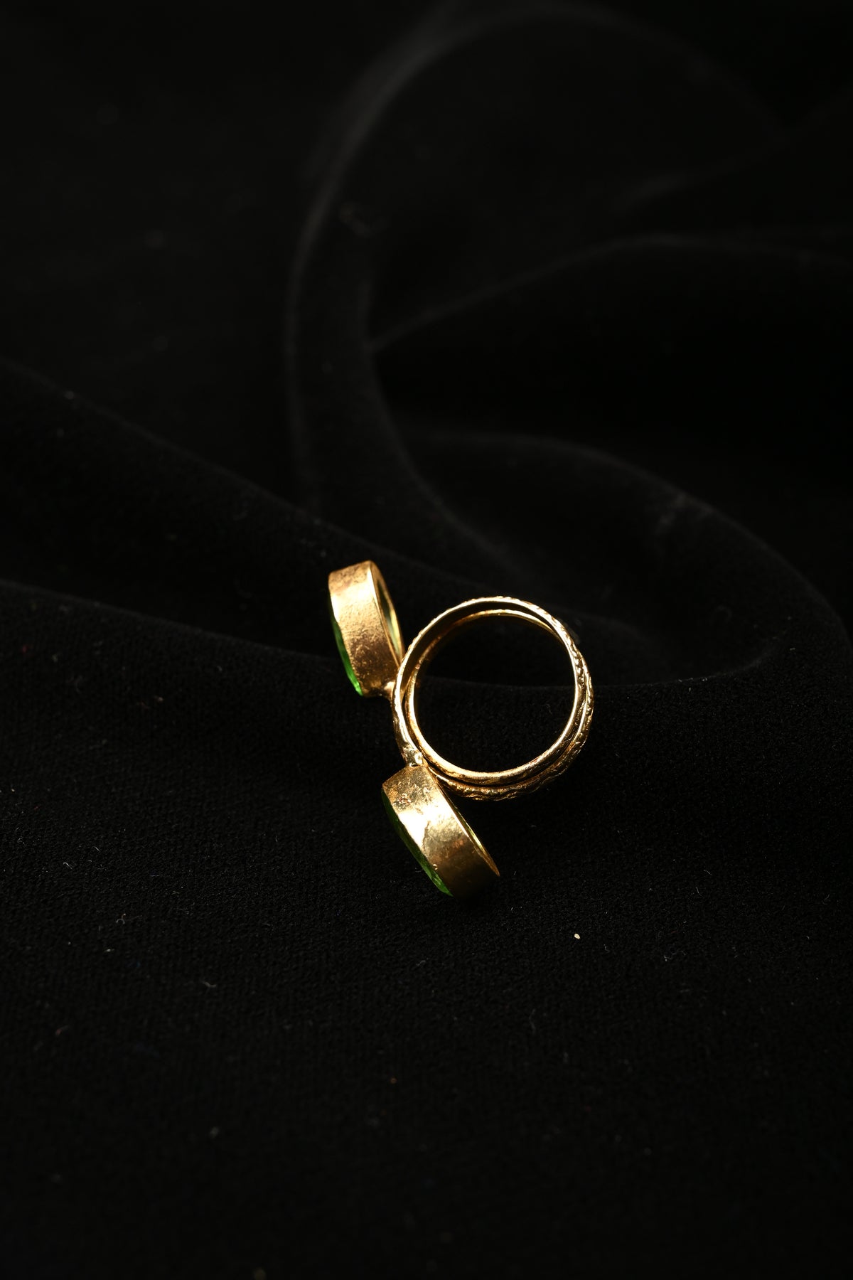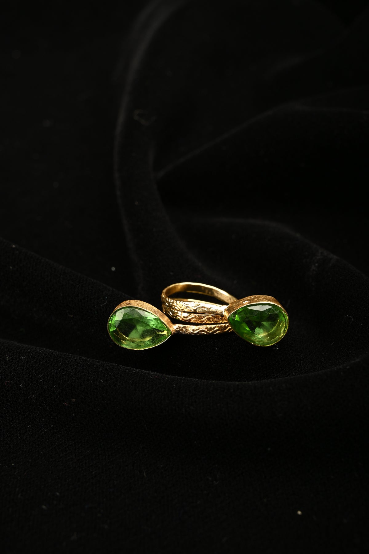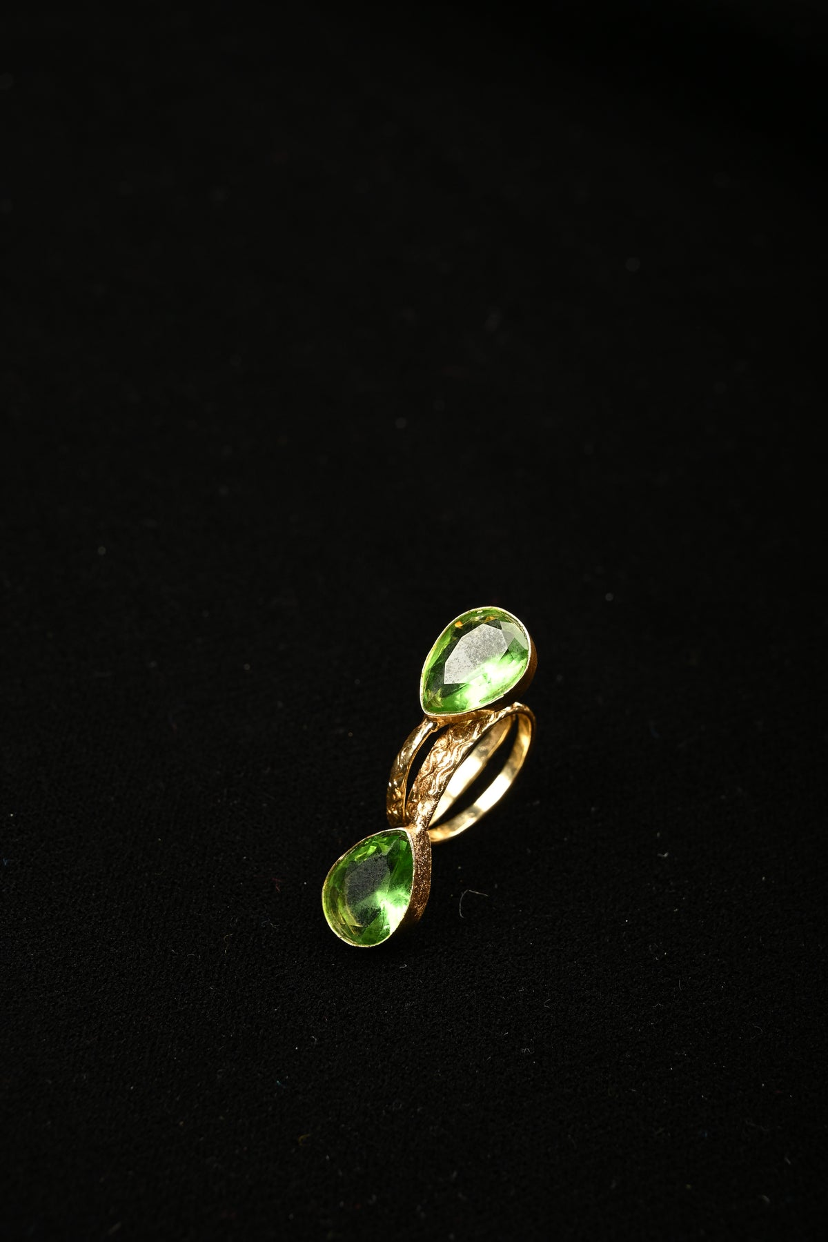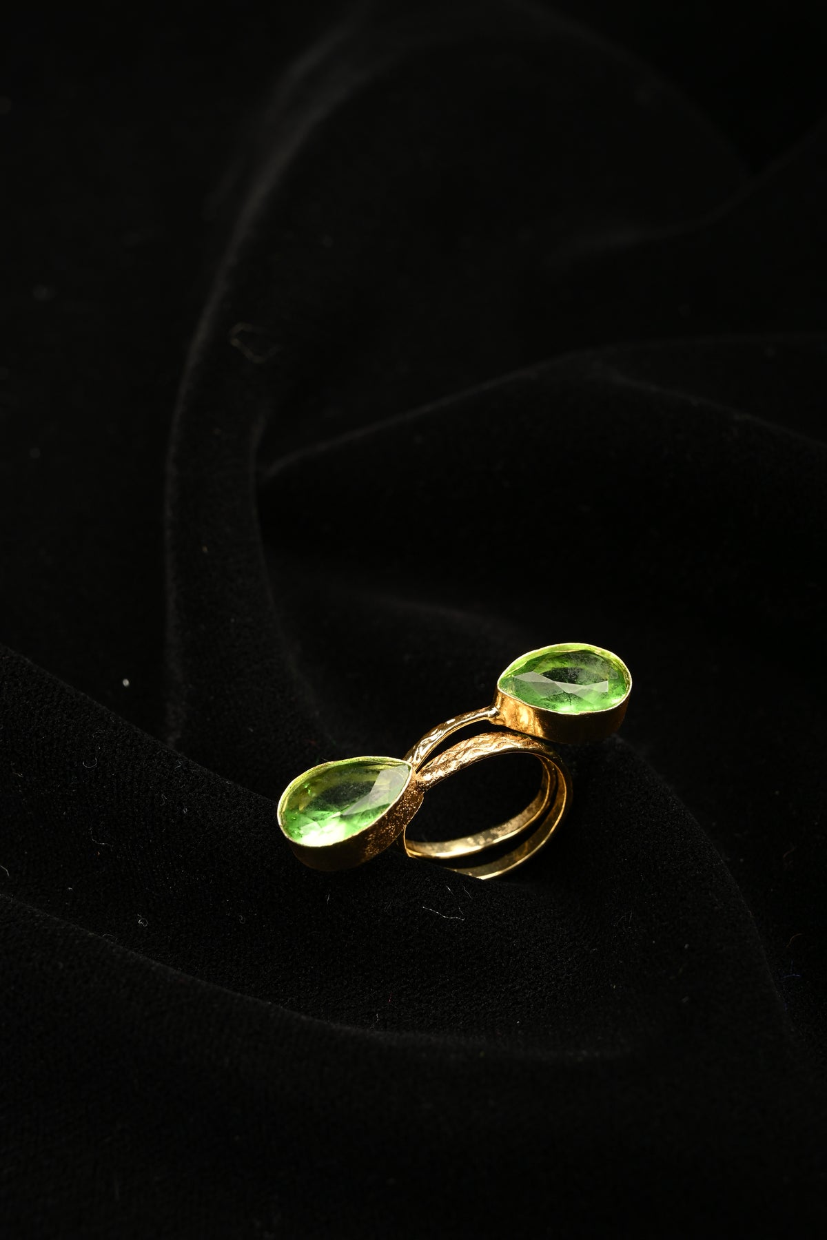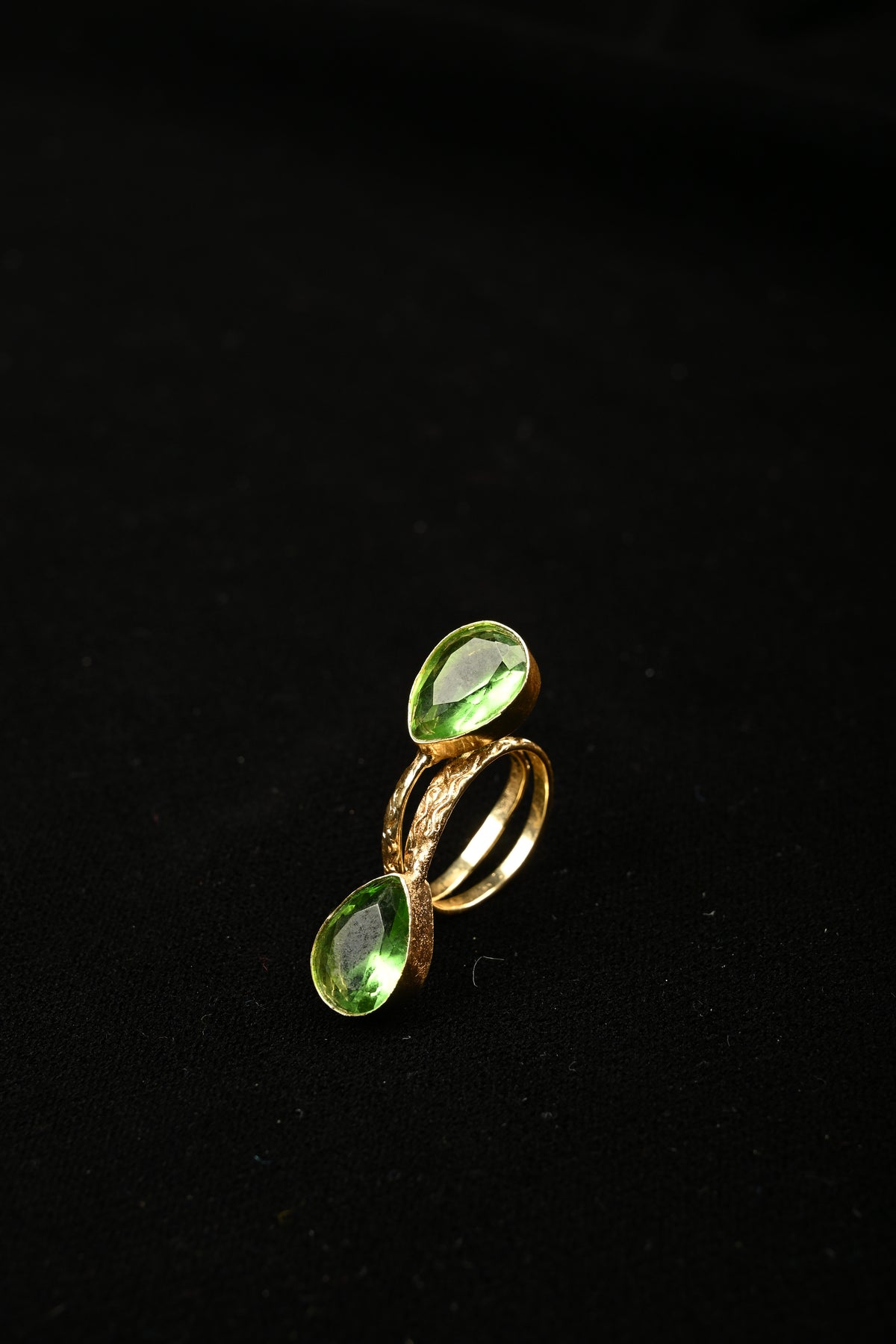 Eye-catching adjustable double-ring design featuring twin pear-shaped peridot stones connected by delicate brass links, set in polished brass for a modern boho aesthetic. The open adjustable band fits sizes comfortably across multiple fingers, perfect for stacking, daily wear, or as a bold statement on index/middle fingers.