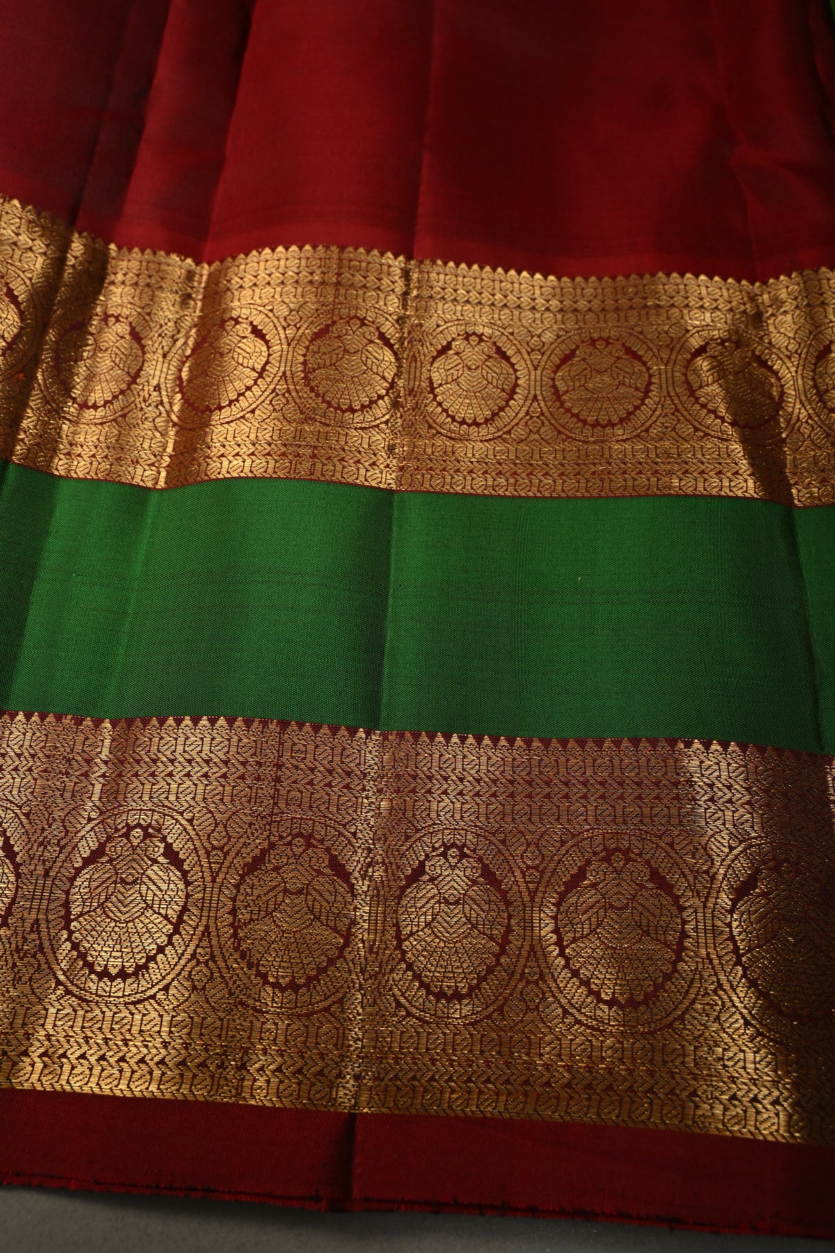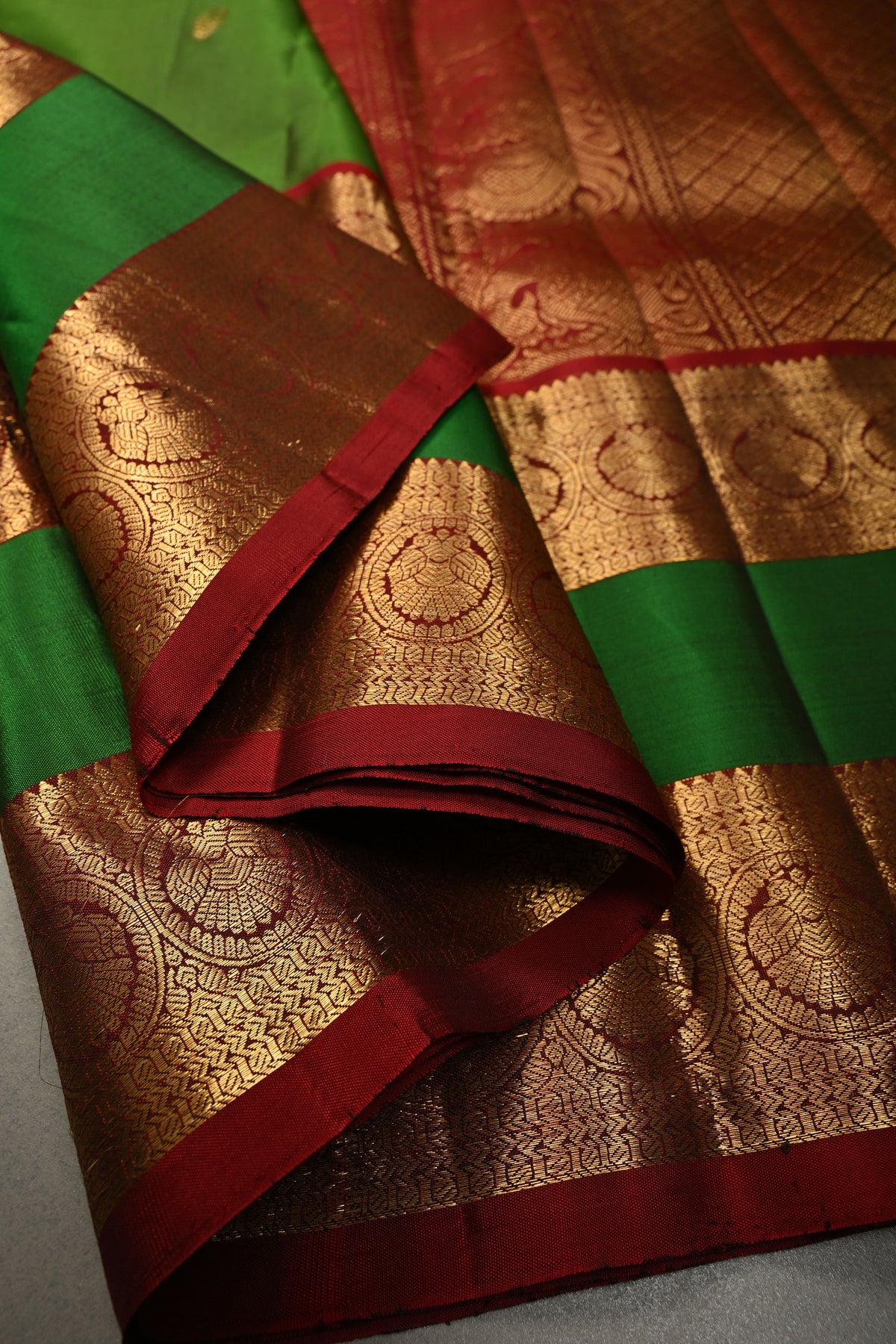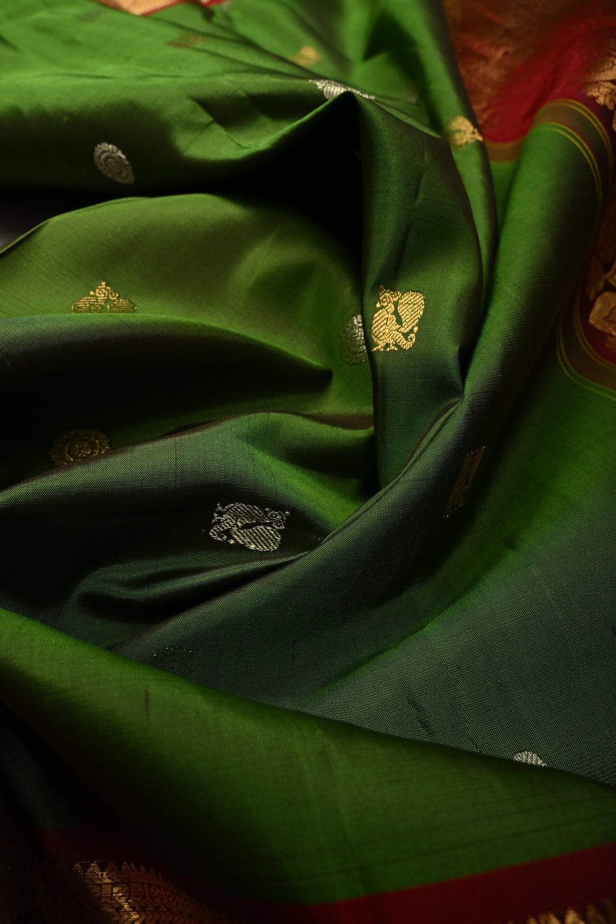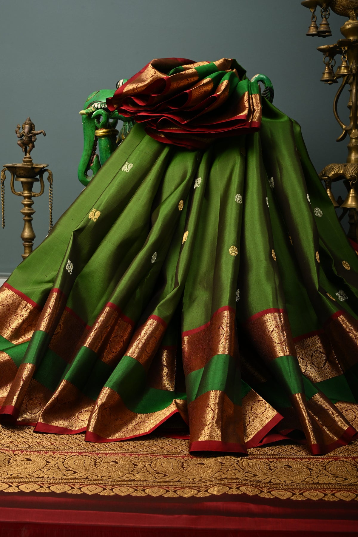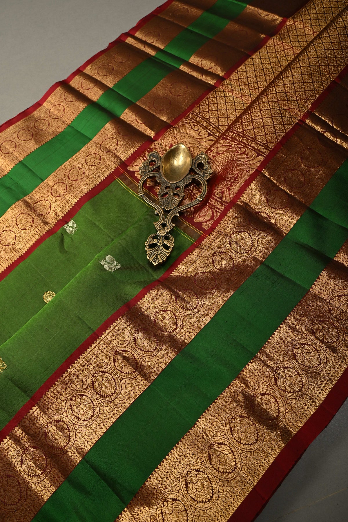 The Vibrant Green hue exudes sophistication, while intricate gold and silver zari buttas across the body add a subtle shimmer, perfect for weddings, festivals, and special celebrations. The Rettaipet zari border enhances the saree’s grandeur, providing a regal contrast that elevates its overall charm.