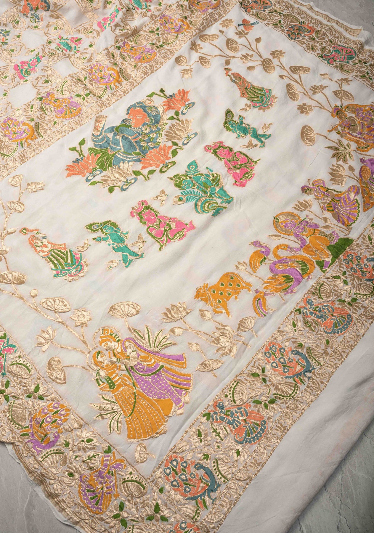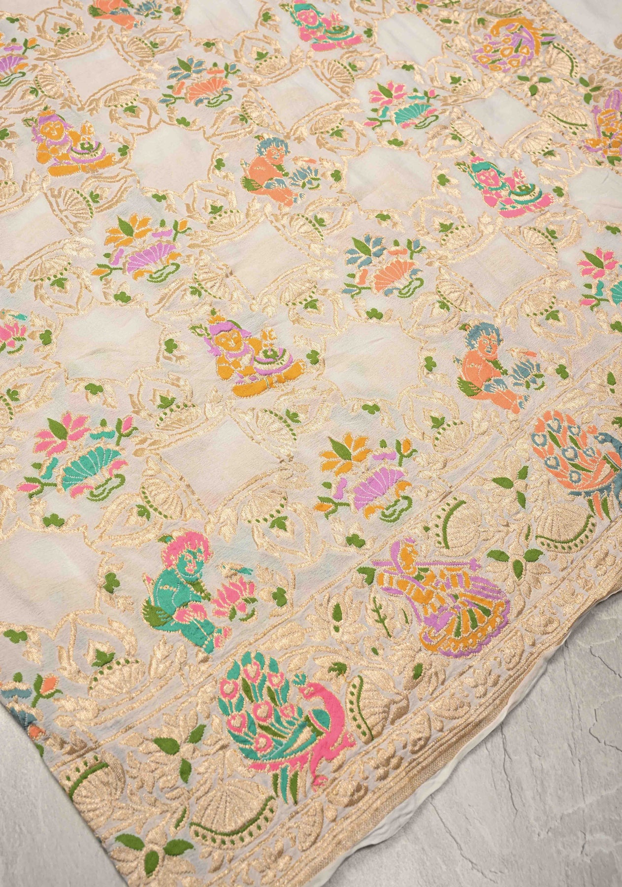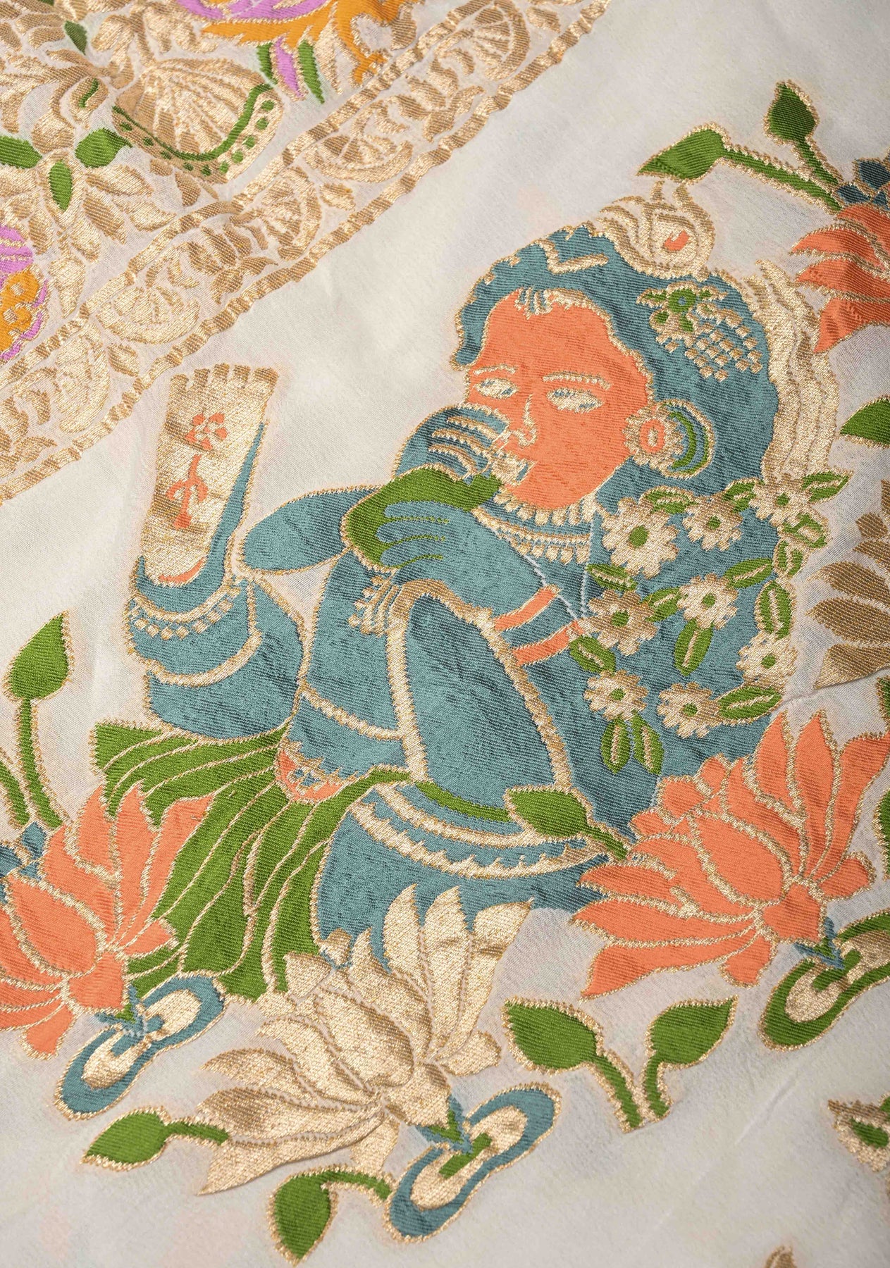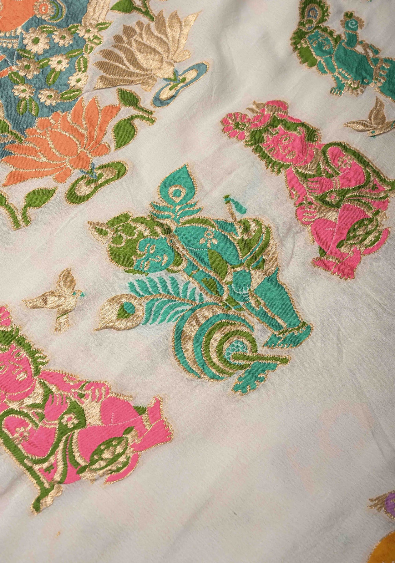 Graceful and spiritually inspired, this White Georgette Saree beautifully blends devotion with delicate artistry. The soft, flowy georgette fabric provides an ethereal drape, making it perfect for both festive and serene occasions. Adorned with intricate Meenakari Laddu Gopal motifs, the saree evokes divine charm, while the finely woven floral designs add elegance and a touch of nature’s beauty. Lightweight and breezy, it offers comfort without compromising on visual appeal. Ideal for religious events, spiritual gatherings, or unique festive wear, this saree is a symbol of tradition, artistry, and devotion woven into a timeless white canvas