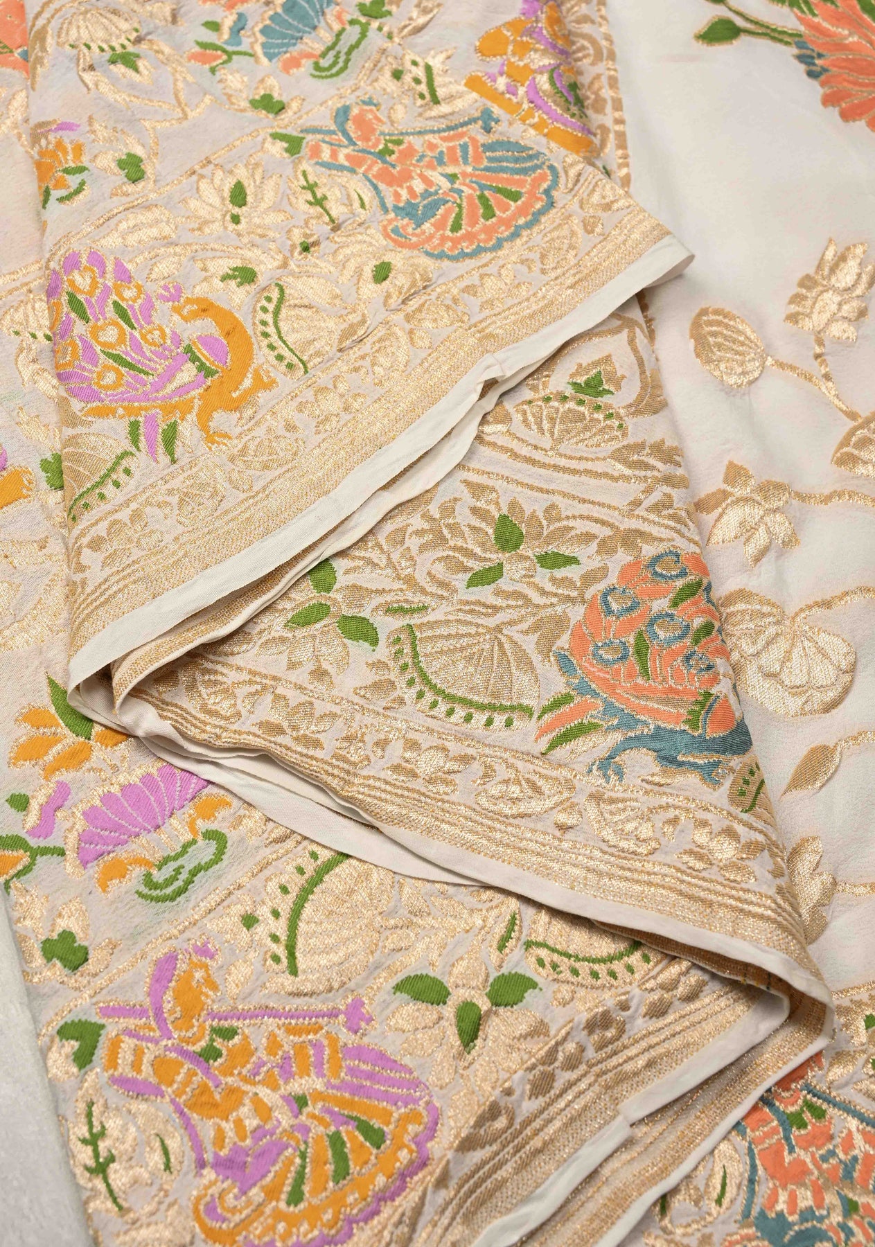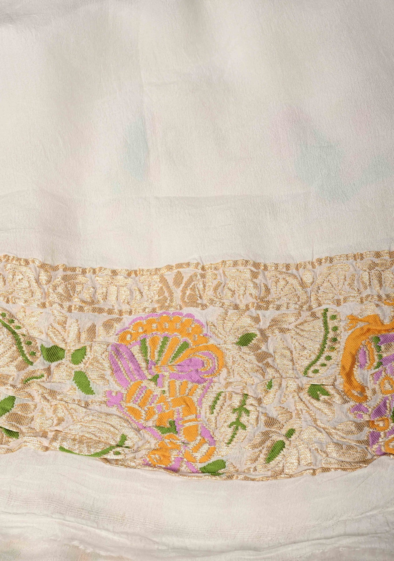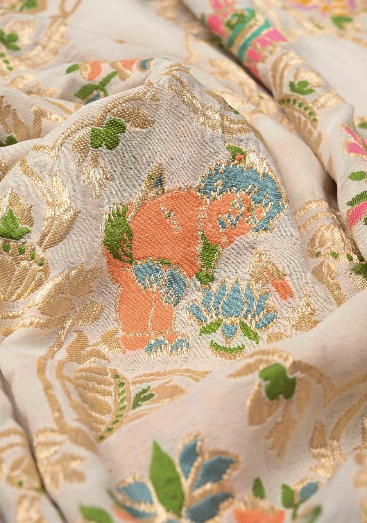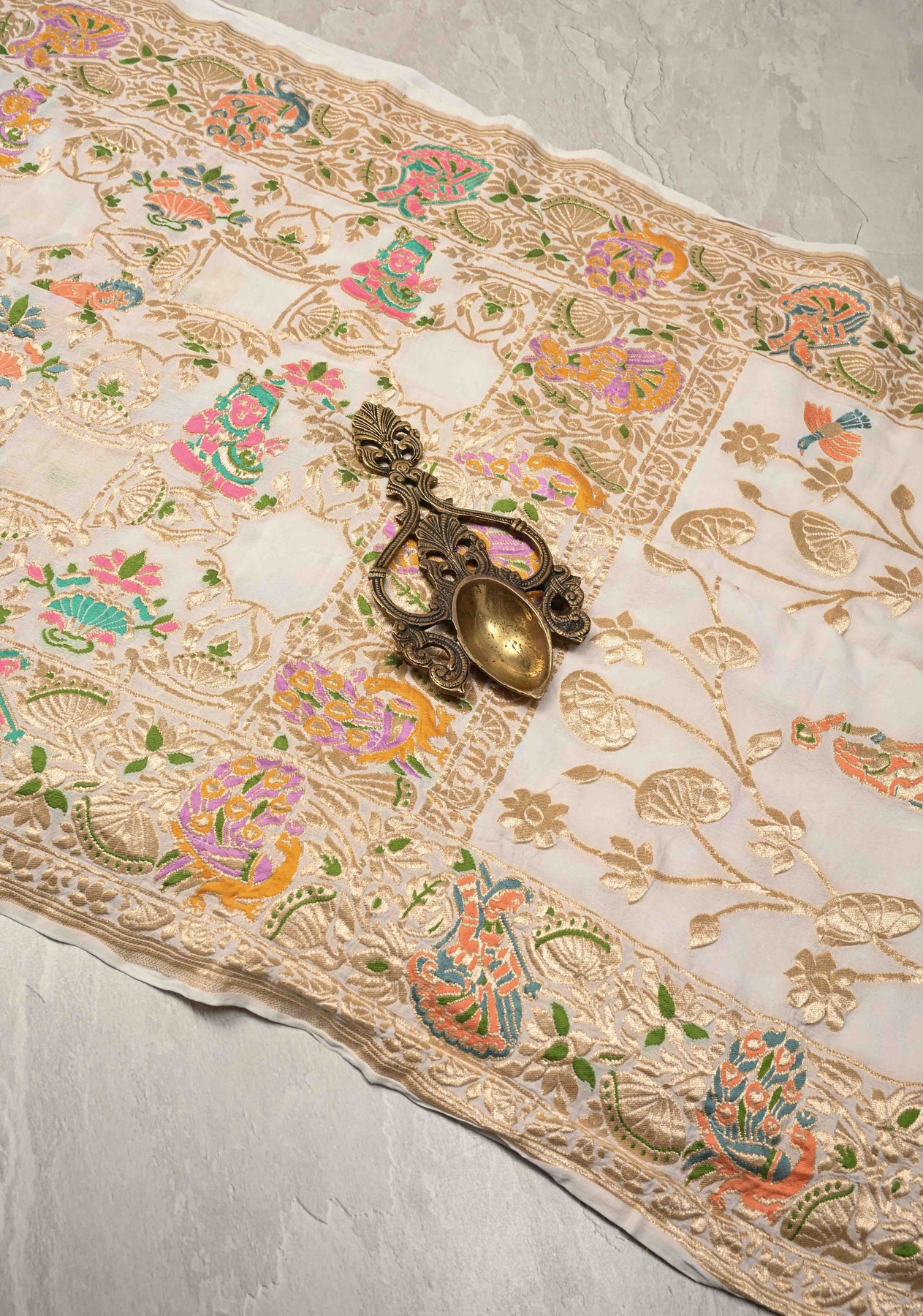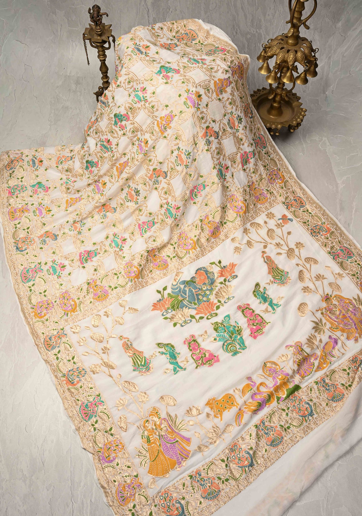 Graceful and spiritually inspired, this White Georgette Saree beautifully blends devotion with delicate artistry. The soft, flowy georgette fabric provides an ethereal drape, making it perfect for both festive and serene occasions. Adorned with intricate Meenakari Laddu Gopal motifs, the saree evokes divine charm, while the finely woven floral designs add elegance and a touch of nature’s beauty. Lightweight and breezy, it offers comfort without compromising on visual appeal. Ideal for religious events, spiritual gatherings, or unique festive wear, this saree is a symbol of tradition, artistry, and devotion woven into a timeless white canvas