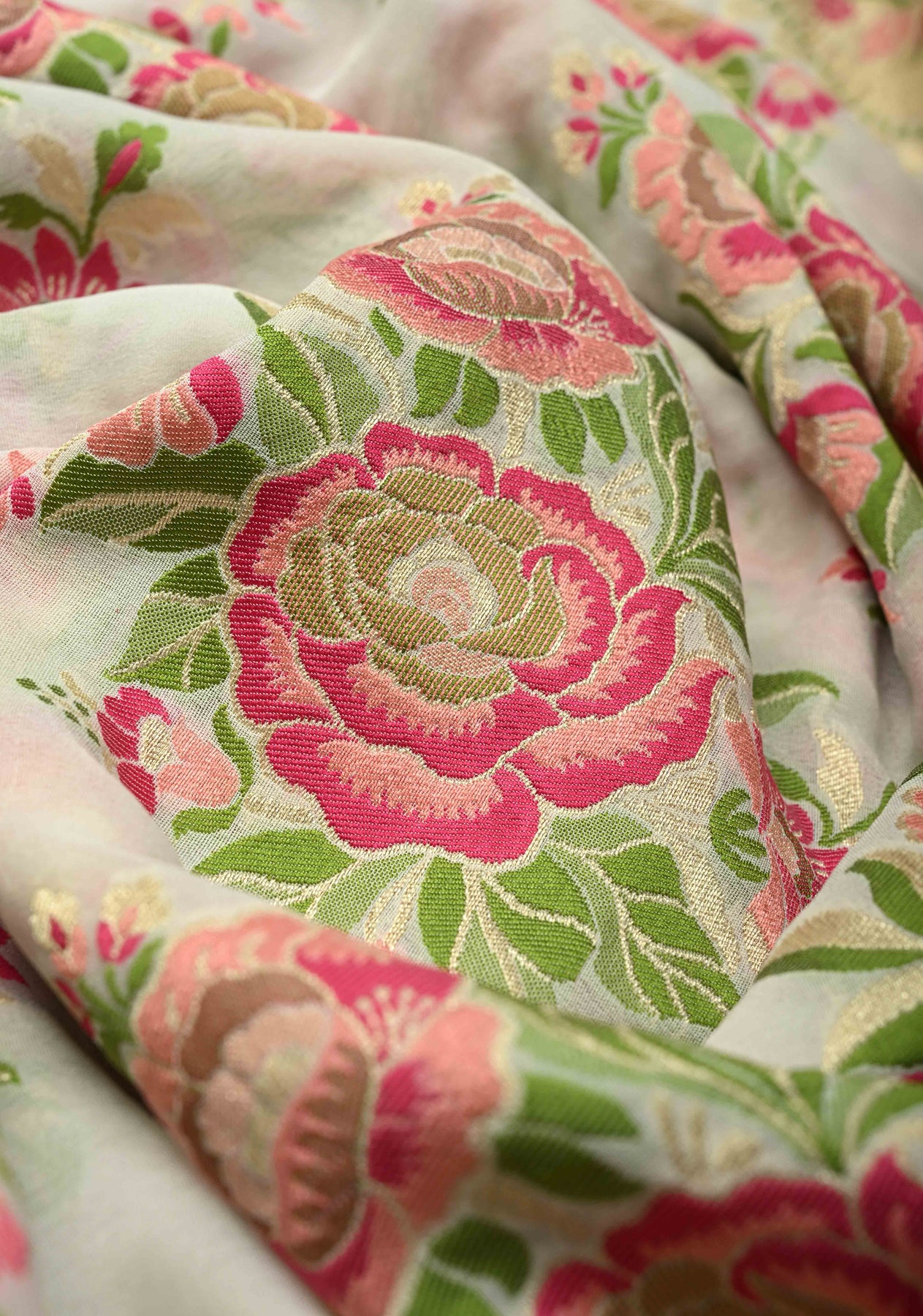 This White Pure Banarasi Georgette Silk Saree is a true embodiment of grace and timeless beauty. Woven with delicate meenakari rose buttas, the saree showcases intricate floral motifs that add a touch of romantic elegance to its serene white base. Crafted from premium georgette silk, it offers a soft, flowing drape that enhances both comfort and sophistication. The shimmering zari border frames the saree with a regal finish, lending a subtle richness that makes it perfect for weddings, festive celebrations, or special occasions. A harmonious blend of tradition and refinement, this saree is a must-have for the modern woman with a love for classic artistry.