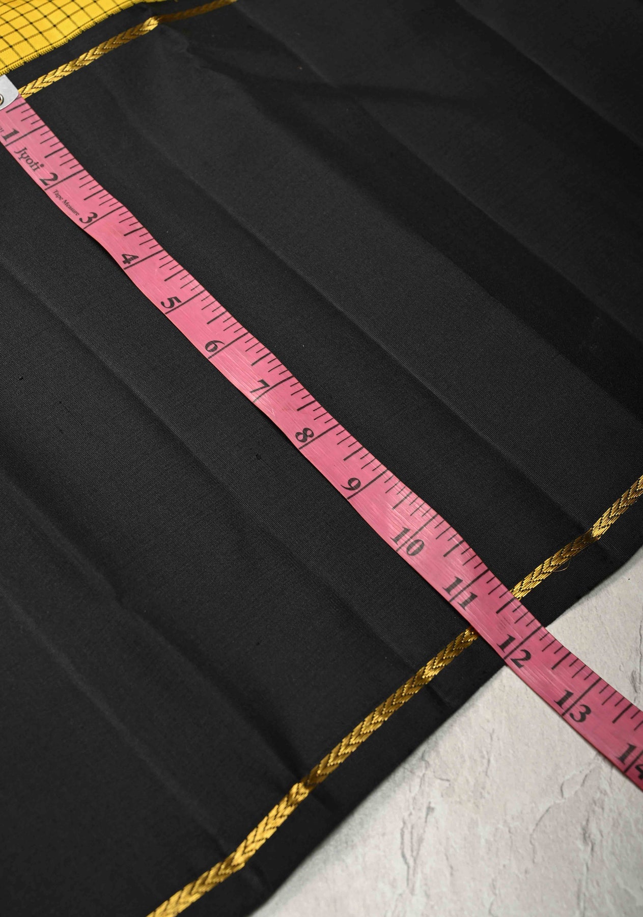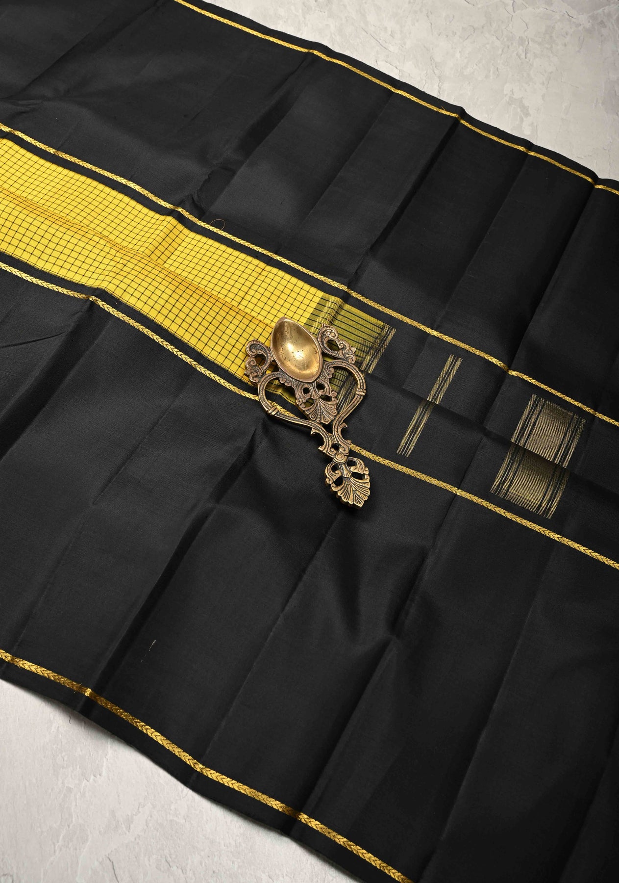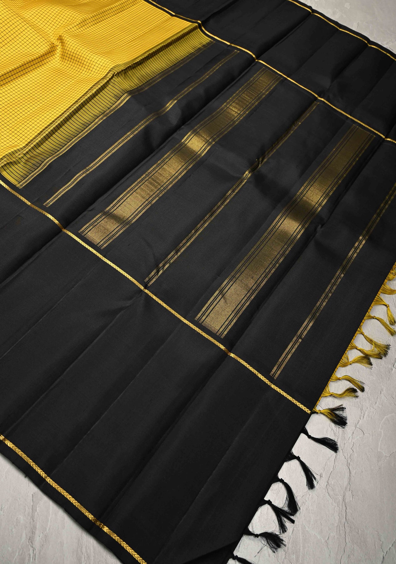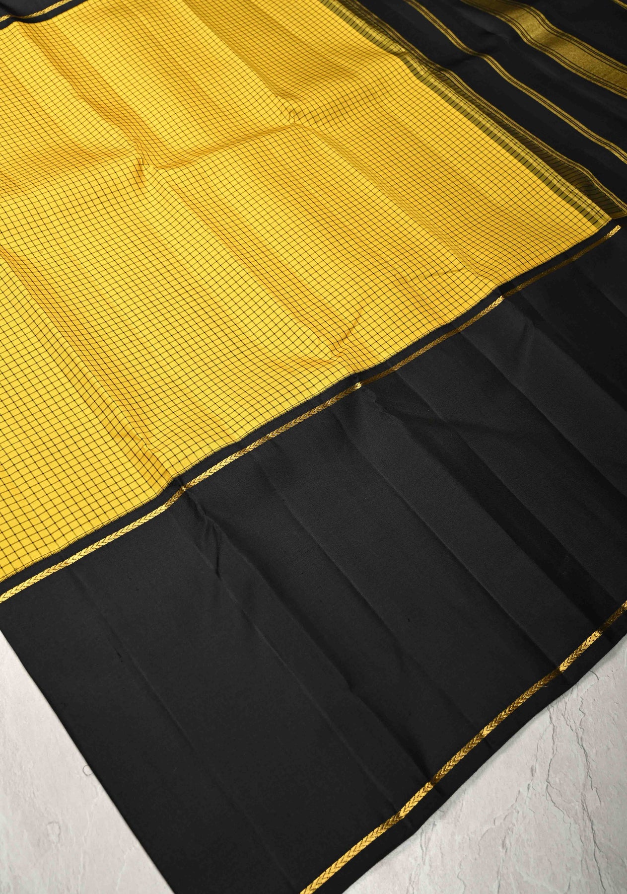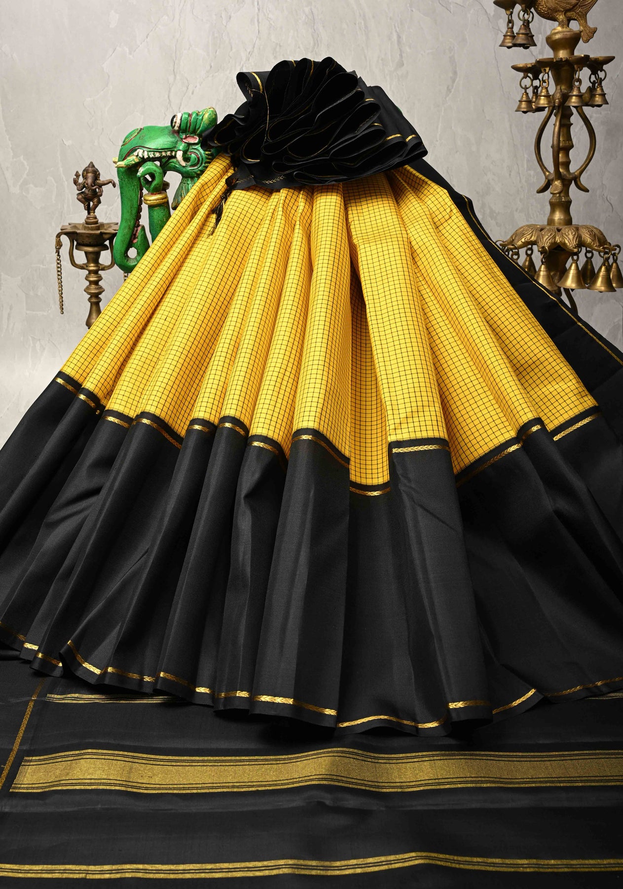 Make a bold and beautiful statement with this stunning Yellow Kanjivaram Pure Silk Saree, thoughtfully designed to blend tradition with contemporary charm. Crafted from luxurious pure silk, the saree features a classic checks pattern that adds depth and texture to its vibrant yellow body. The eye-catching contrast black skirt border enhances its elegance, adorned with intricate zari work that highlights the finesse of Kanjivaram weaving. Ideal for festive celebrations, traditional functions, or special occasions, this saree strikes the perfect balance between timeless craftsmanship and modern aesthetics. Drape yourself in heritage and sophistication with this radiant masterpiece.