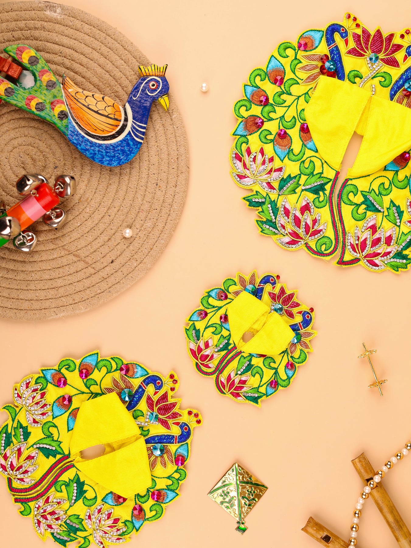 This vibrant yellow poshak featuring a beautifully hand-embroidered backdrop of blooming lotuses, dancing peacocks. The intricate “phool-chakra” halo adds a divine charm to your altar. This festive set brings Vrindavan’s beauty to your home with every darshan.