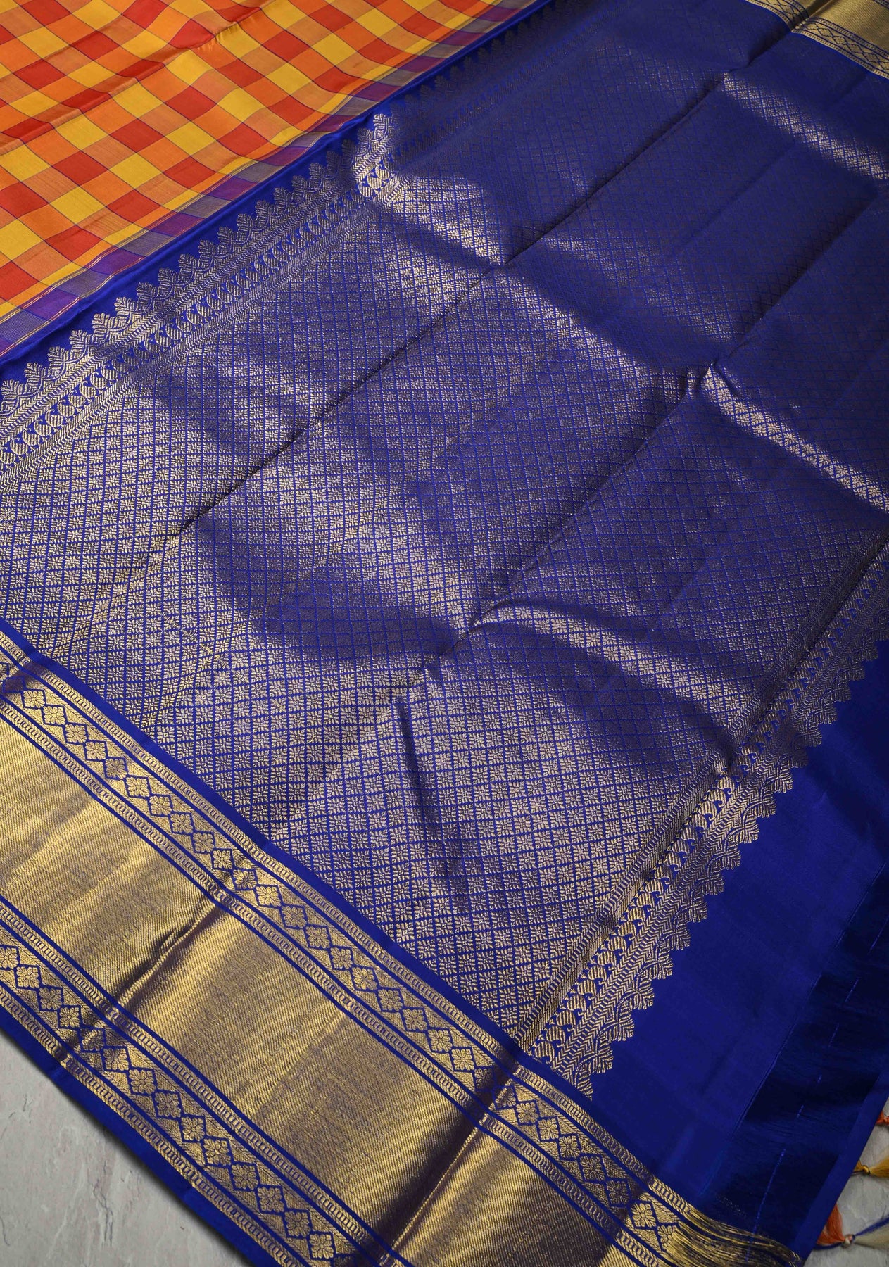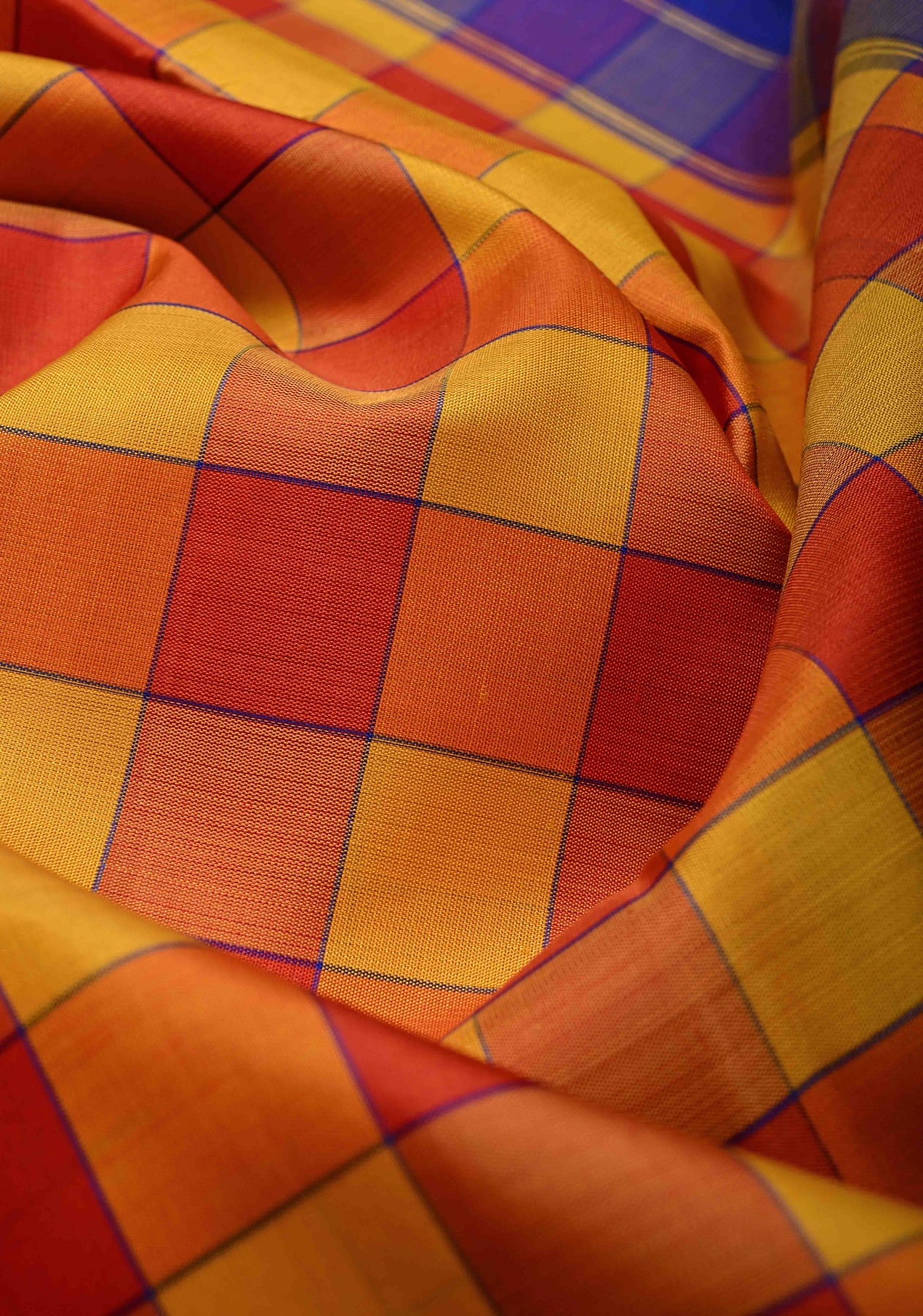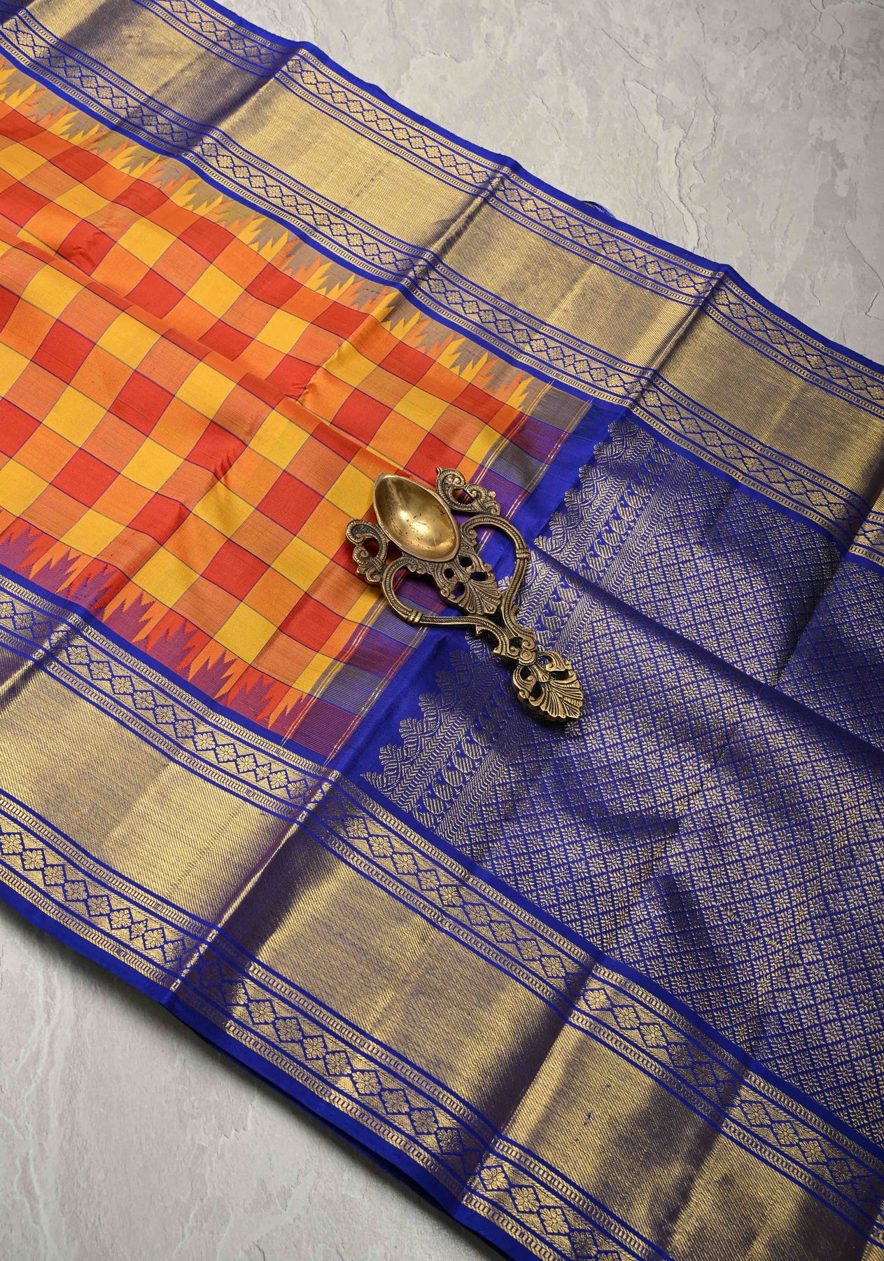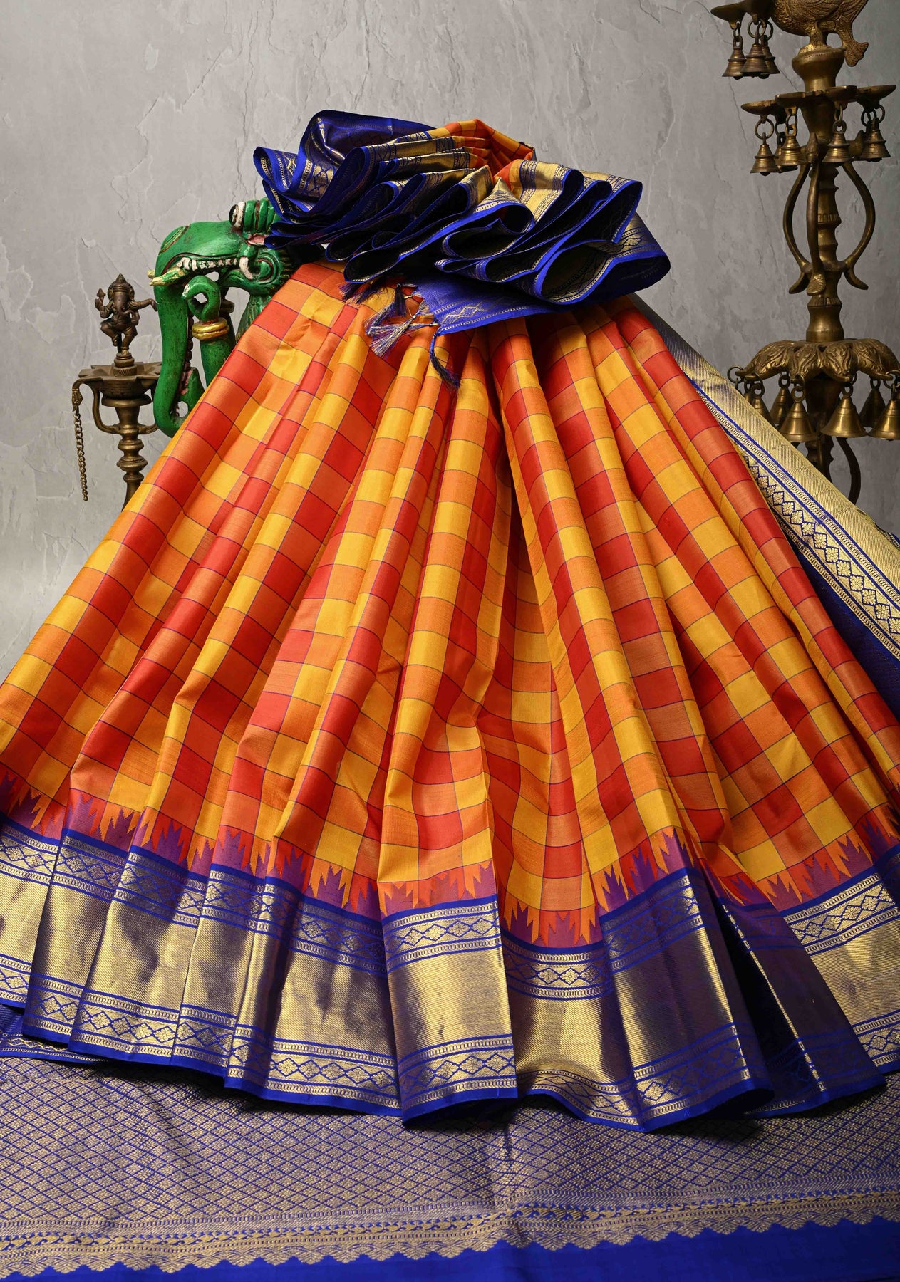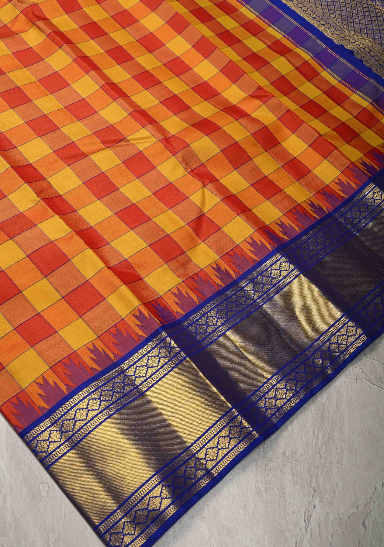 Yellow-Red Kanjivaram Pure Silk Saree with Checks Pattern and Contrast Temple Zari Border | SILK MARK CERTIFIED
