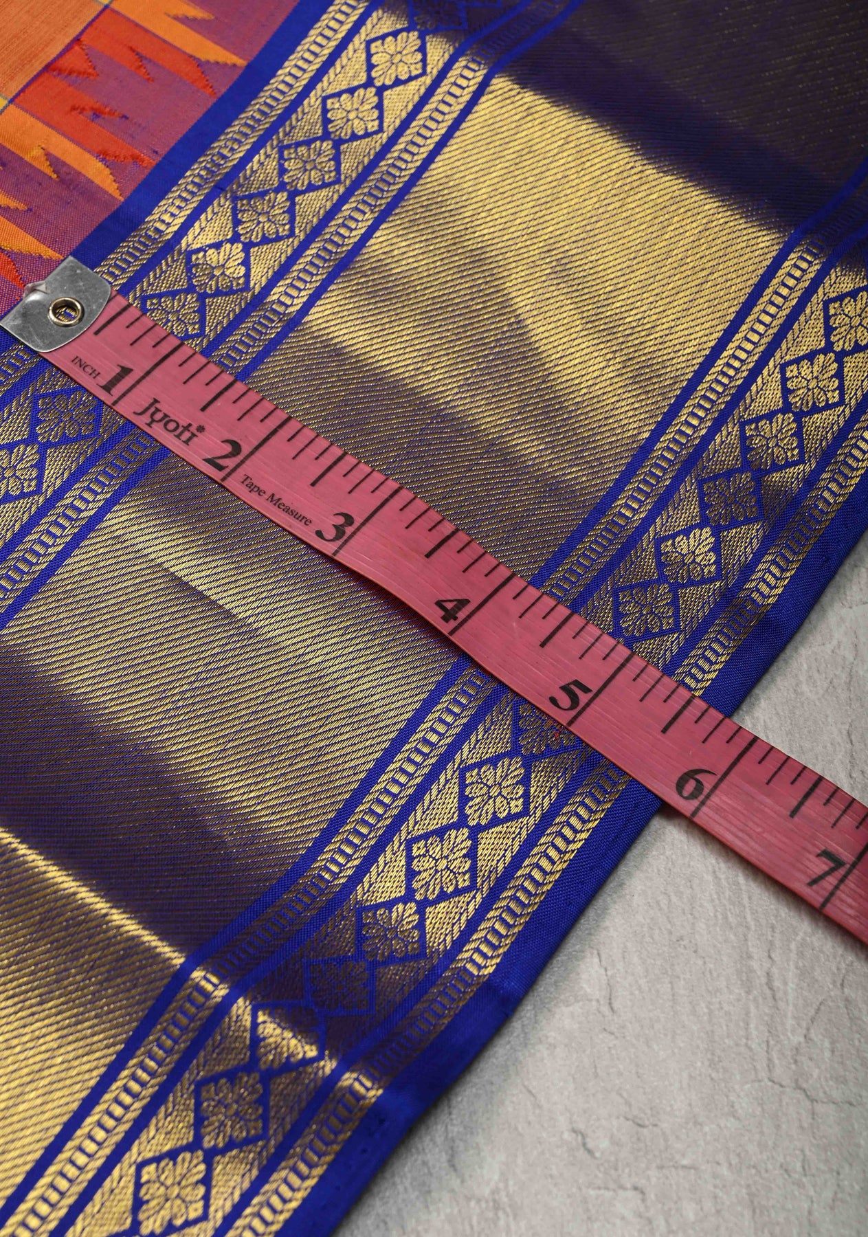The elegant contrast temple zari border, adorned with intricate temple motifs in shimmering gold zari, adds a majestic touch and honors South Indian heritage. The combination of bright yellow and rich red hues along with the contrasting border makes it perfect for weddings, festivals, and cultural celebrations.