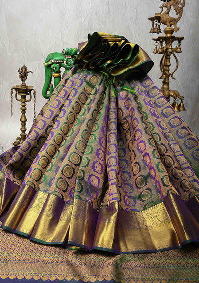 Brocade Kanjivaram Pure Silk Saree in Green Purple Dual Tone with Zari Border | SILK MARK CERTIFIED