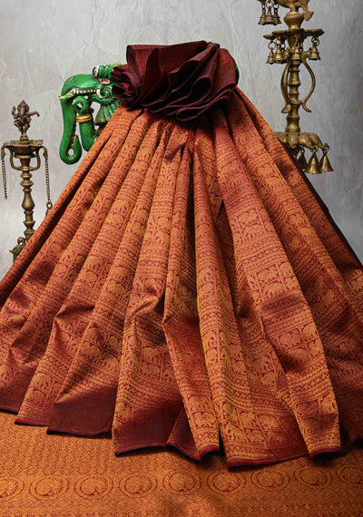 Exquisite Maroon Antique Zari Borderless Brocade Kanjivaram Pure Silk Saree with Peacock Elephant Motifs | SILK MARK CERTIFIED